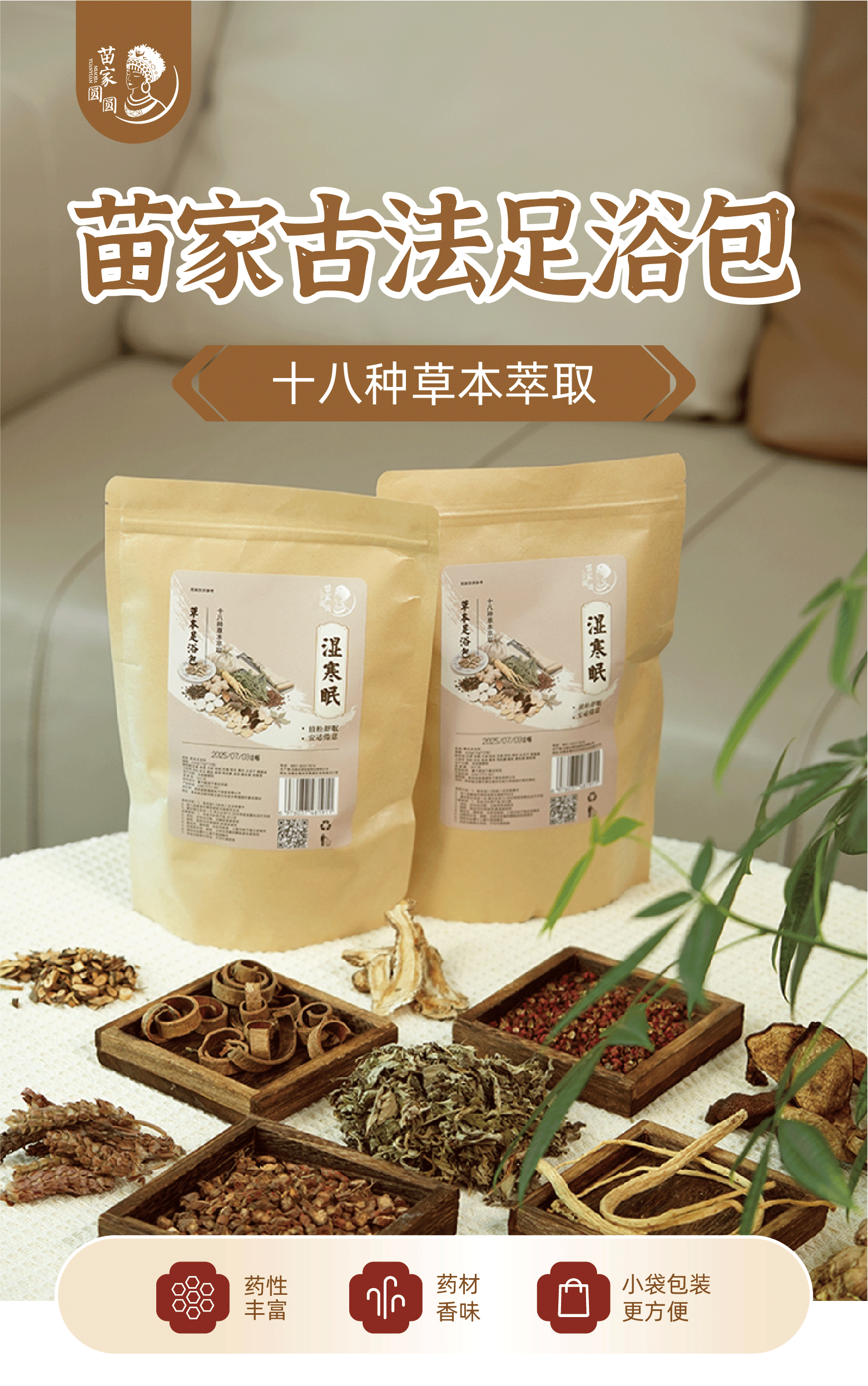 苗家圆圆草本足浴包 18味泡脚药包 艾草花椒生姜陈皮科学配比 祛寒排湿助睡眠 225g(15g*15包)顺丰包邮
