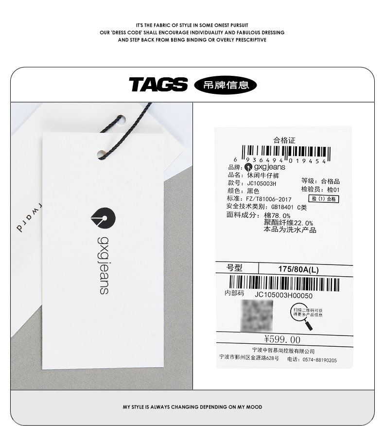 gxg.jeans男装牛仔裤男青年时尚直筒水洗基础休闲长裤潮JC105003H
