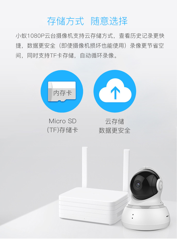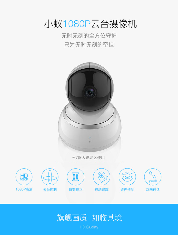- 小蚁智能摄像机——随意放置任意角落,通过手机或平板,随时随地视频观察家中情况。即使不在家,也可随时进行双向语音通话,远程与家人互动,抓拍欢乐瞬间,不错过任何精彩时刻。