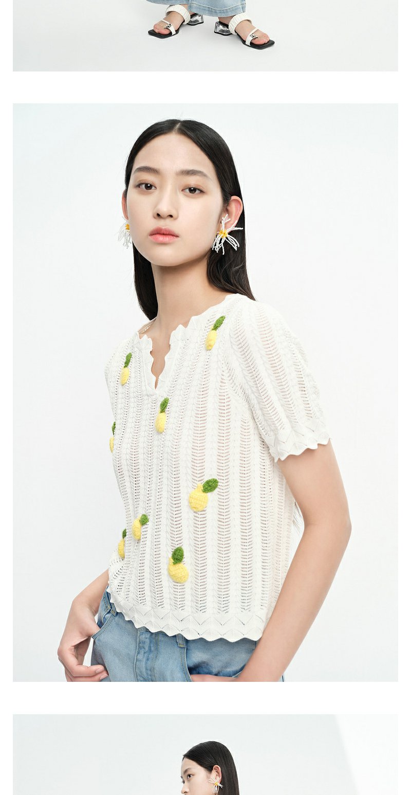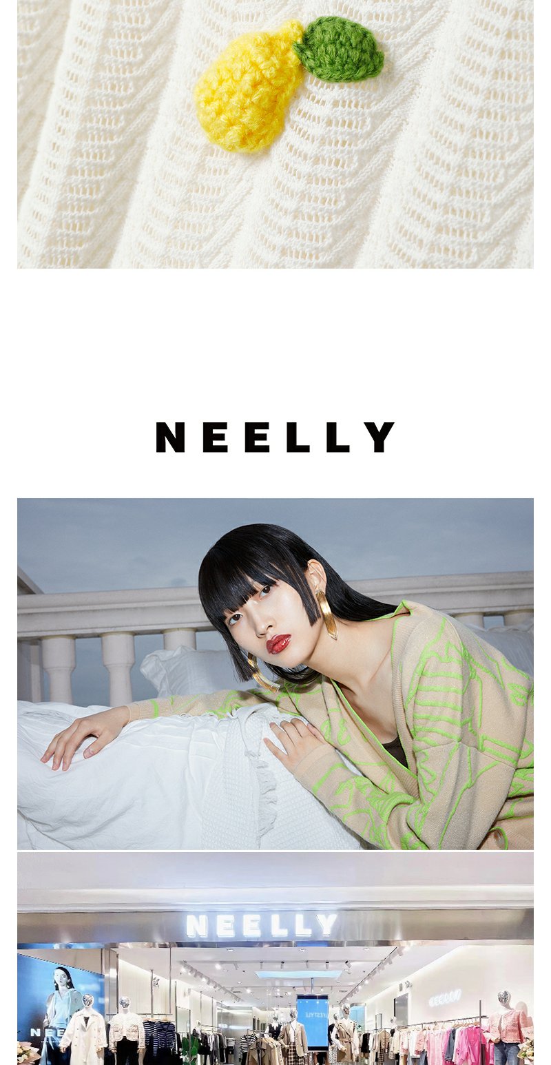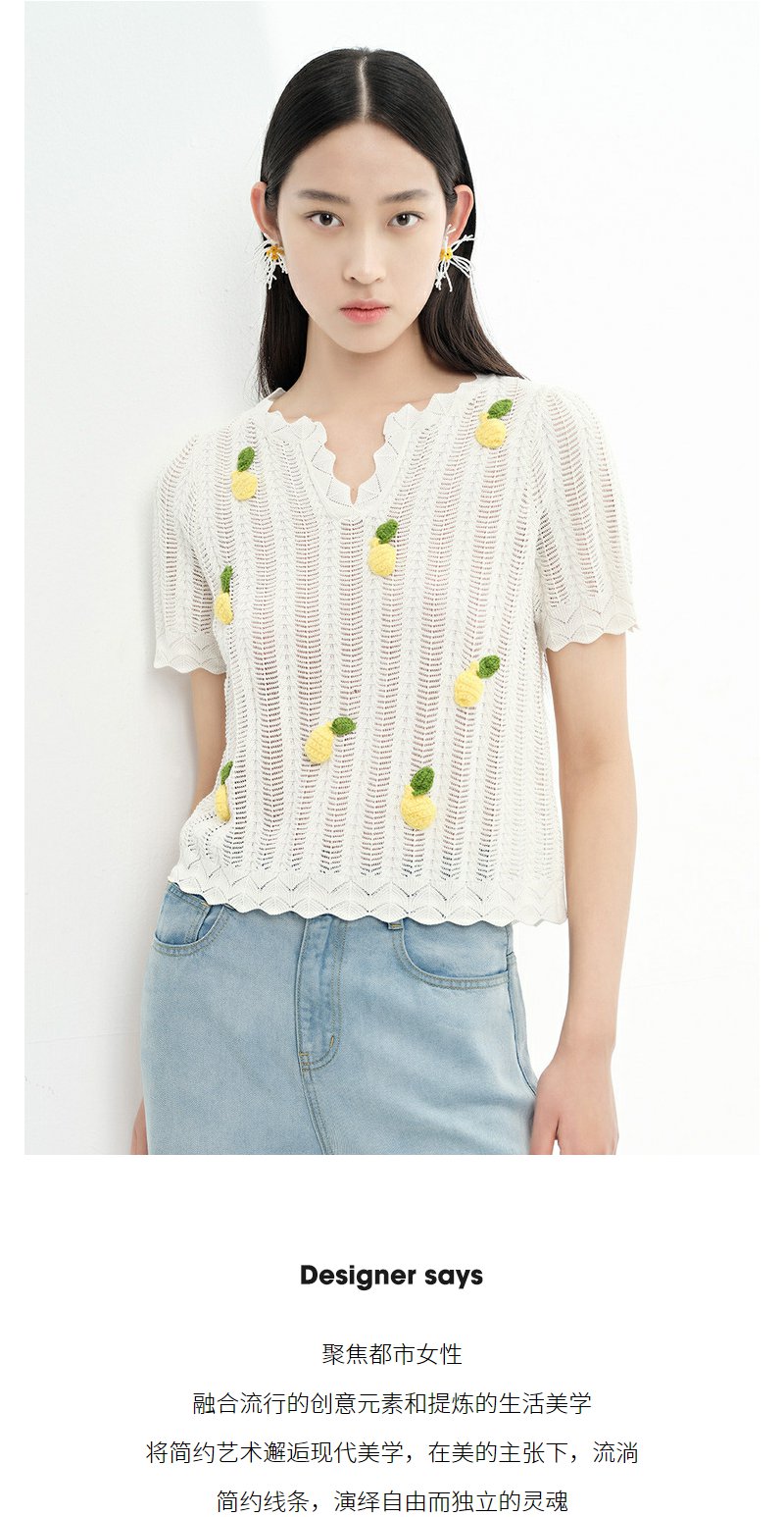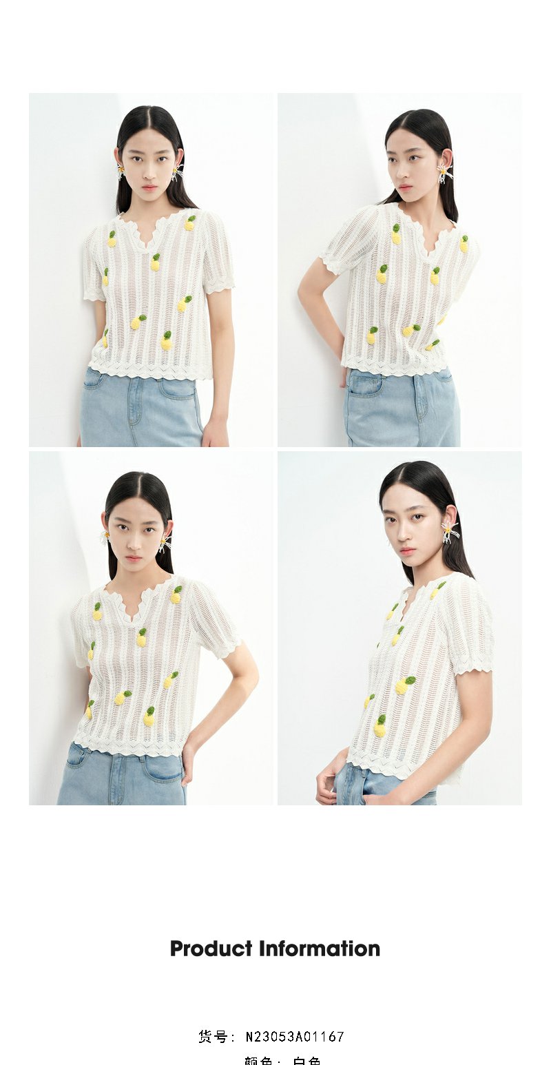 NEELLY纳俪商场同款夏季趣味菠萝刺绣针织衫女短袖镂空套头衫上衣N23053A01167