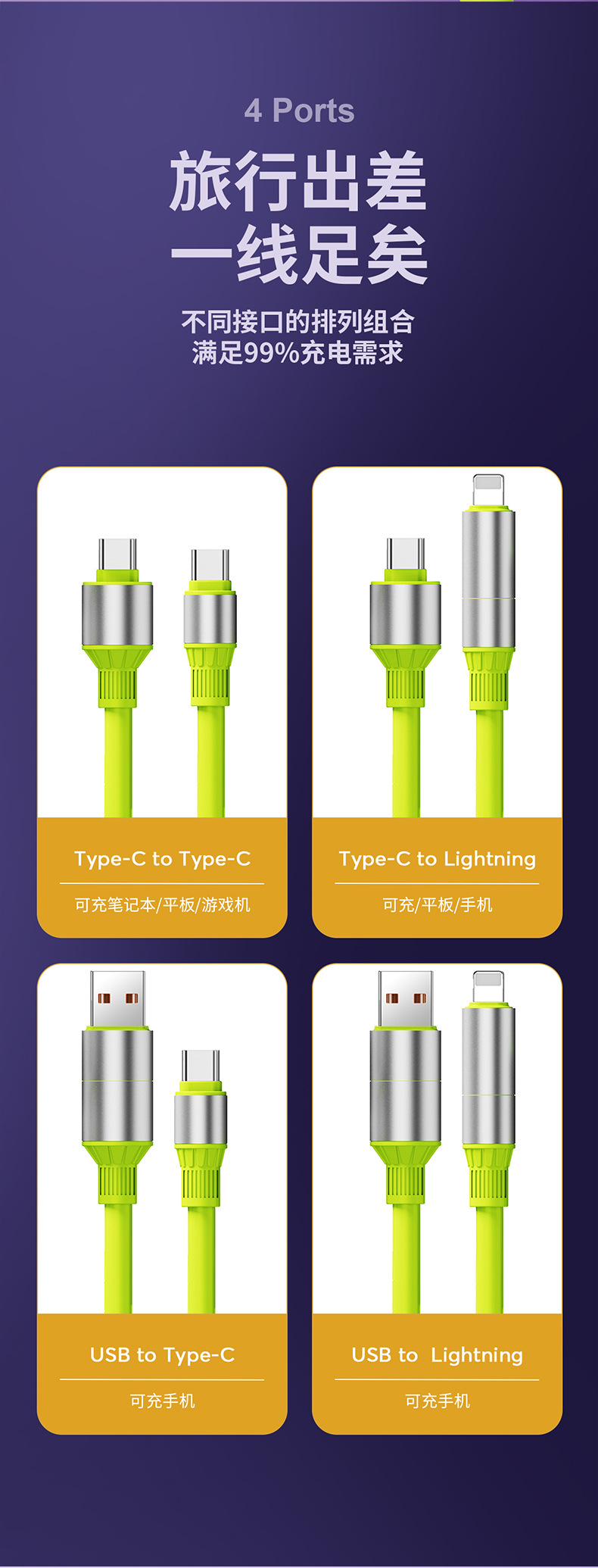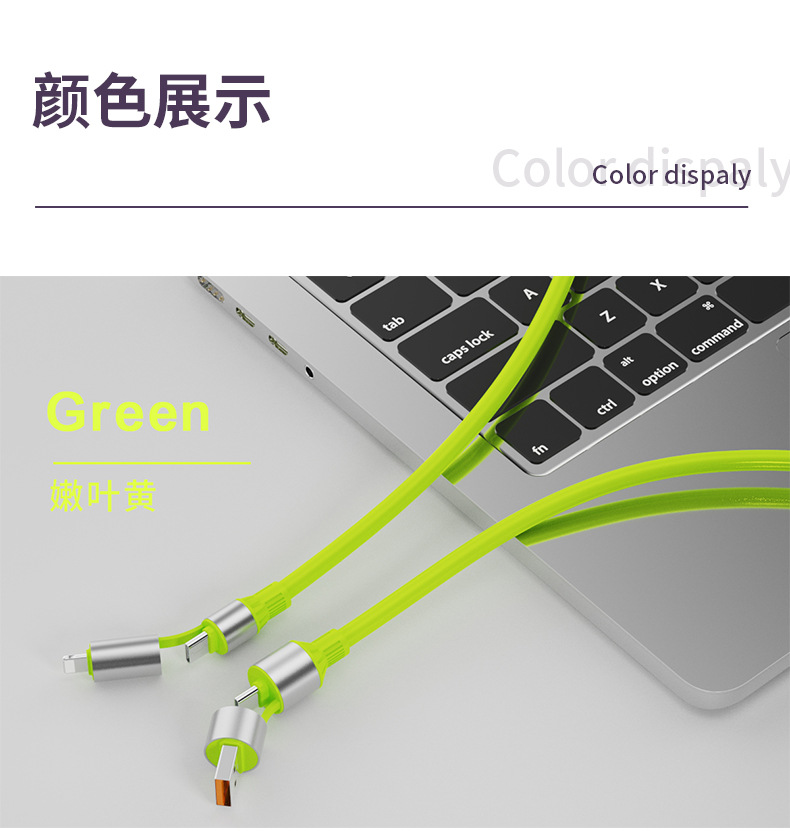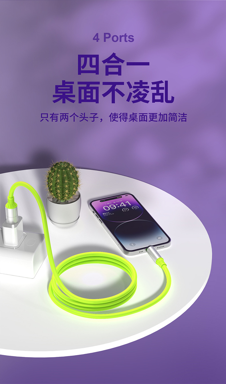【双头四接口!出门只带一条线】超级快充四合一数据线适用苹果华为安卓手机type-c车载通用充电线。rb