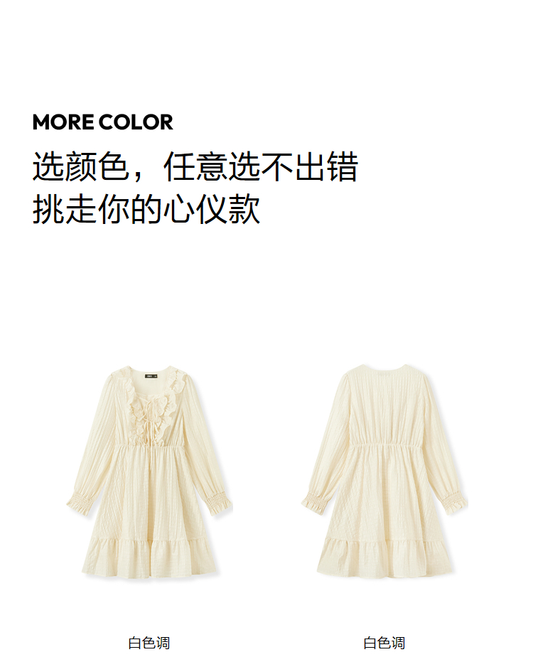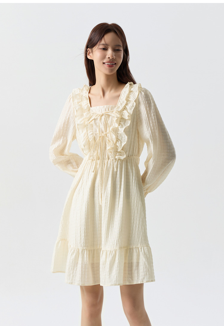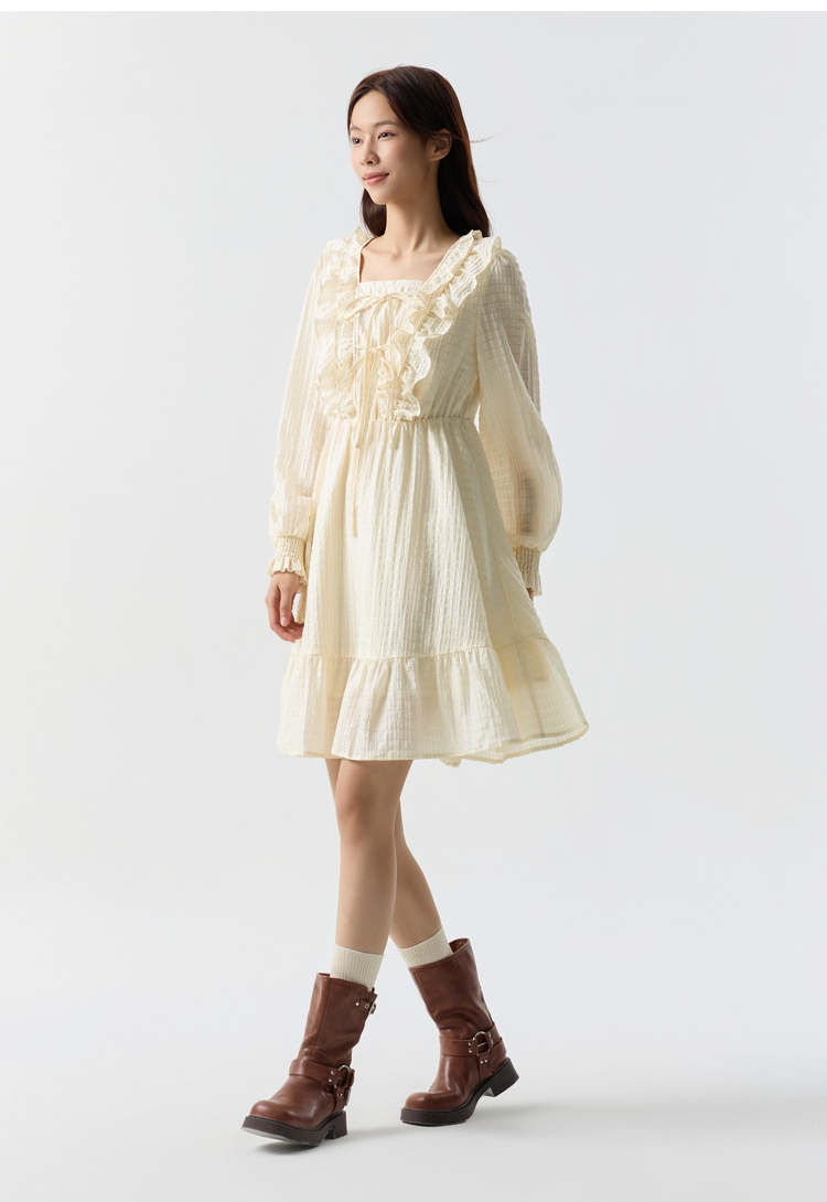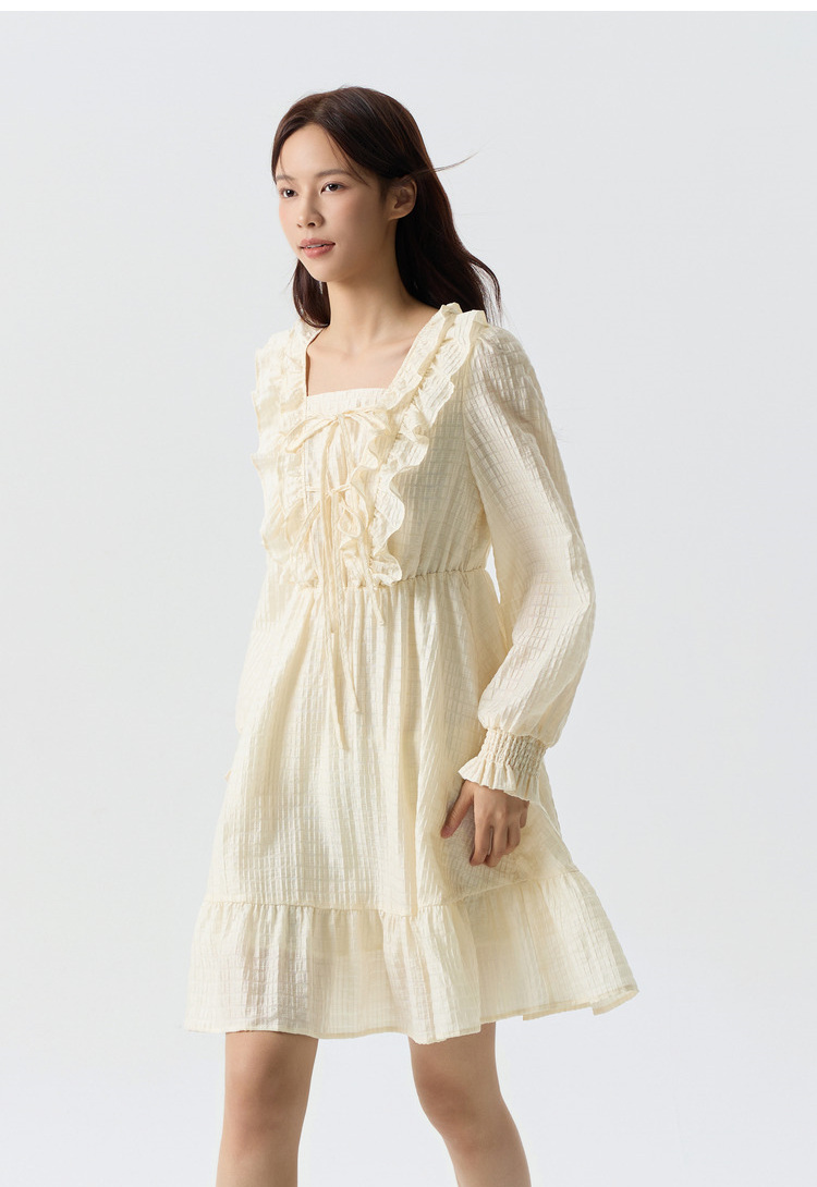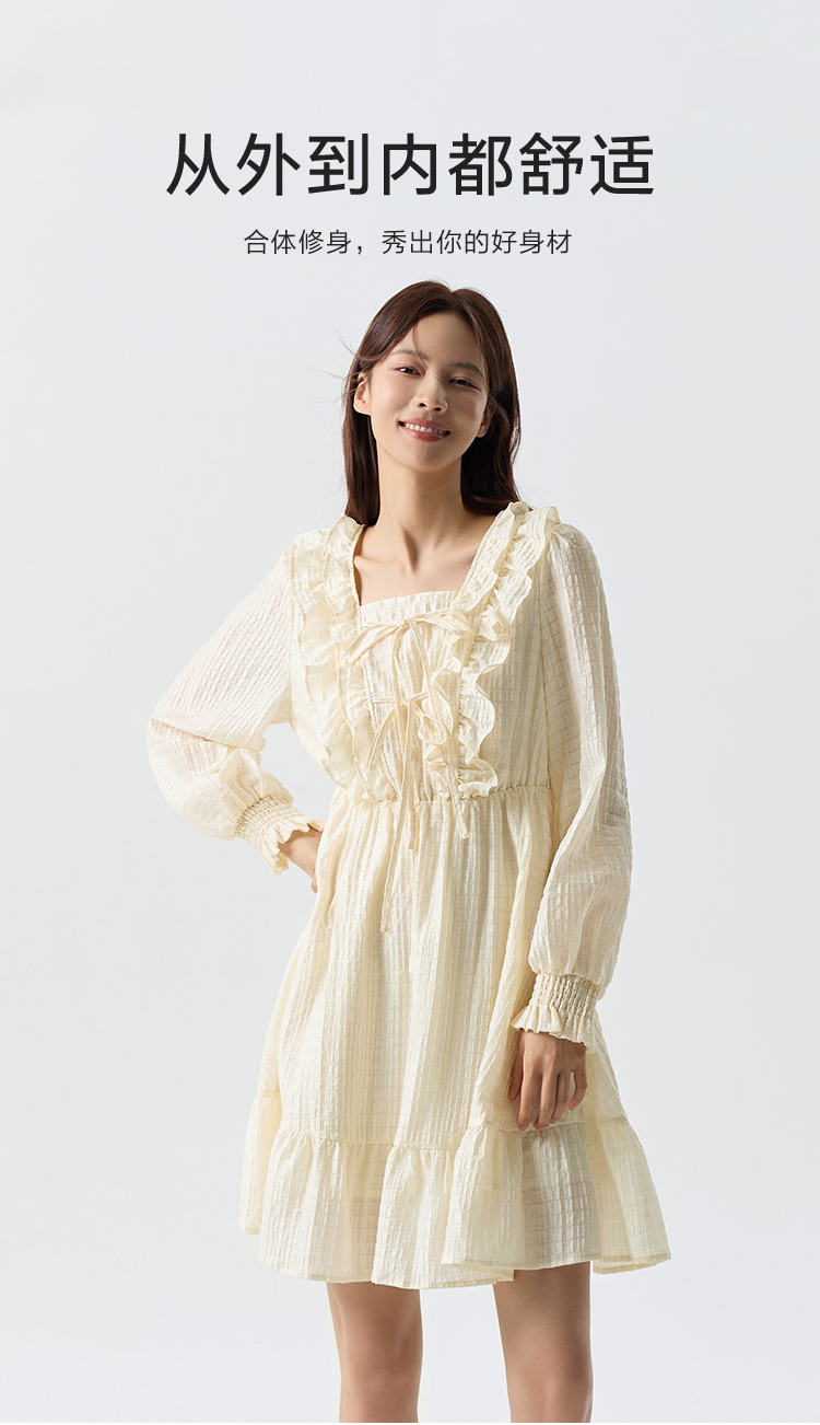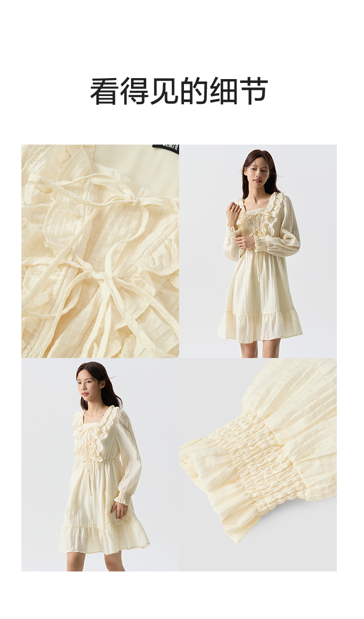 森马连衣裙女荷叶边蝴蝶结浪漫春季新款甜美方领肌理裙子温柔