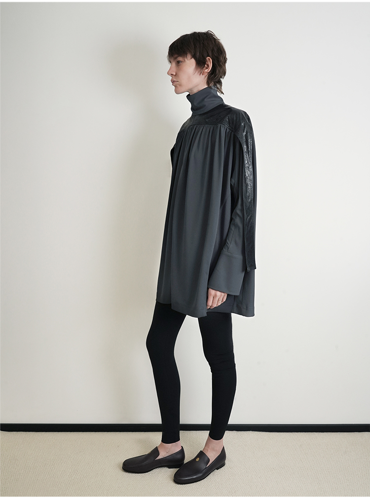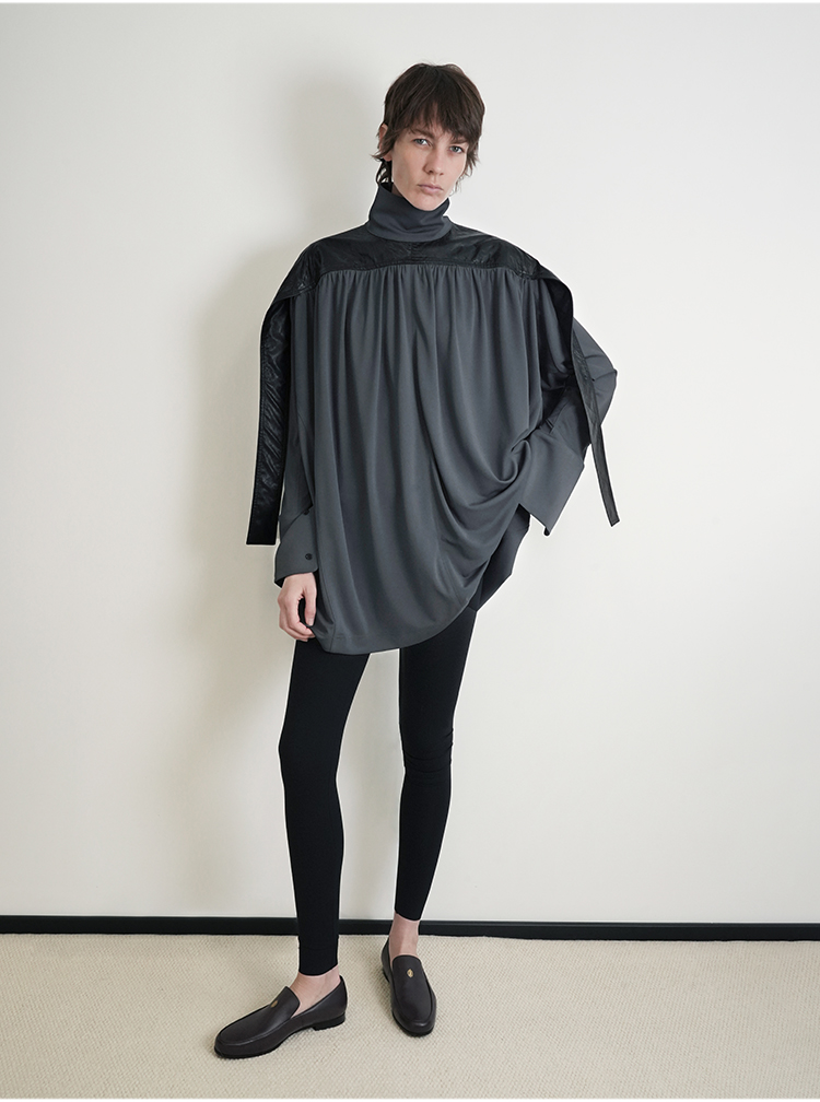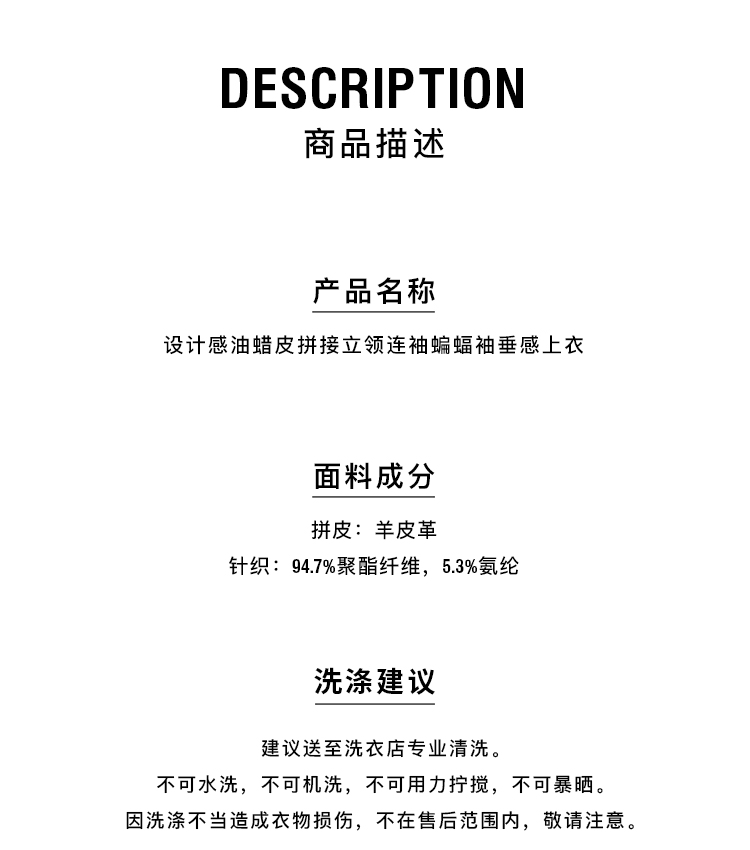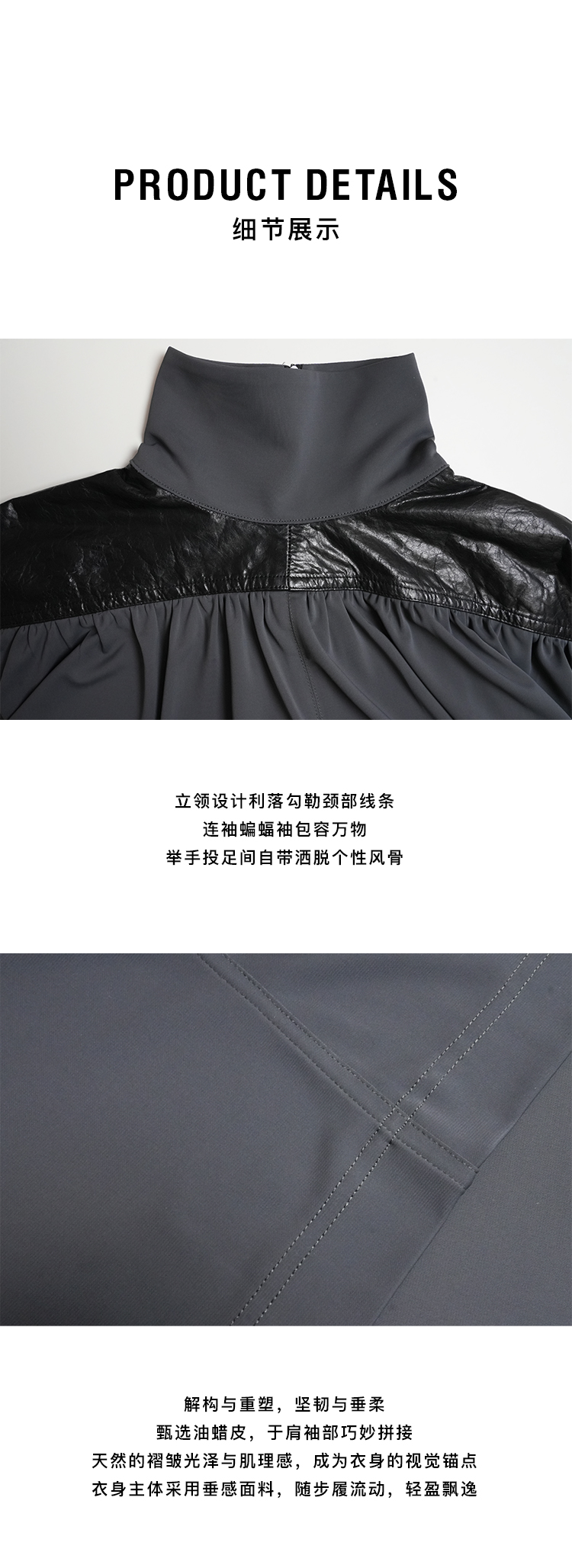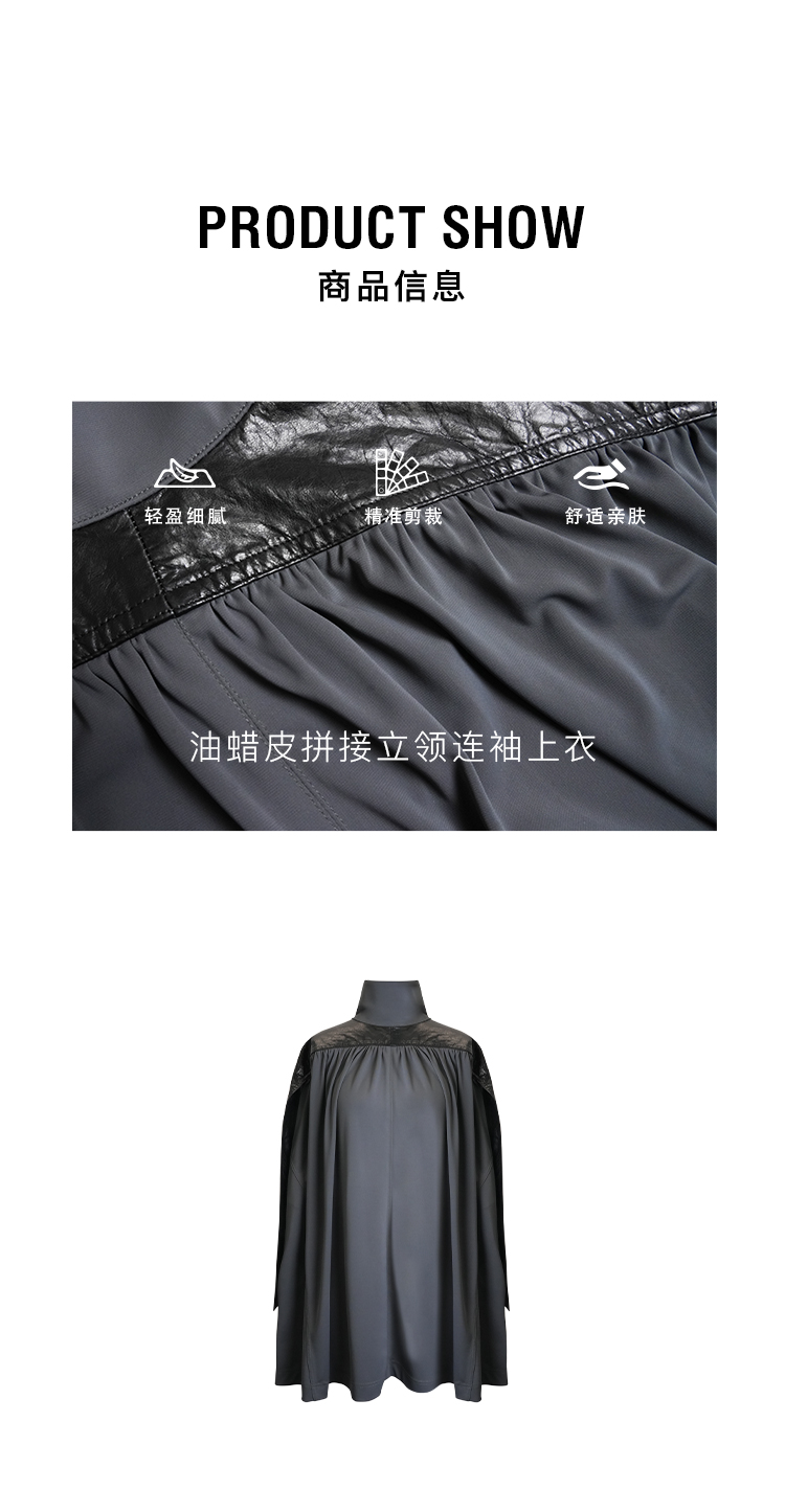 HIDEMI 设计感油蜡皮拼接立领连袖蝙蝠袖垂感上衣