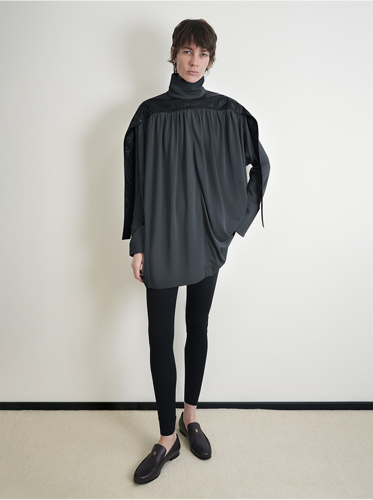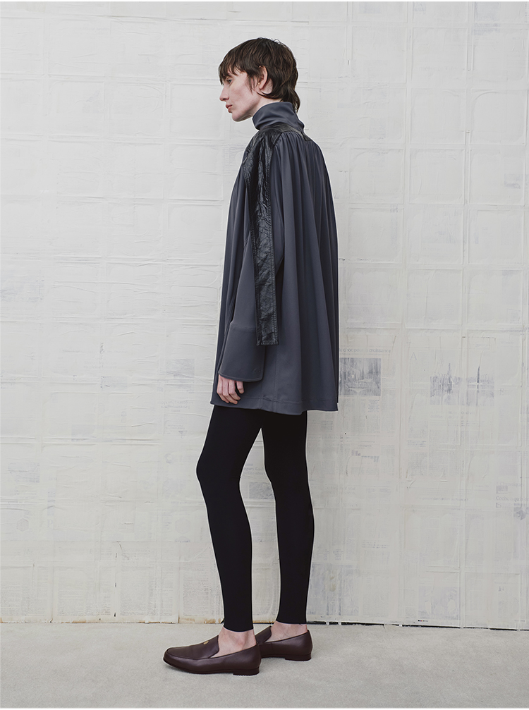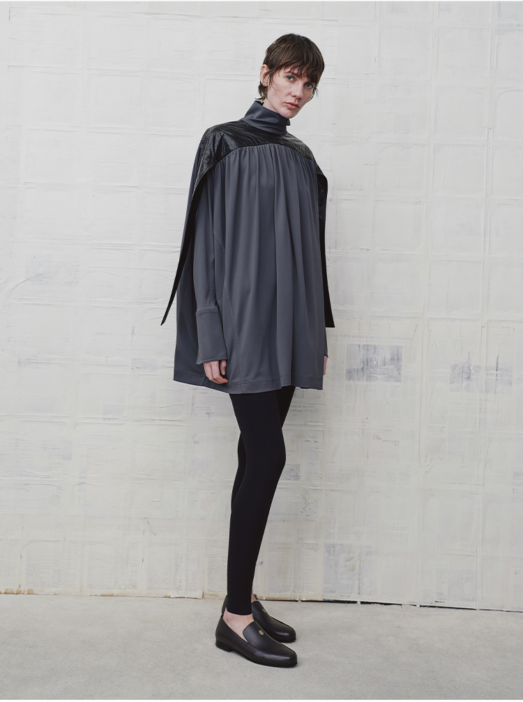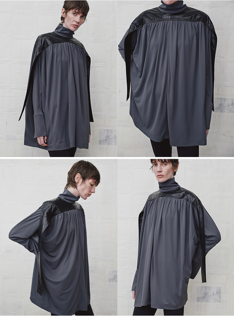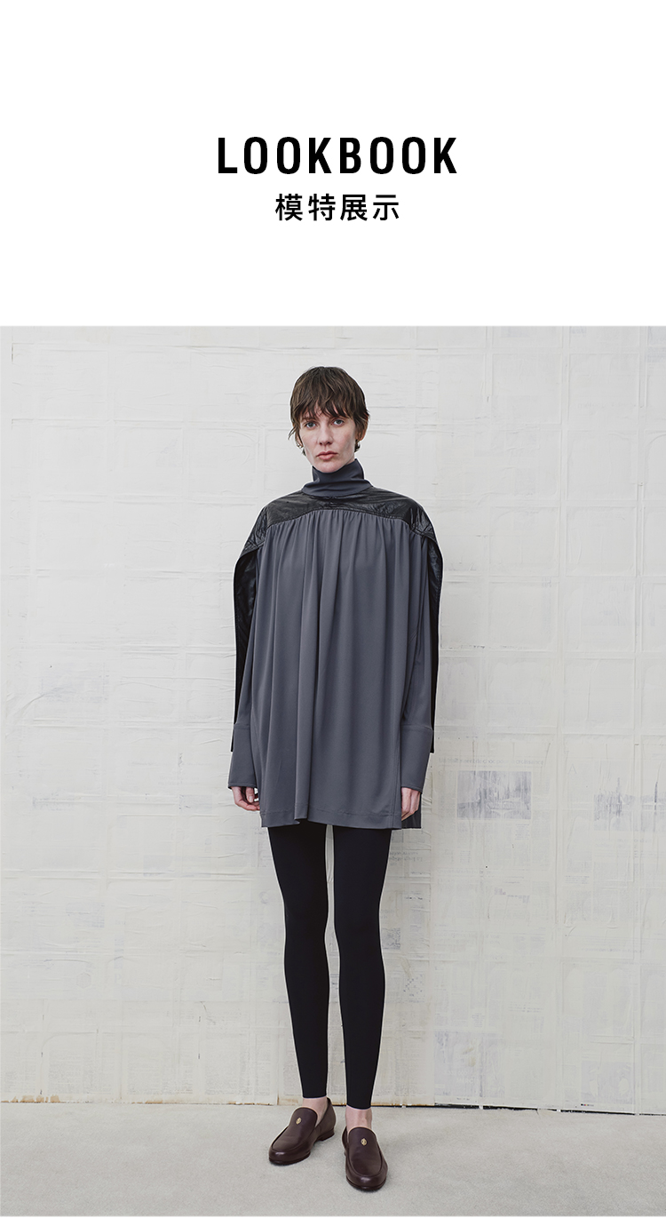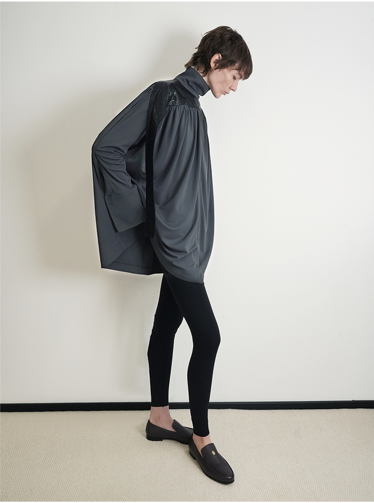 HIDEMI 设计感油蜡皮拼接立领连袖蝙蝠袖垂感上衣