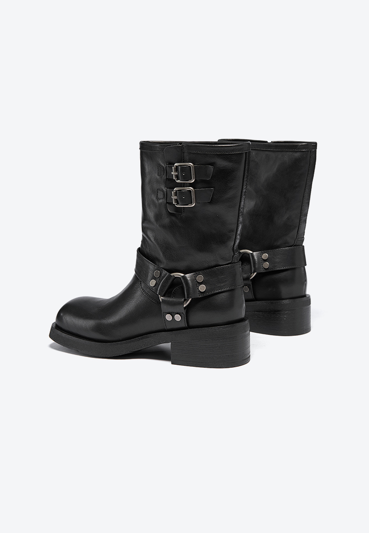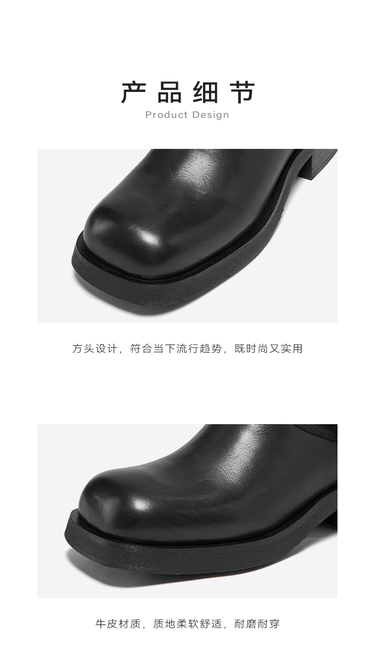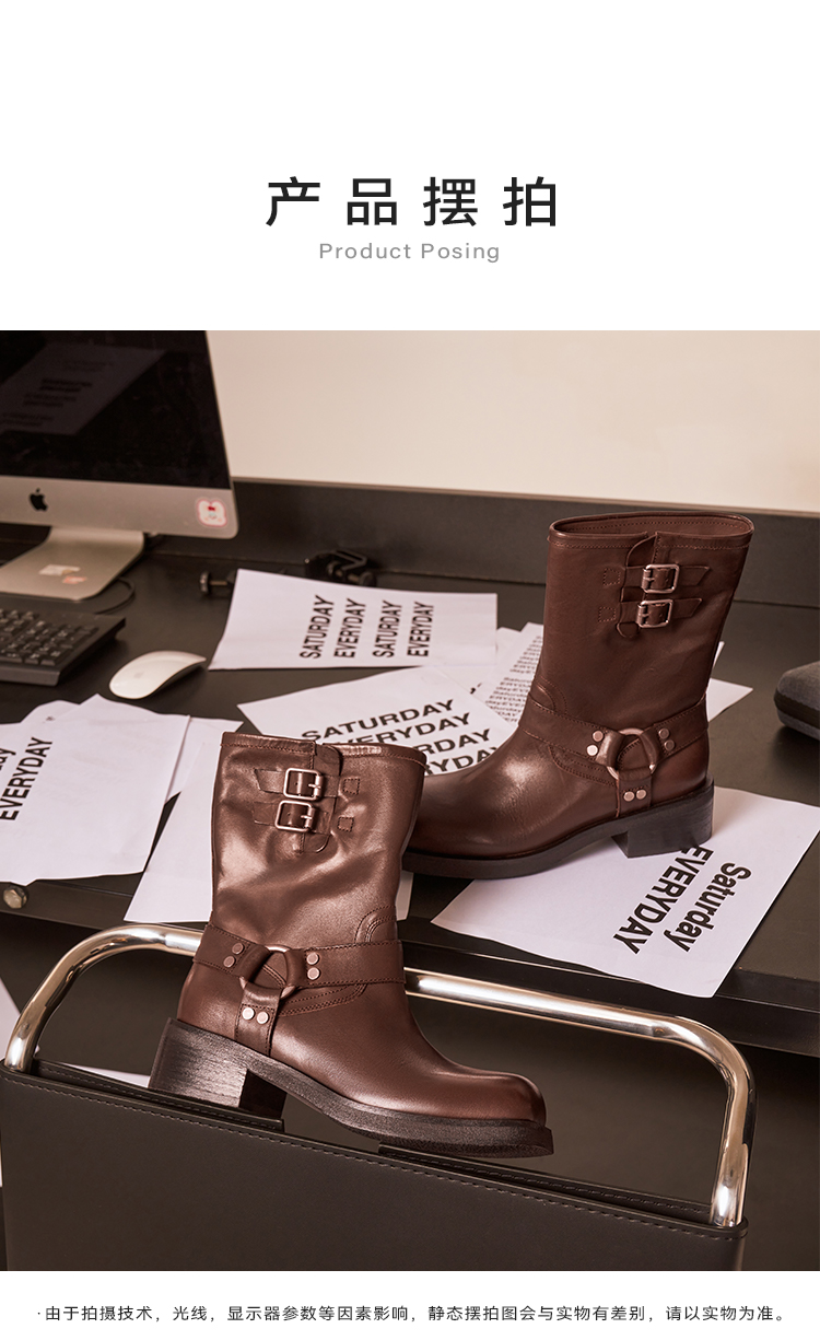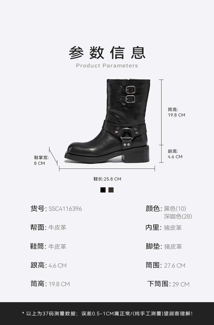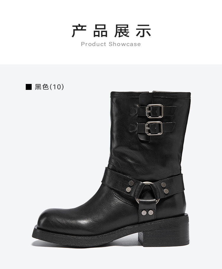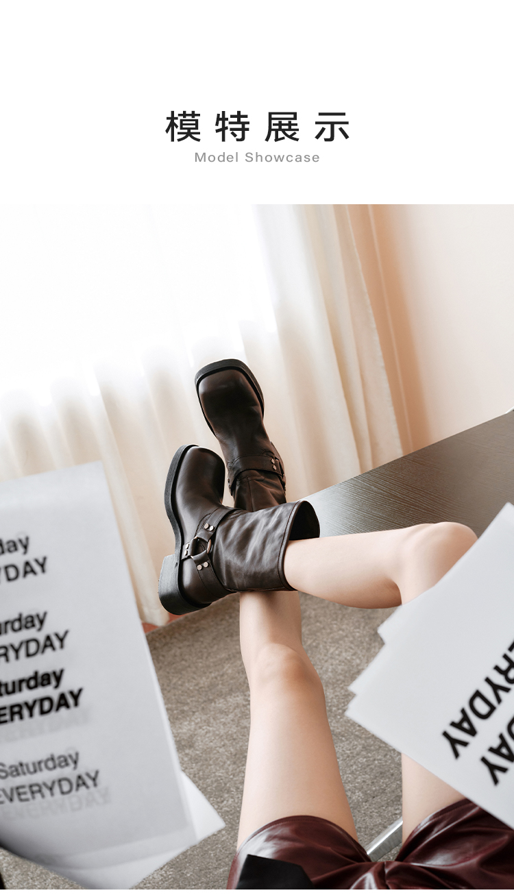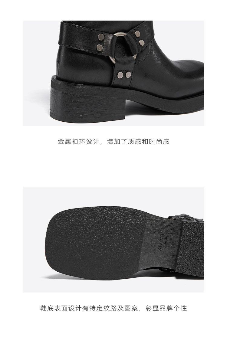 星期六复古金属扣方头粗跟中筒靴SSC4116396