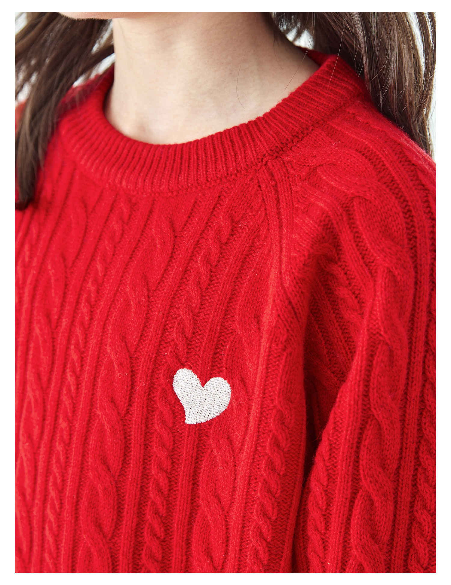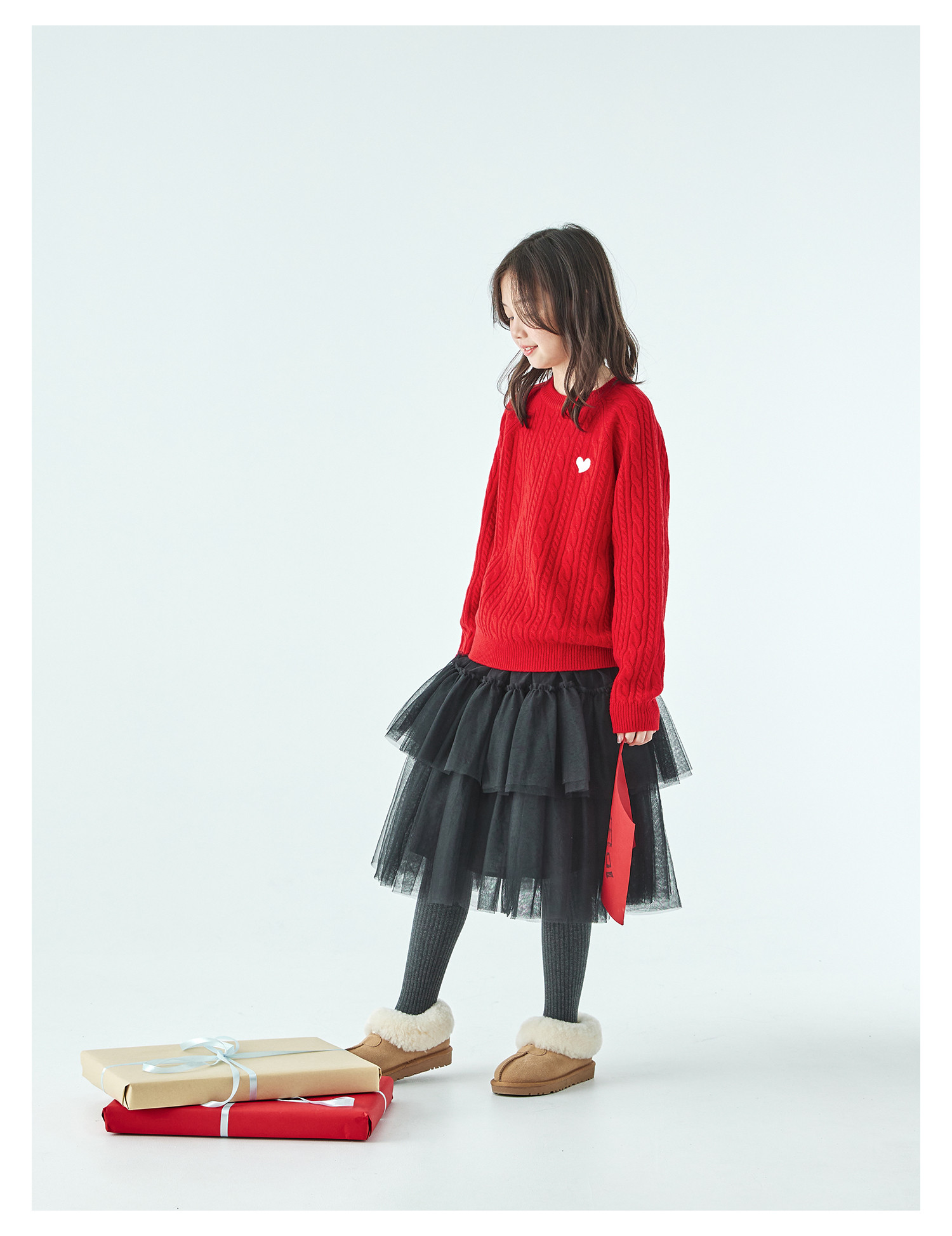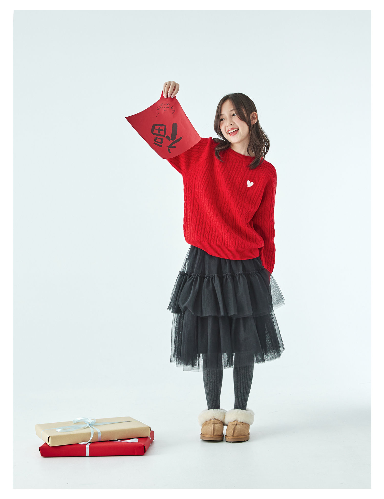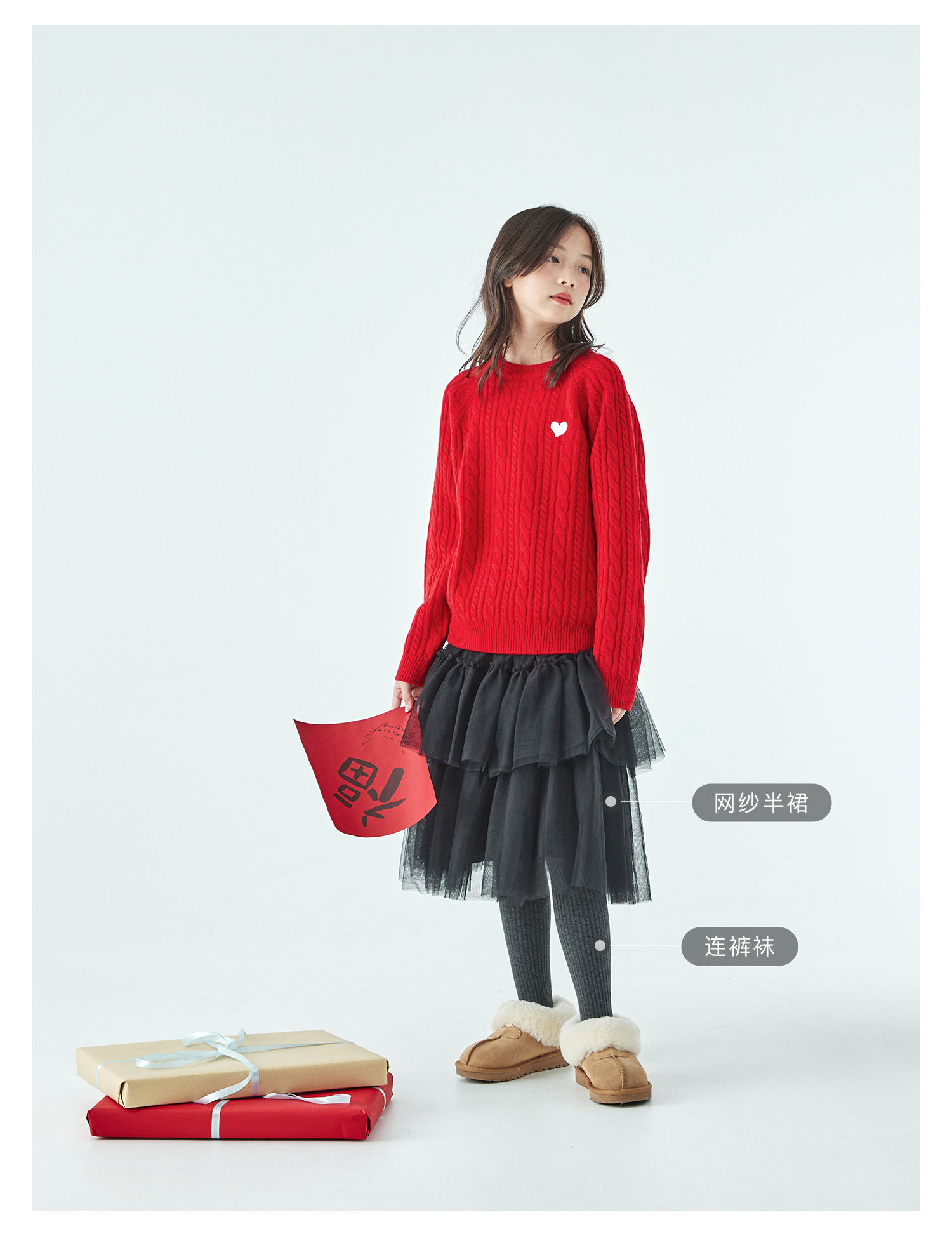 红色预售1.3发 棵初25年冬季新款亲子中大女童爱心绞花毛衣纯绵羊毛轻盈保暖上衣