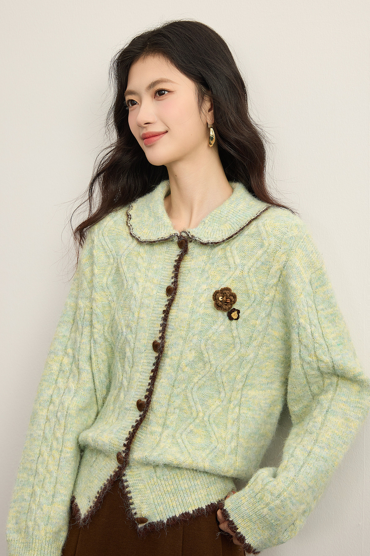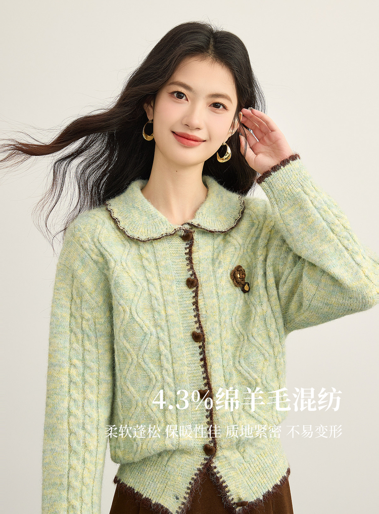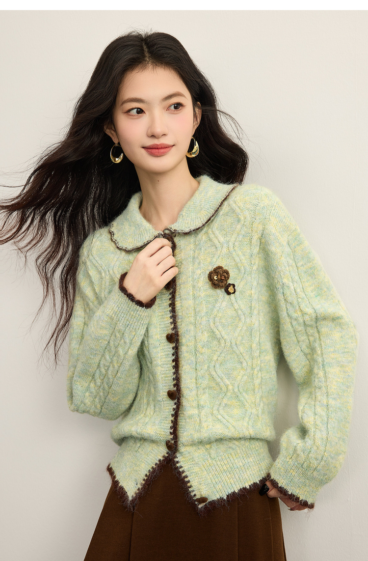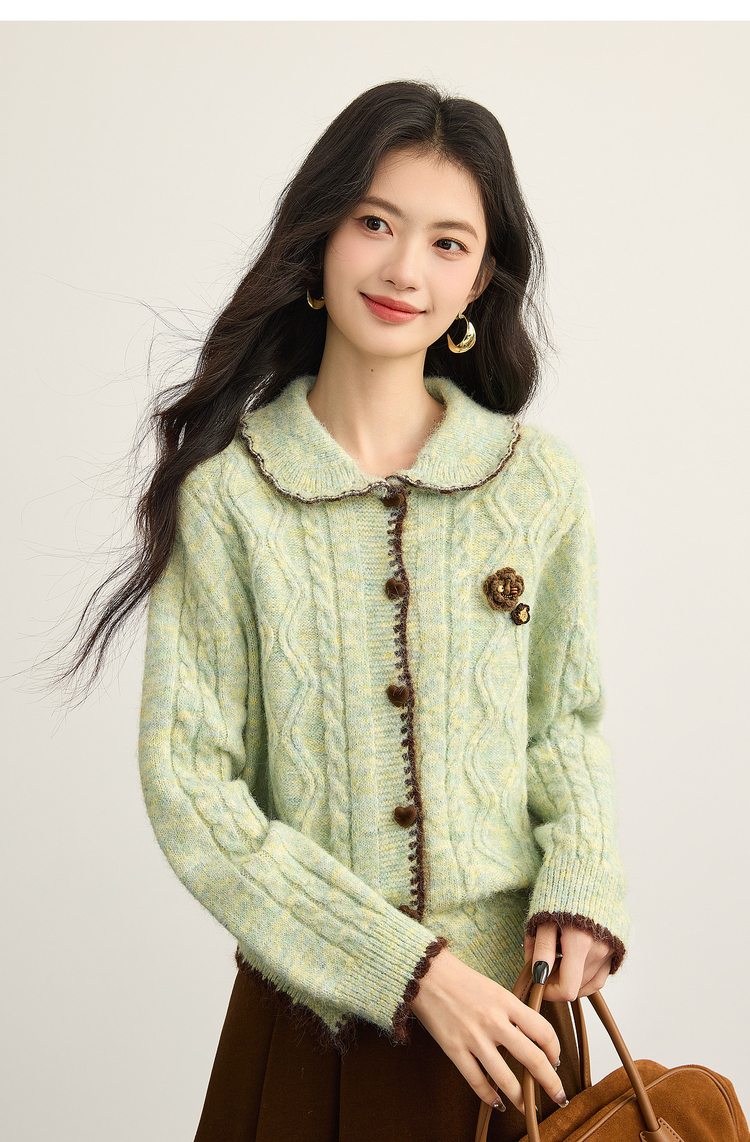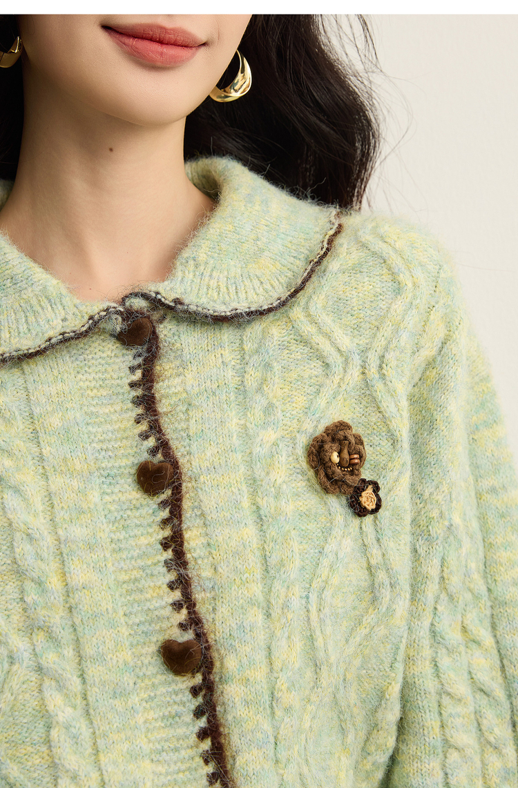 【12/17新品】熙世界绿色娃娃领麻花毛衣开衫女秋冬氛围感立体钩花厚款针织外套