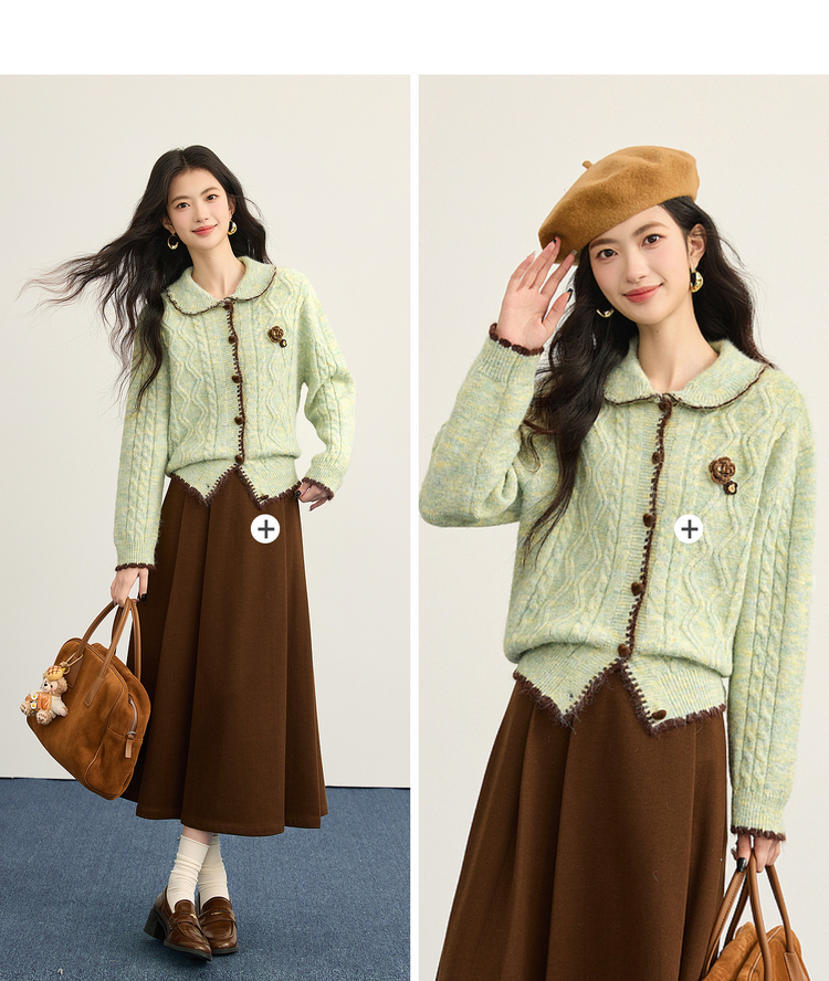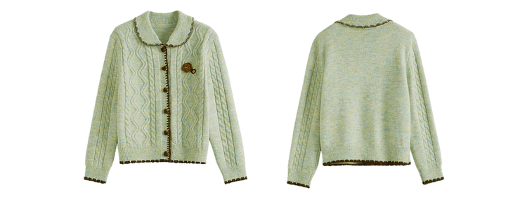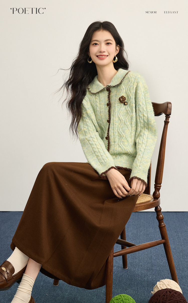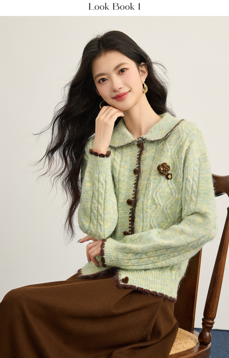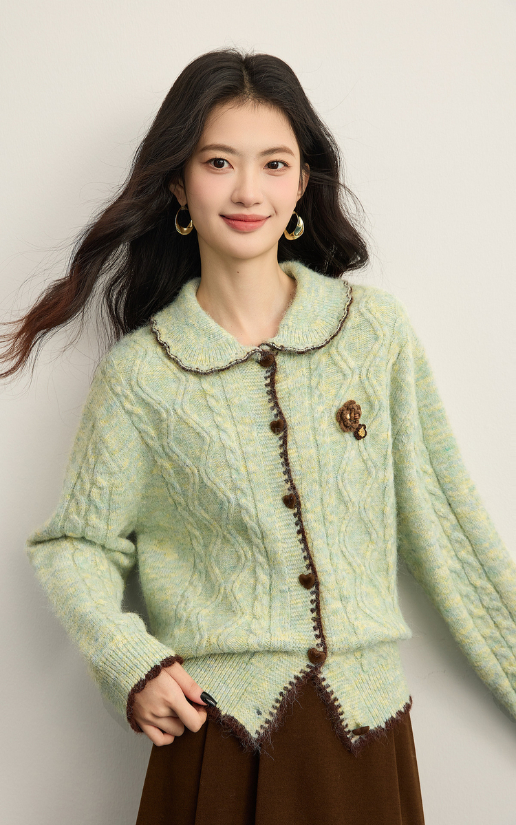 【12/17新品】熙世界绿色娃娃领麻花毛衣开衫女秋冬氛围感立体钩花厚款针织外套