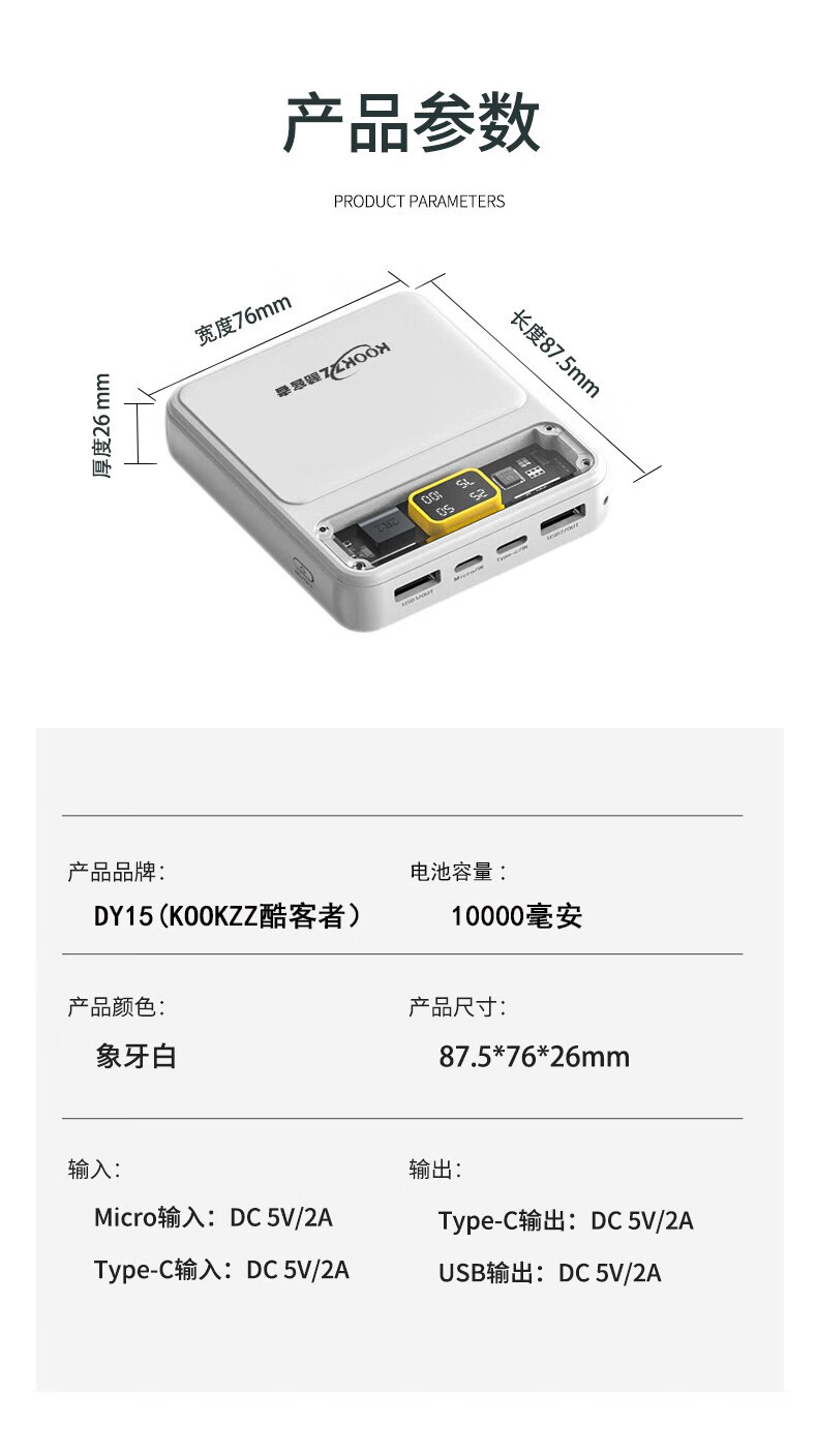 【分仓直发包邮】KOOKZZ酷客者透明数显移动电源DY15(可上飞机)