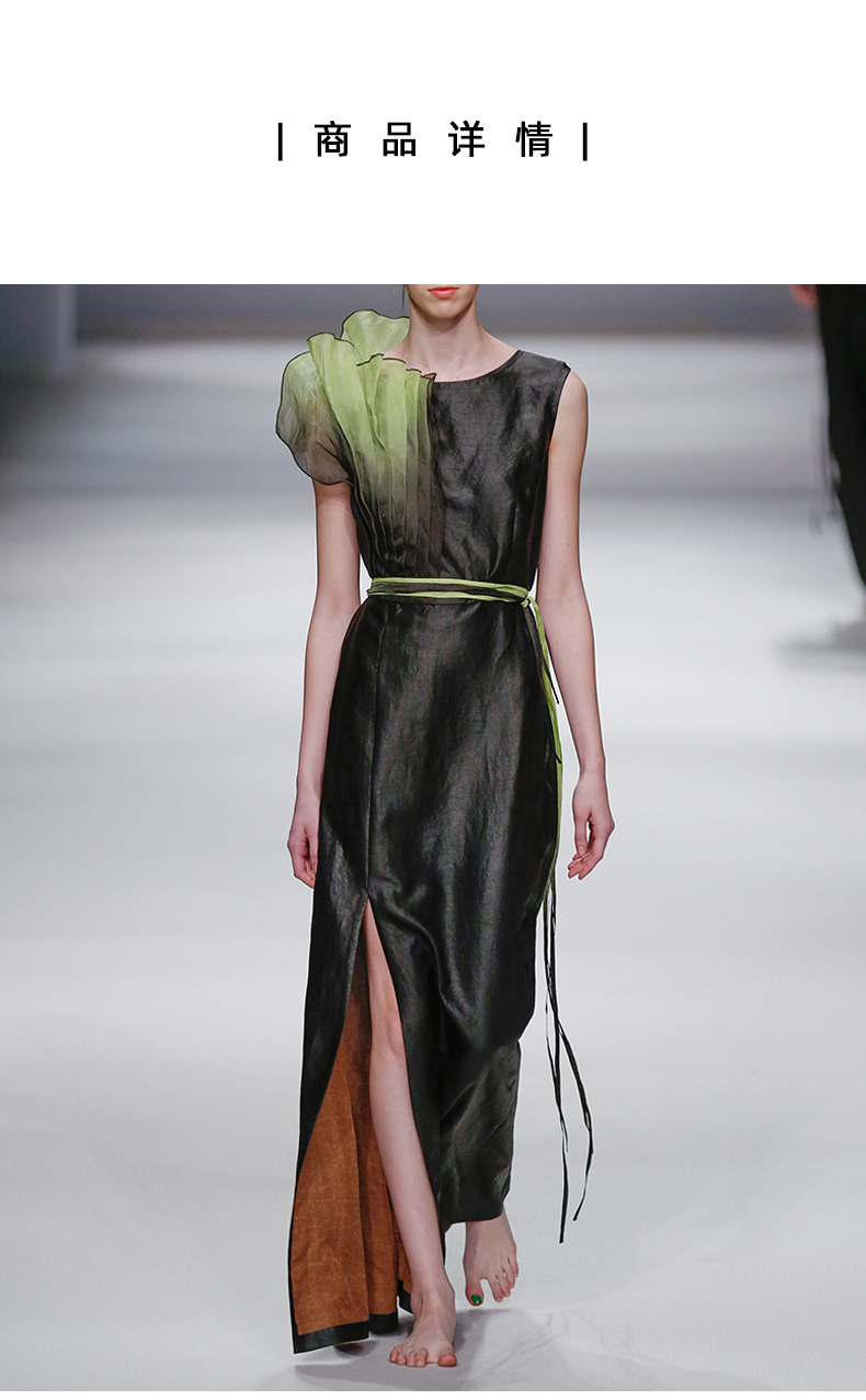 TANGY Collection/天意精品春夏走秀款真丝褶皱拼纱莨绸收腰连衣裙