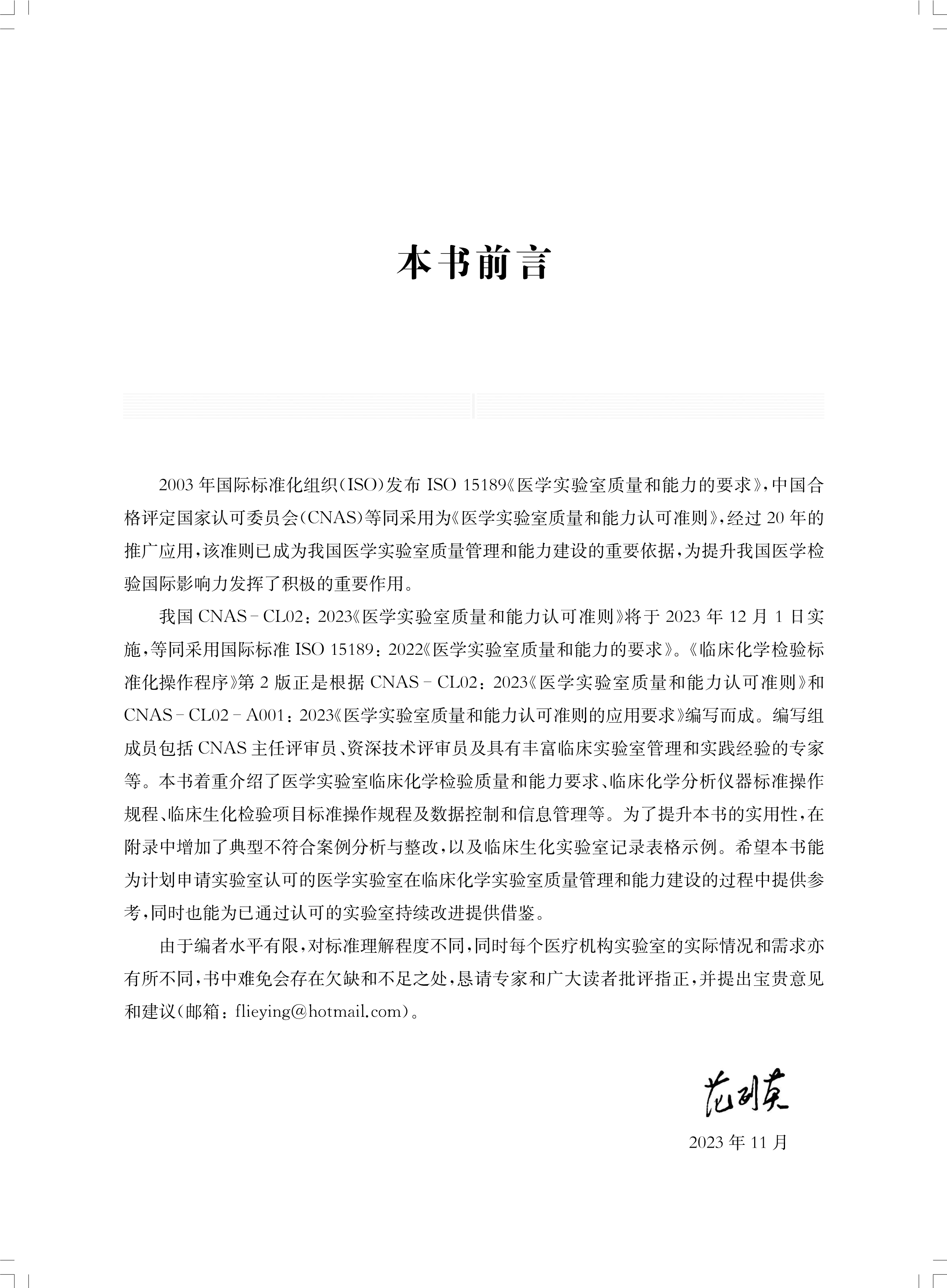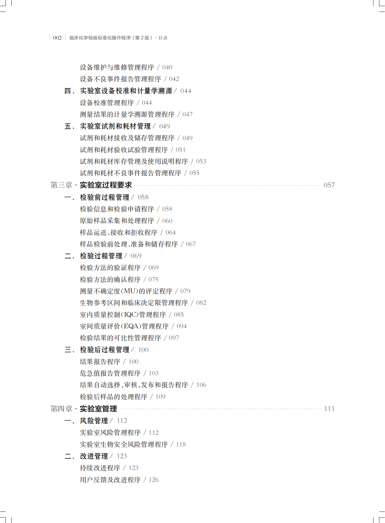 本书共3篇8章。第一篇为质量和能力要求,主要介绍了临床化学专业组的实验室活动管理、实验室结构和权限管理、实验室质量目标与指标管理、实验室人员管理、实验室环境和设施管理、实验室设备管理、实验室设备校准和计量学溯源、实验室试剂和耗材管理、实验室过程管理及实验室风险和改进管理。第二篇为临床生化检验标准操作规程,内容涉及仪器标准操作规程(包括仪器操作、校准、质控和维护保养)及生化检验项目标准操作规程(包含检验目的、方法和原理、标本要求与患者准备、试剂和仪器性能参数、临床意义和注意事项等)。第三篇为数据控制和信息管理,针对信息系统数据管理和信息安全及突发事件的应急处理方案做了详细介绍。附录部分不仅收录了临床化学检验常用的记录表格,方便读者直接引用,而且列举了临床化学检验和检验科信息系统常见不符合项案例及整改要点,有利于读者借鉴和参考,指导作用突出。