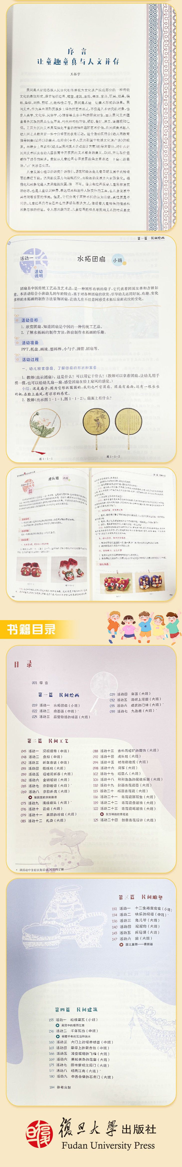 民间美术是民间文化中最富色彩的组成部分,把民间美术的独特表现形式通过合适的方式让幼儿了解、体验,并用自己的方式进行表现,有利于幼儿感受非物质文化遗产的独特魅力和对本土文化的了解本土文化,同时提升幼儿的审美能力以及想象力和创造力,在幼儿园开展民间美术活动对我国博大精深的民间美术在幼儿中得到延续和发展有着重要的价值。本书根据岁时节令以及民间美术形态(包括民间绘画、民间雕塑、民间工艺和民间建筑),结合民间美术资源的民俗性、差异性、多样性、适宜性设计了小中大班共计60个美术集体教学活动方案和33个美术区角活动方案。 每个集体活动方案有活动说明以及后续活动的建议,每个区角活动方案都有具体的操作材料、过程和观察指导的要点,同时收录了幼儿活动后的作品,上述各部分内容可以帮助读者感性地理解活动内容及其活动实施后的效果。