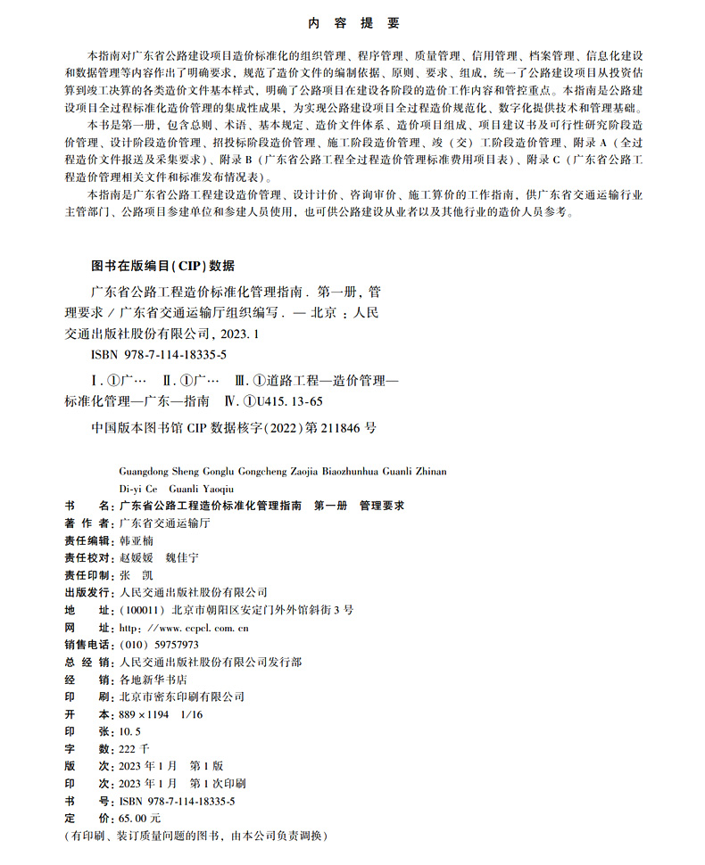 书名:广东省公路工程造价标准化管理指南 第一册 管理要求