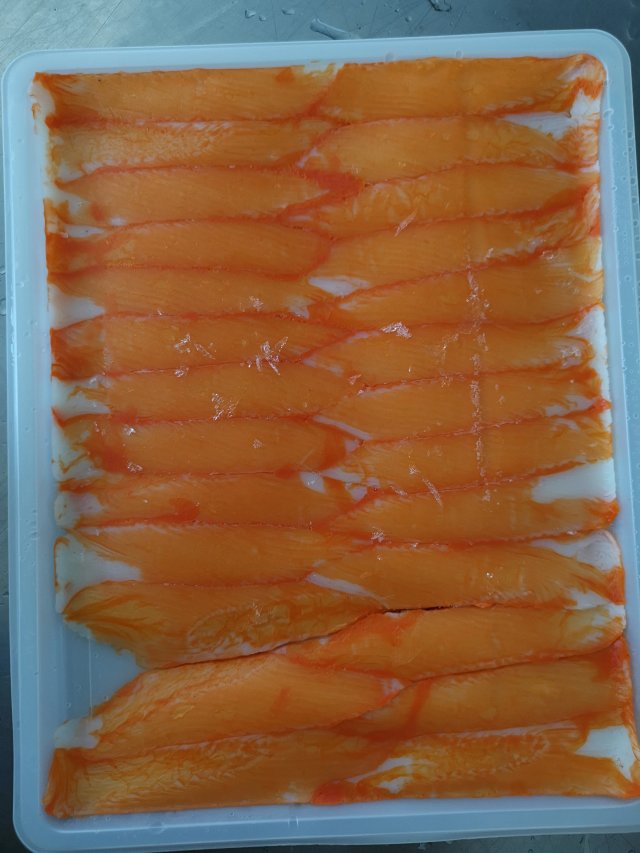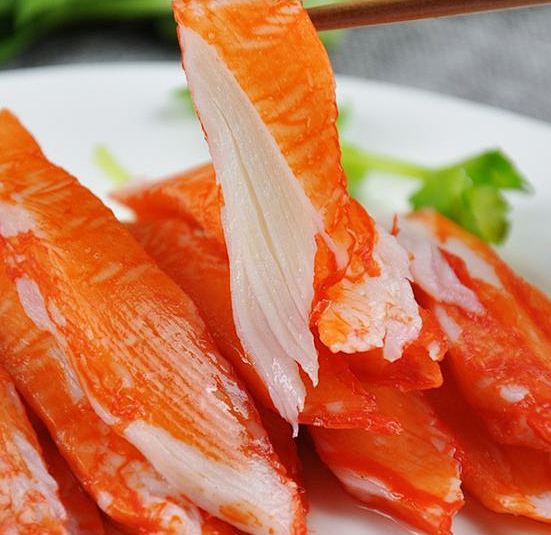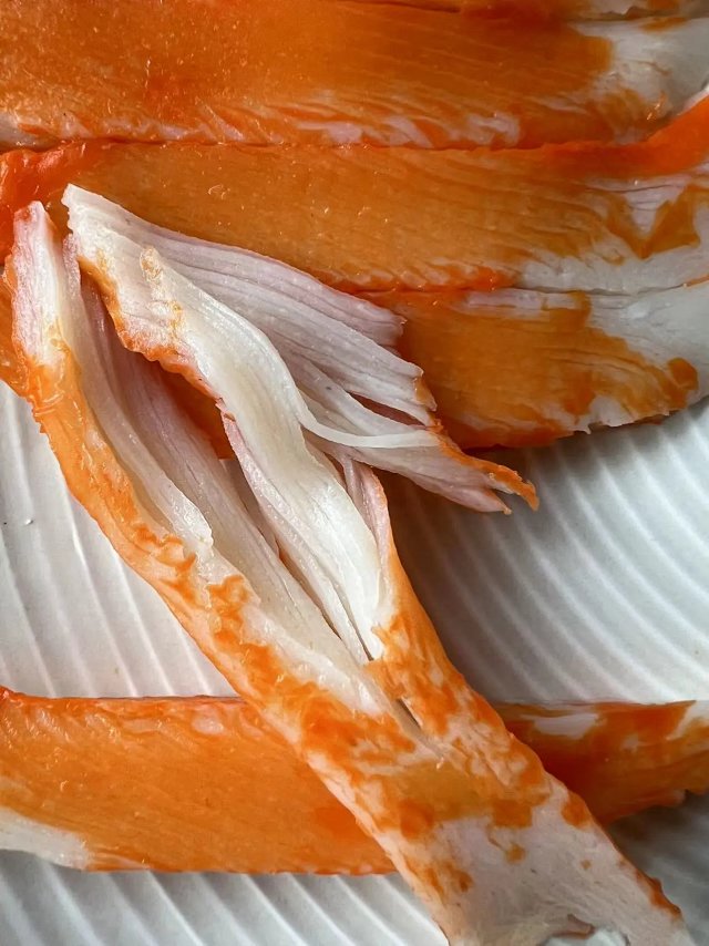 4.使用天然胡萝素作为产品表面色素 我们见到的蟹柳多为红色 为了更加健康的食用, 首创使用天然胡萝卜素 所以我们的产品表面是橙色的哦~~5.加工工艺先进 蟹柳是1975年日本人发明的一种模拟食品,风味外观酷似昂贵的雪蟹腿肉,为使其无限接近蟹肉,所以在鱼糜中加入了适量的蟹肉或蟹肉提取物 ,常见成型方法有两种,一种是刻纹法,将片状鱼糕切细丝,制成棒状,加热固型;另外一种是将鱼糜制作成薄片,加热后用类似制面机的设备拉成胚子 ,切割菱形后涂上色素, 我们的蟹柳工艺是将两者结合起来,拉完细丝后再制胚涂色 ,口感更上层楼!6. 价格足够优势 因为常年做出口加工 深耕行业很多年,我们用低的价格拿到优秀的品质 这也是我们专业的意义所在一般的进口蟹柳非常昂贵,而我们的蟹柳是出口商品 ,省去出口再内销的诸多环节,直接给到大家更好的选择~蟹柳在很早之前叫鱼肉糕,是日本人用于喜庆之事,非常吉利的选择。