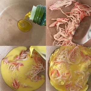 3.锅里刷少量油,放入蟹柳煸炒一下,再将打散的鸡蛋倒入锅中,小火加热至鸡蛋8分熟即可
