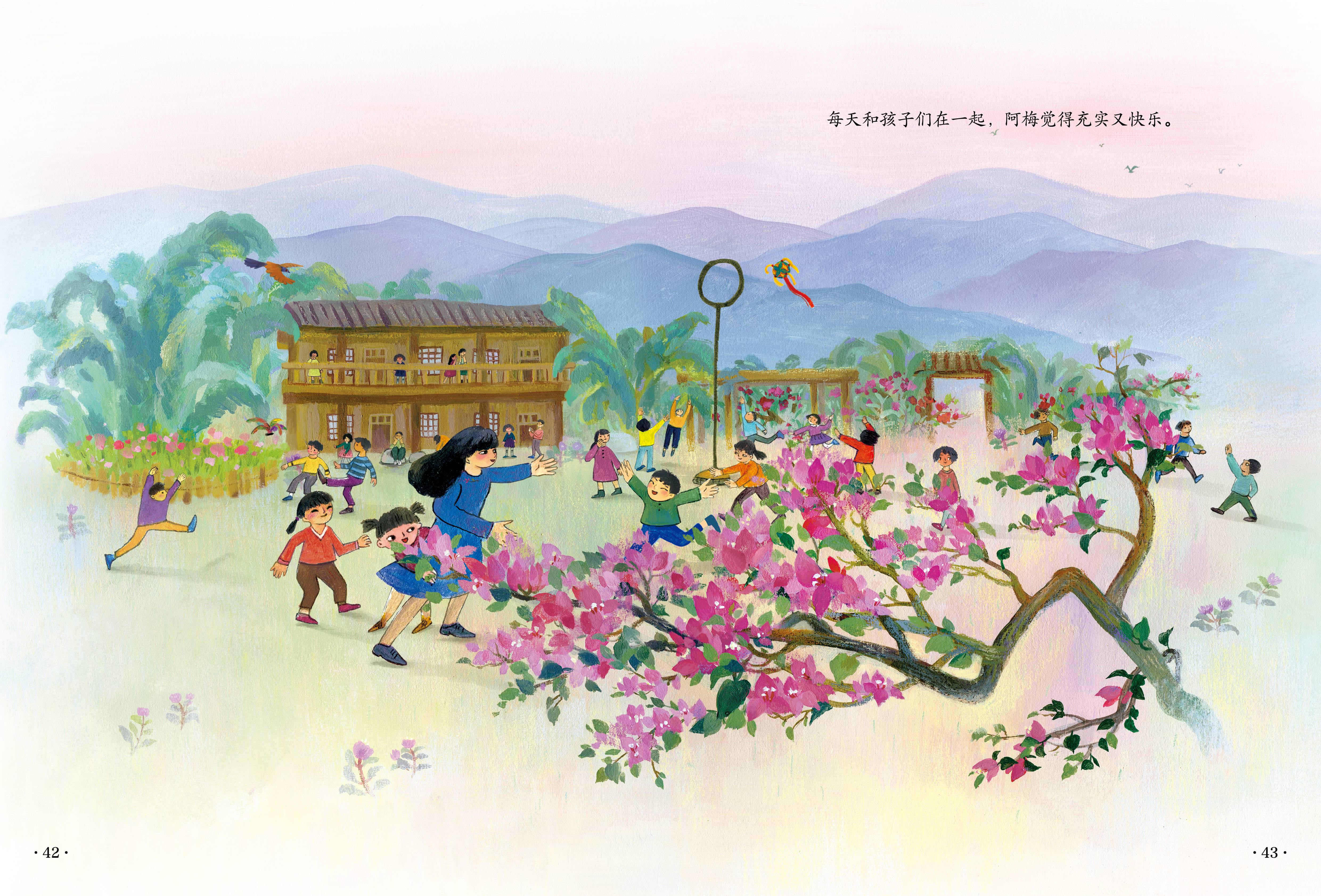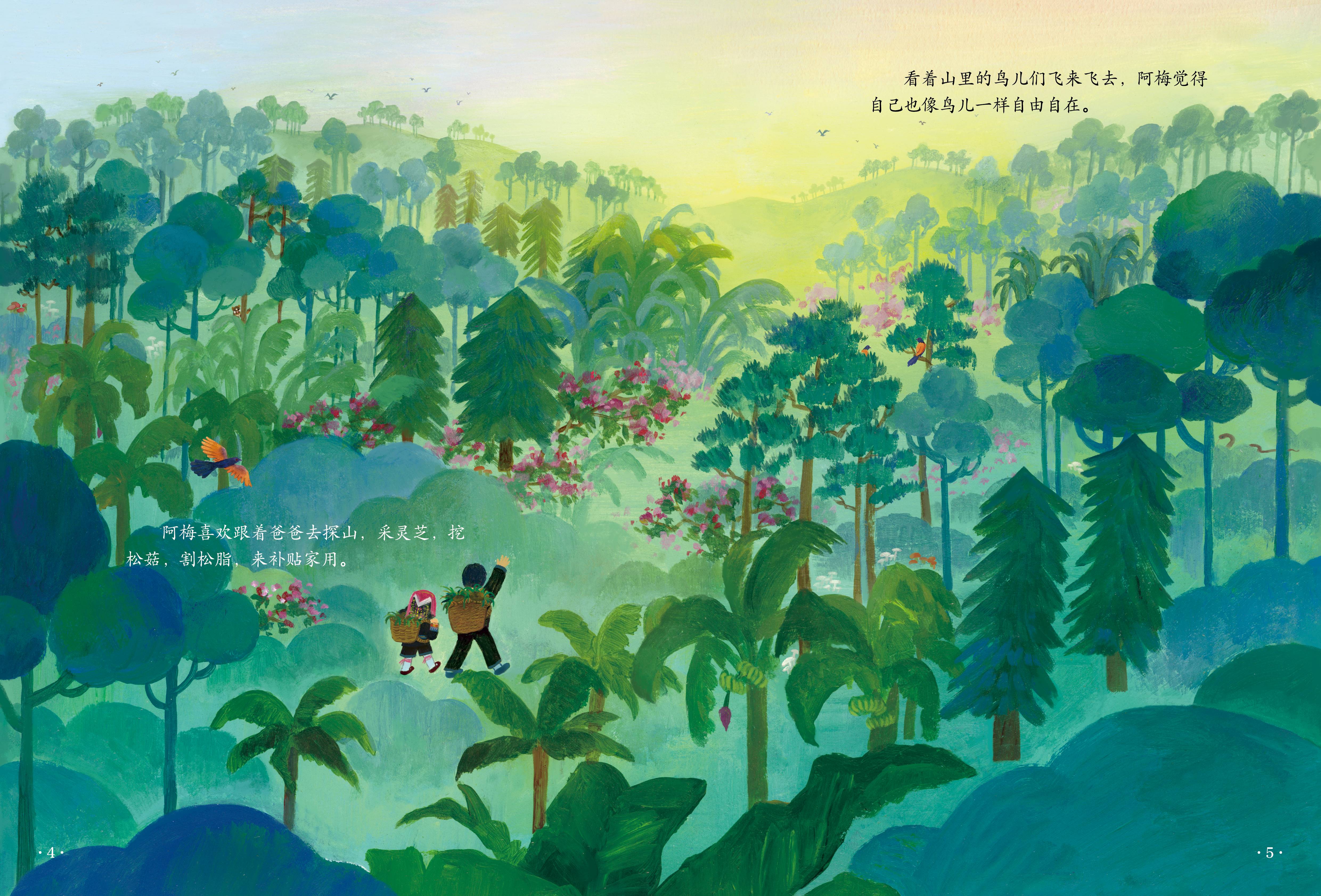 这是一部以教育扶贫为背景创作的现实题材的原创绘本。广西十万山,流传着一个“女不读书”的落后观念,一个瑶族小女孩阿梅怀着“知识改变命运”的憧憬,在党和政府的帮助下,走出大山读书、工作,见识更广阔的世界后,又回到大山为其他女孩播洒希望。画风细腻、温暖又蕴含力量,绵延的大山和郁郁葱葱的山林,引人无限遐想,体现了大山深处的女孩对知识的渴求、对外面世界的向往。绘本反映的贫困落后地区女孩的教育问题非常具有现实意义,也赞扬了无私的教育者,他们将个人有限的力量奉献到无限的教育事业当中,让更多女孩获得开阔而光明的人生。