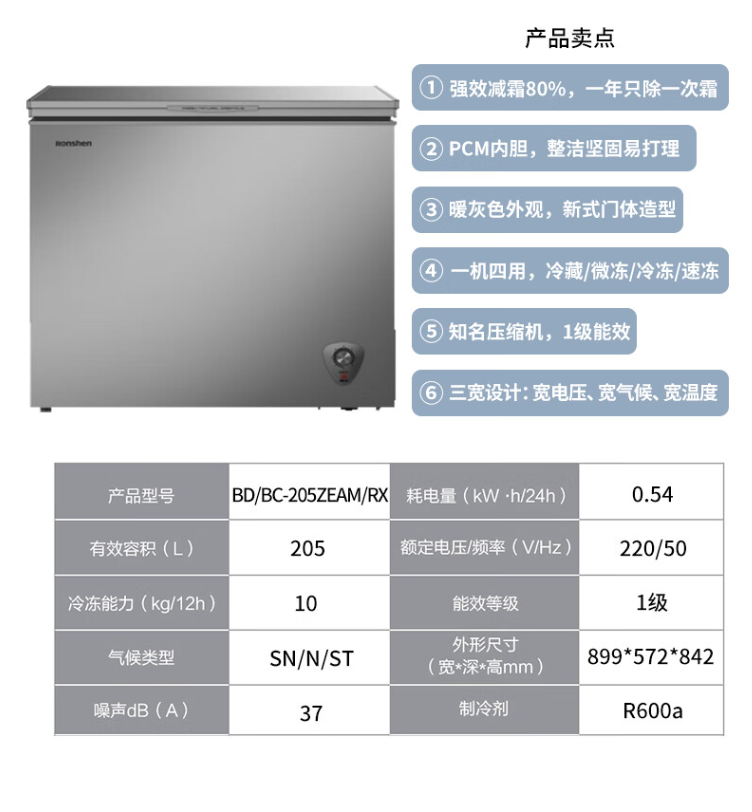 容声(Ronshen)(202752)冷柜家用冷藏冷冻双多温区可转换冰柜立式/卧式小冰柜商用冷冻柜两用容声冰柜 BD/BC-205ZEAM/RX 205L
