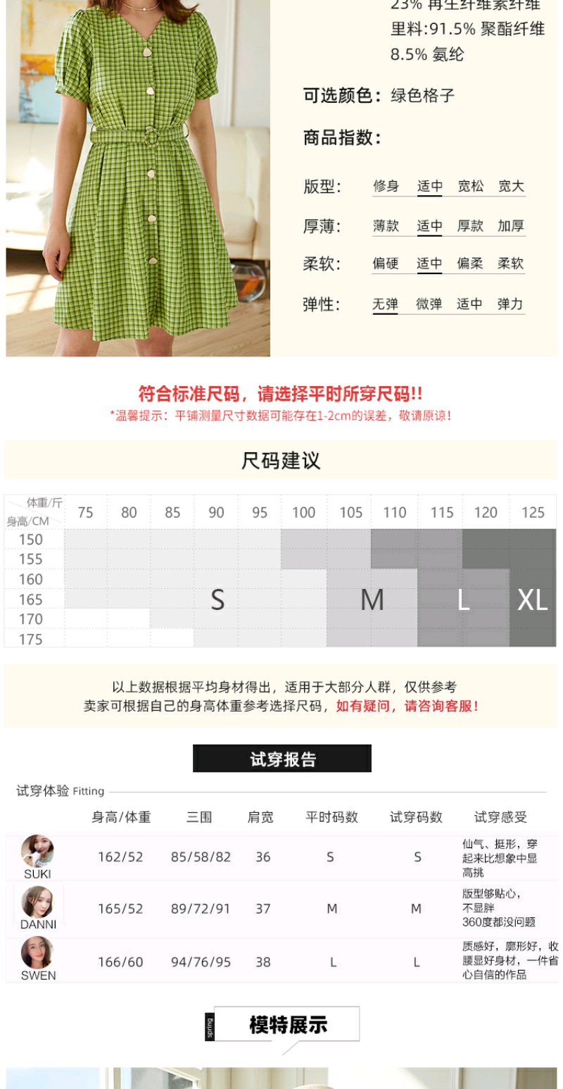 欧芮儿V领短袖格子连衣裙绿色A字裙O20XL30503