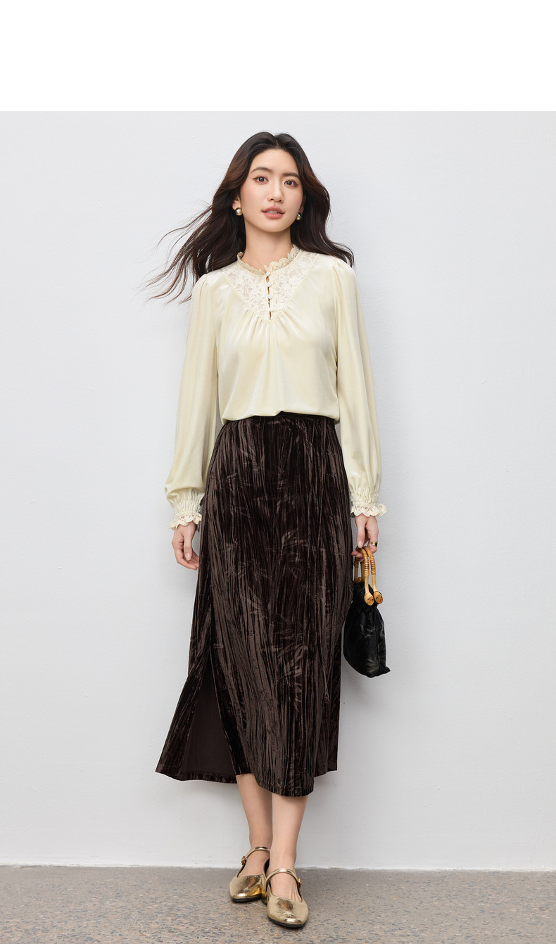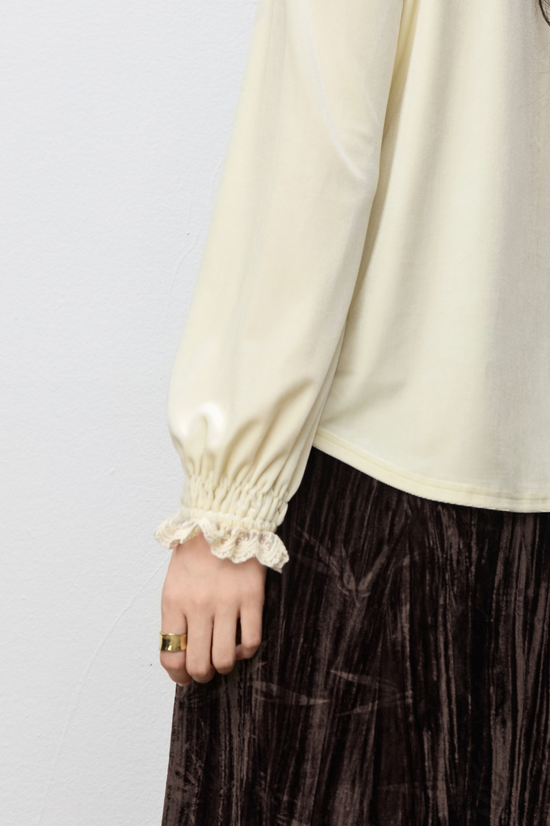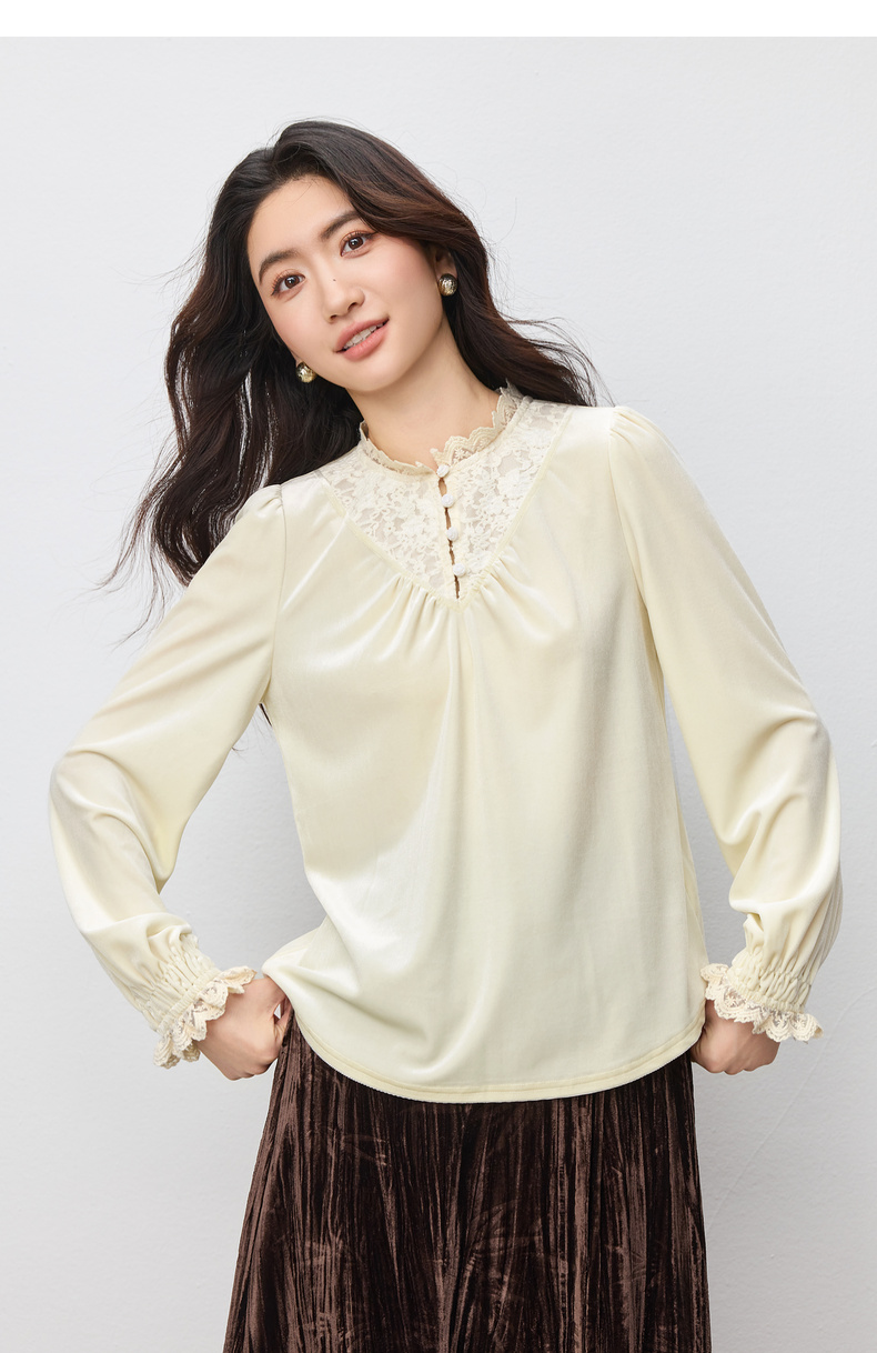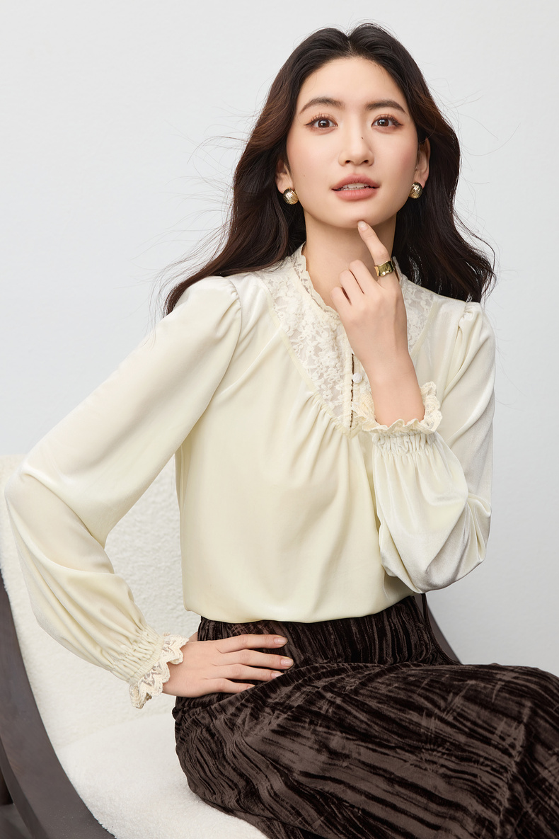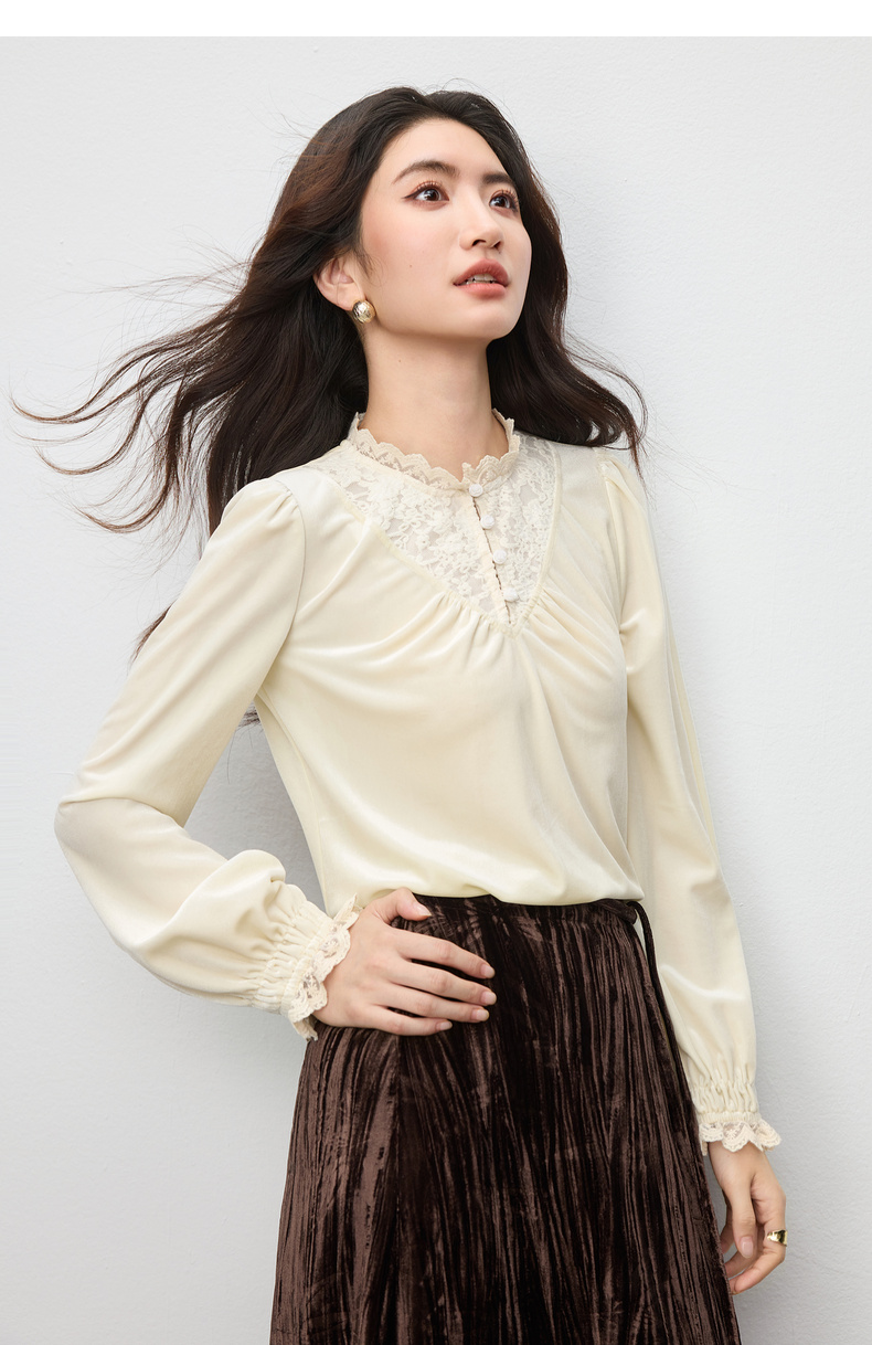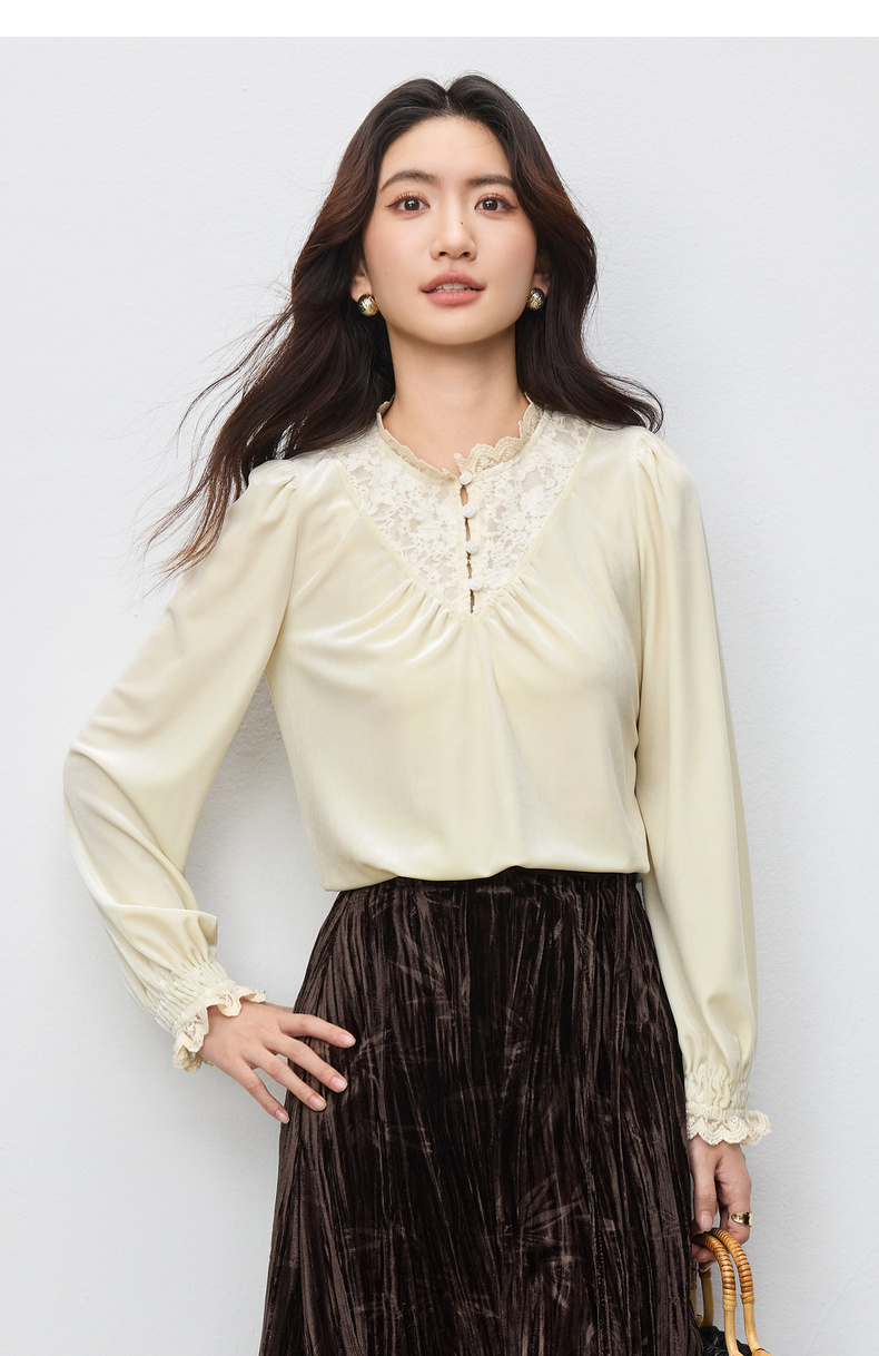 【内购】【拼接蕾丝】优雅通勤荷叶领玫瑰扣橡筋荷叶袖丝绒衬衫-153CJ3048