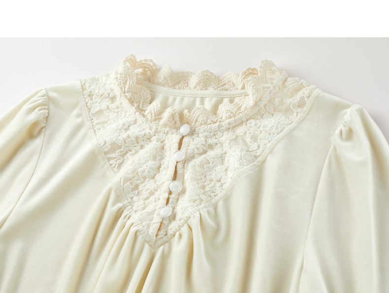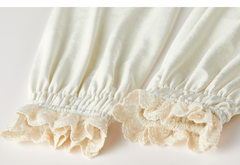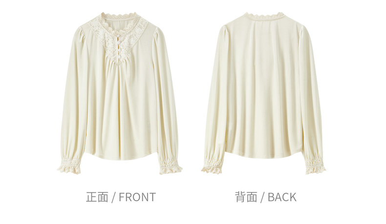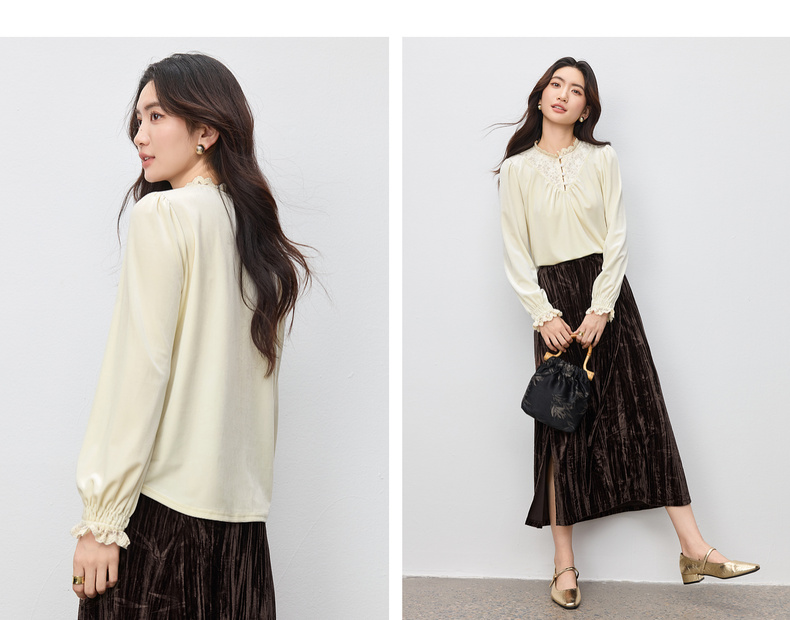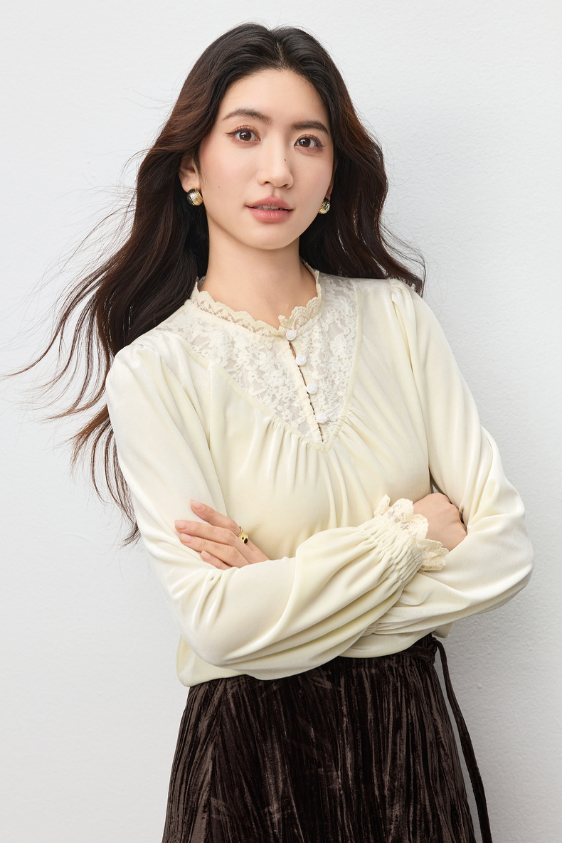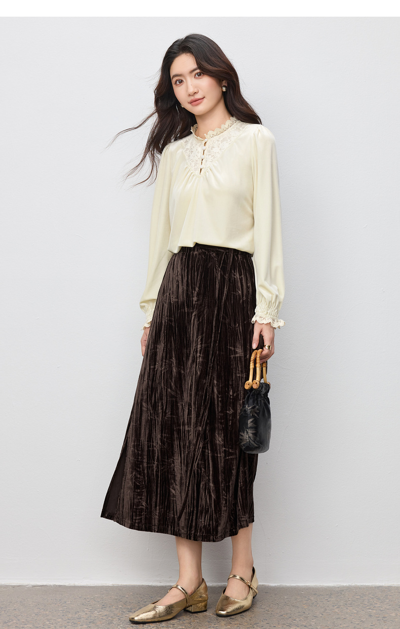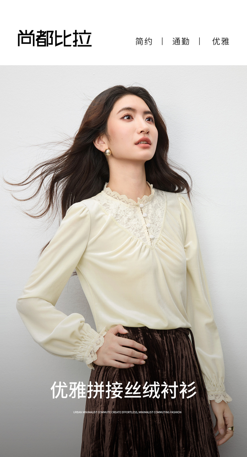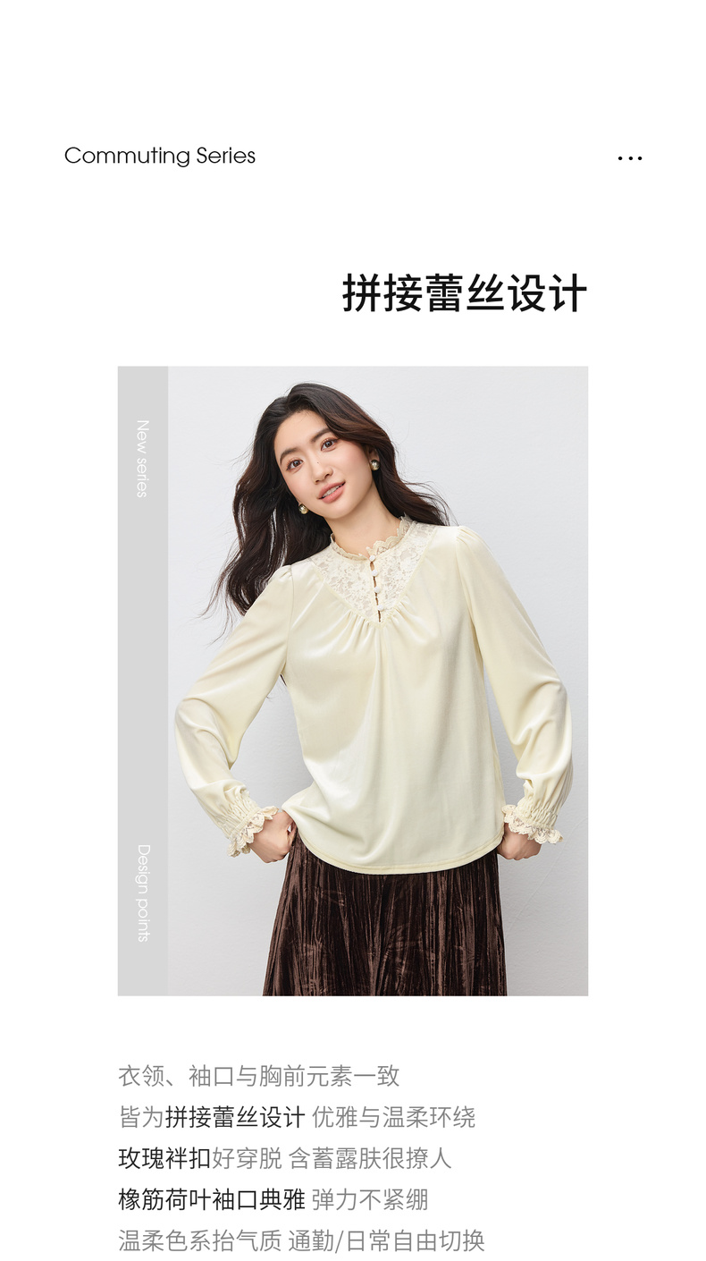 【内购】【拼接蕾丝】优雅通勤荷叶领玫瑰扣橡筋荷叶袖丝绒衬衫-153CJ3048