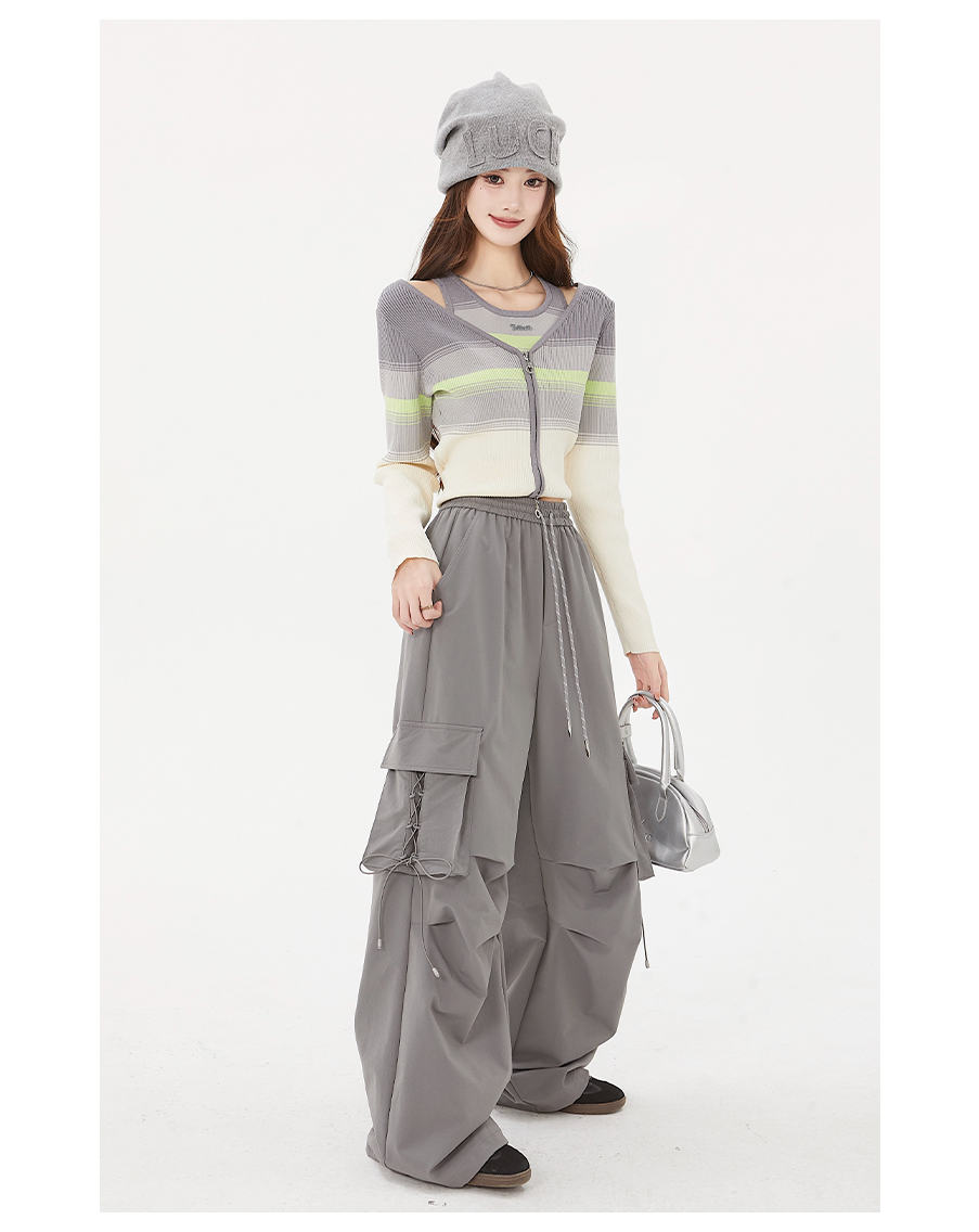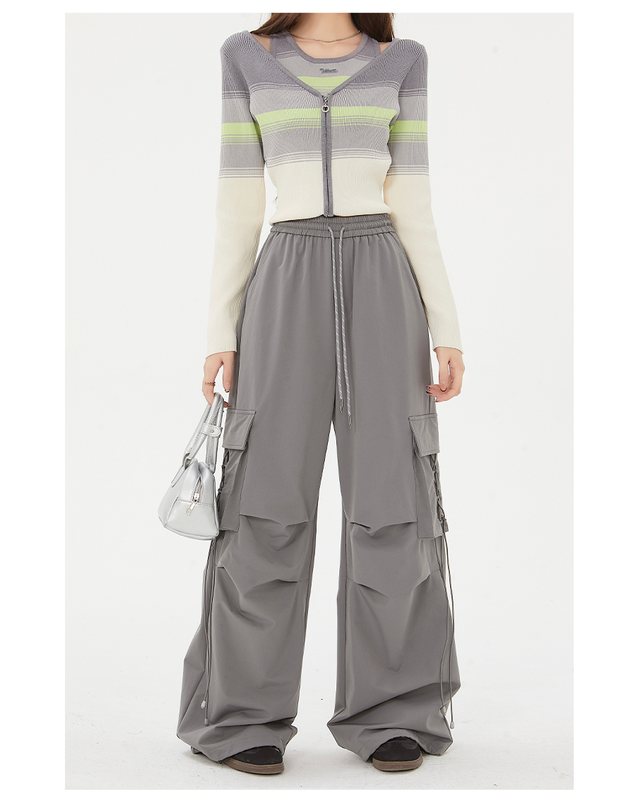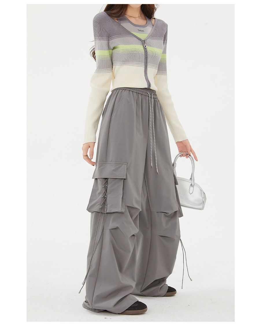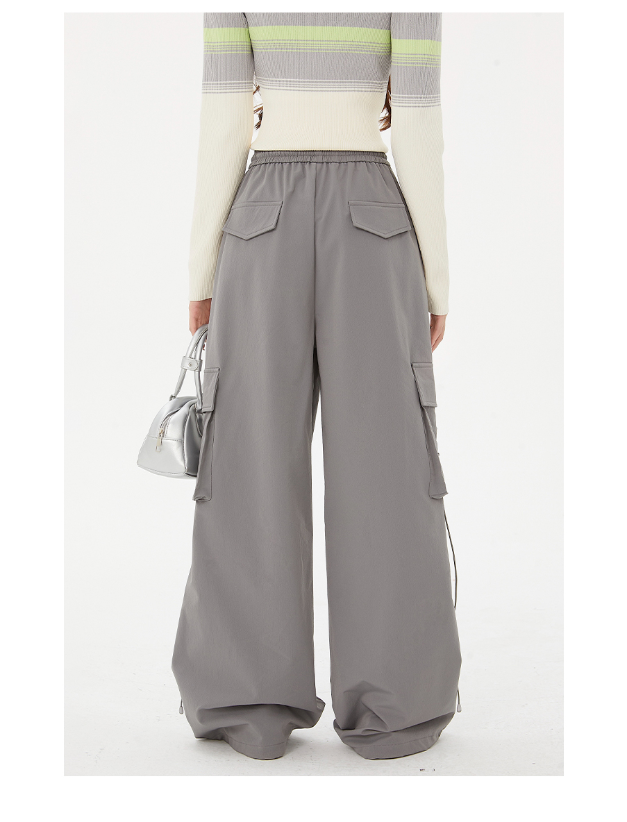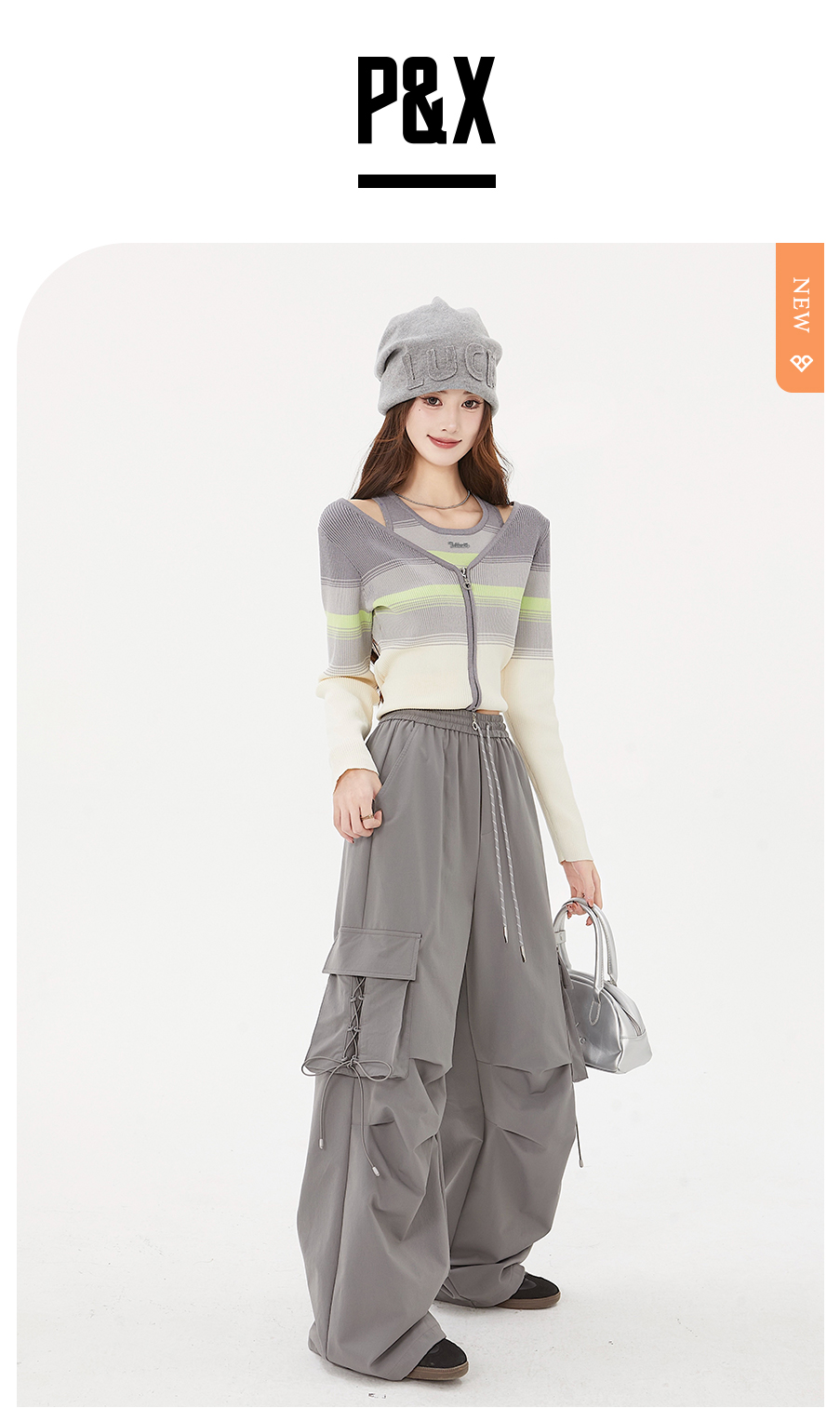 P&X设计师女装 时尚绑带设计梭织休闲长裤阔腿裤825109101 灰色