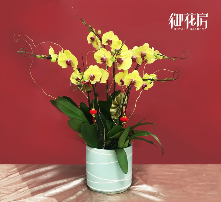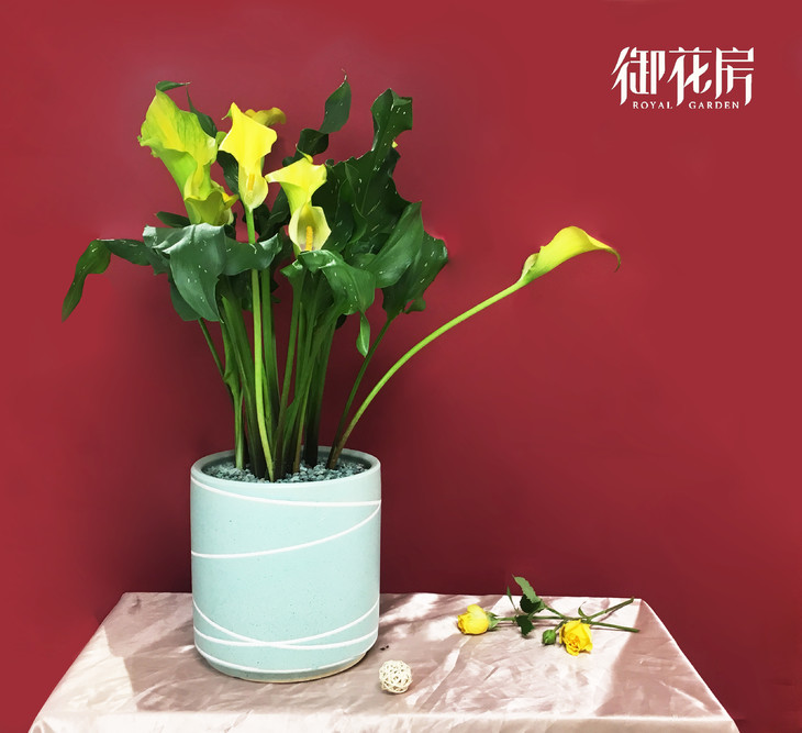 黄金万两组合为:兰花1盆+黄色马蹄莲1盆+五代同堂1盆。