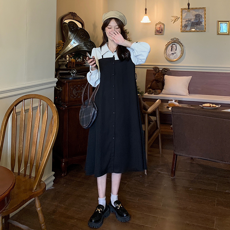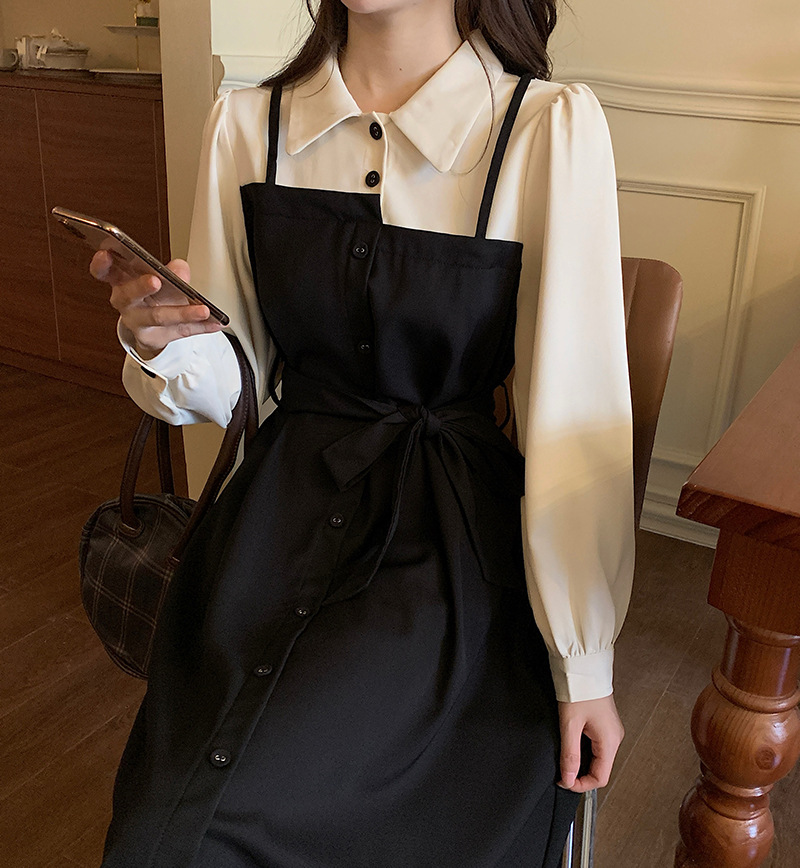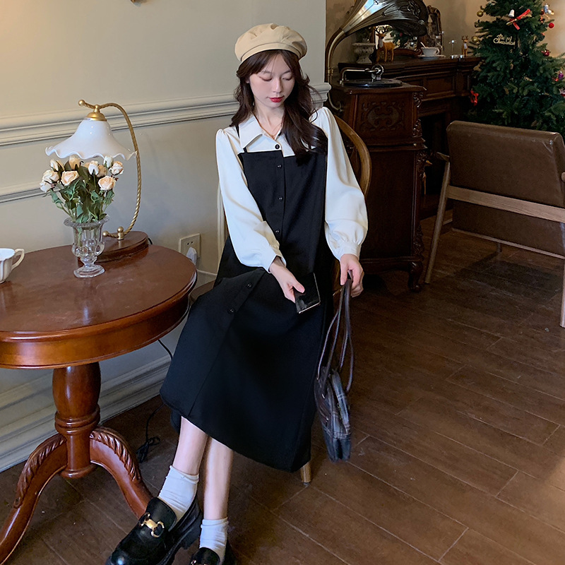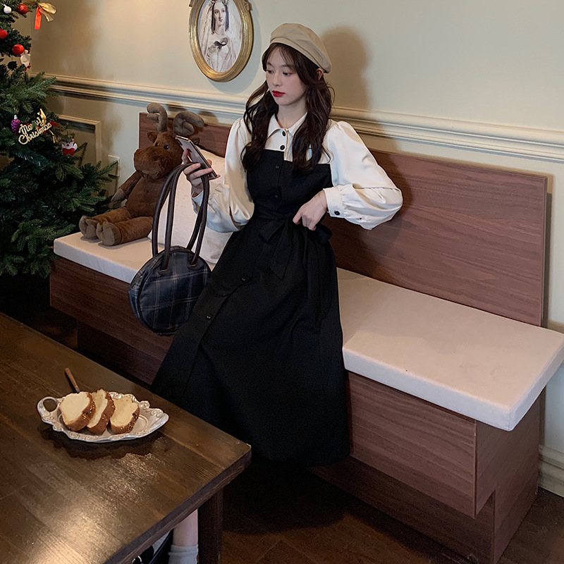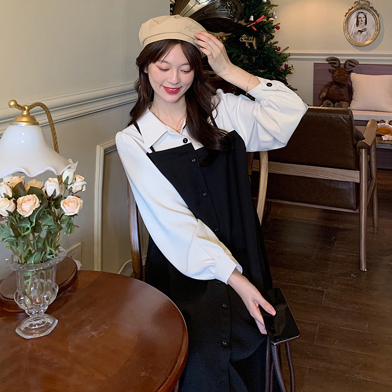 爆款秋冬假两件长袖法式连衣裙女宽松显瘦赫本风衬衫拼接背带裙子