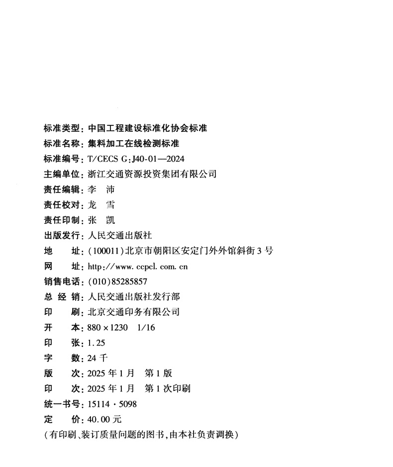 书名:集料加工在线检测标准(T/CECS G:J40-01—2024)