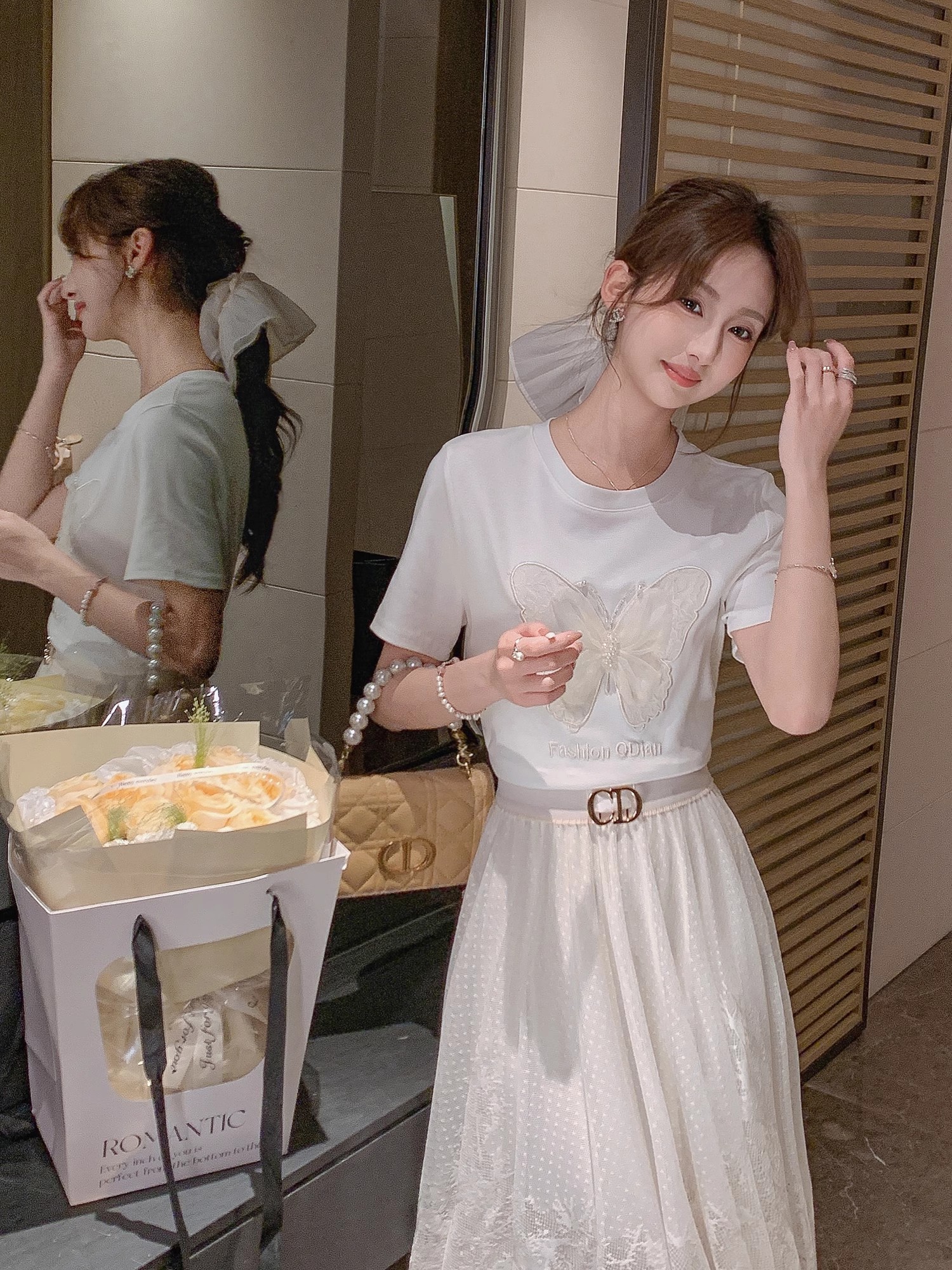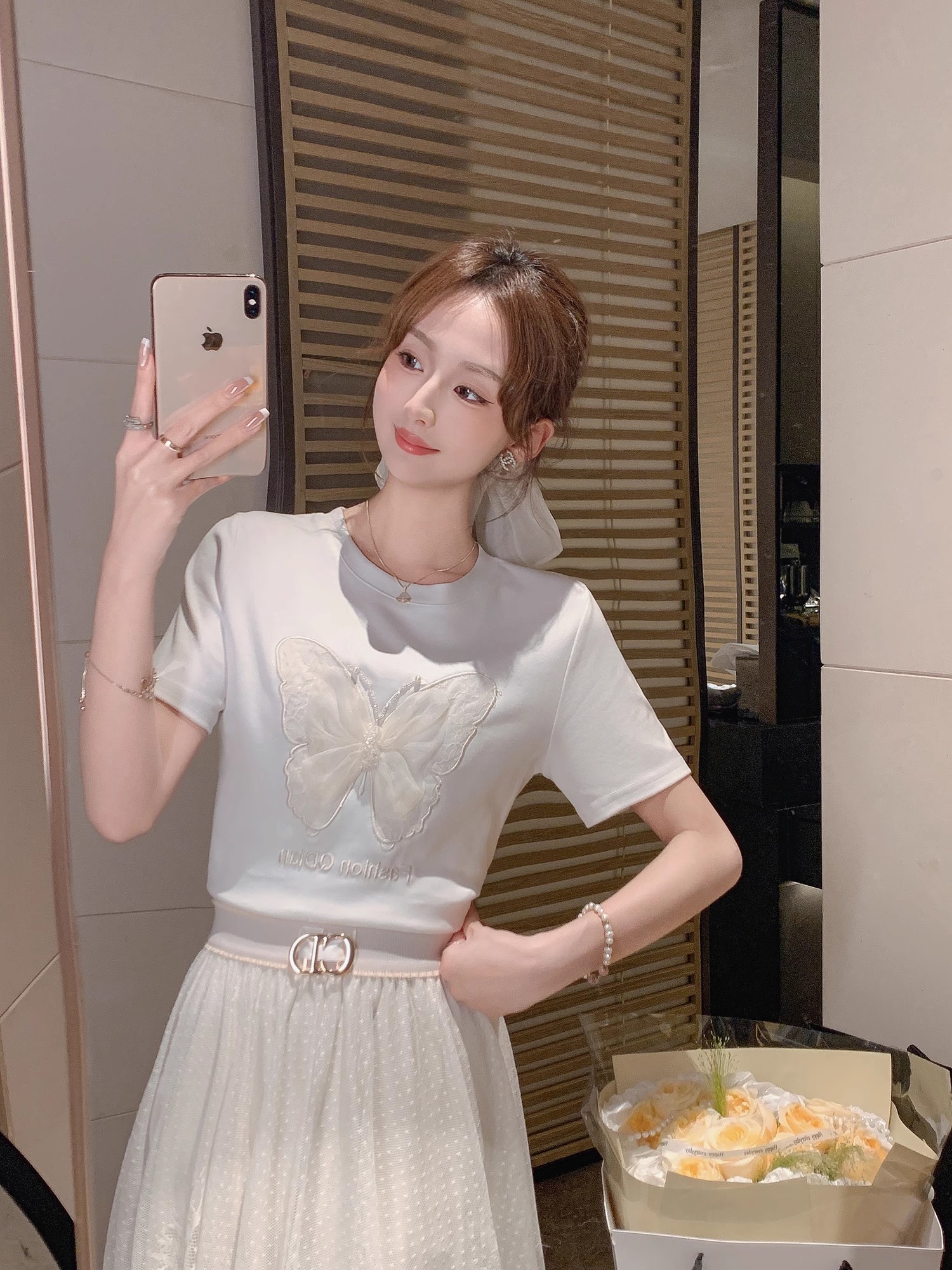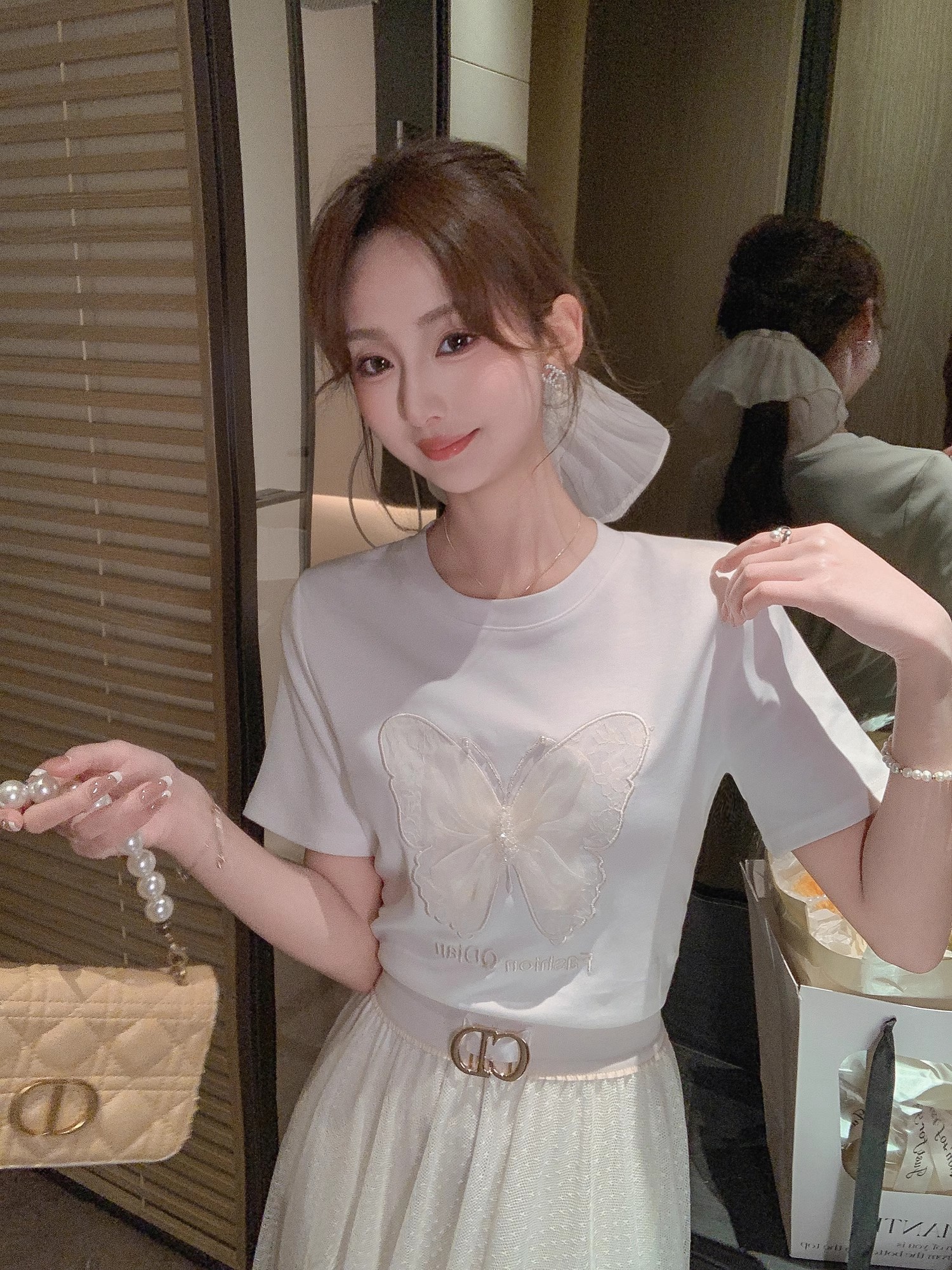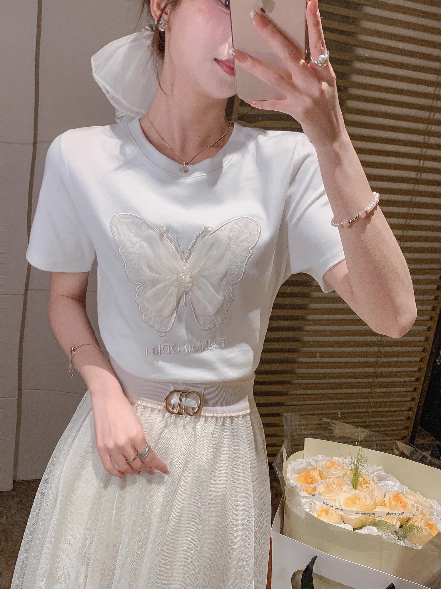 张心子【网纱蝴蝶T】春夏圆领弹力重工刺绣T恤上衣 U2502047