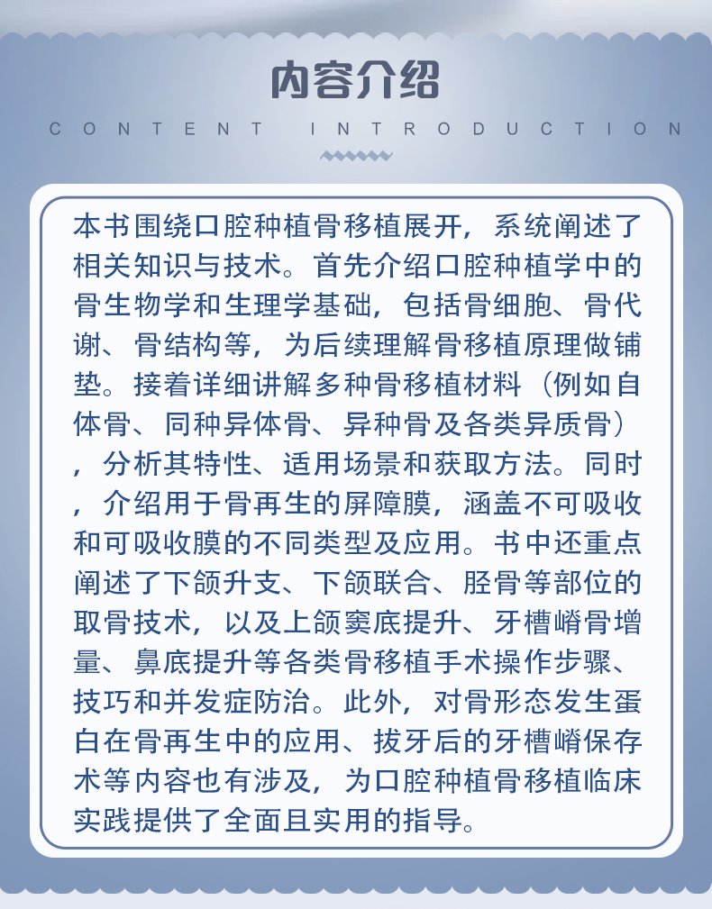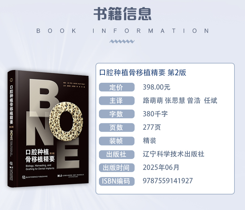本书围绕口腔种植骨移植展开,系统阐述了相关知识与技术。首先介绍口腔种植学中的骨生物学和生理学基础,包括骨细胞、骨代谢、骨结构等,为后续理解骨移植原理做铺垫。接着详细讲解多种骨移植材料(例如自体骨、同种异体骨、异种骨及各类异质骨),分析其特性、适用场景和获取方法。同时,介绍用于骨再生的屏障膜,涵盖不可吸收和可吸收膜的不同类型及应用。书中还重点阐述了下颌升支、下颌联合、胫骨等部位的取骨技术,以及上颌窦底提升、牙槽嵴骨增量、鼻底提升等各类骨移植手术操作步骤、技巧和并发症防治。此外,对骨形态发生蛋白在骨再生中的应用、拔牙后的牙槽嵴保存术等内容也有涉及,为口腔种植骨移植临床实践提供了全面且实用的指导。