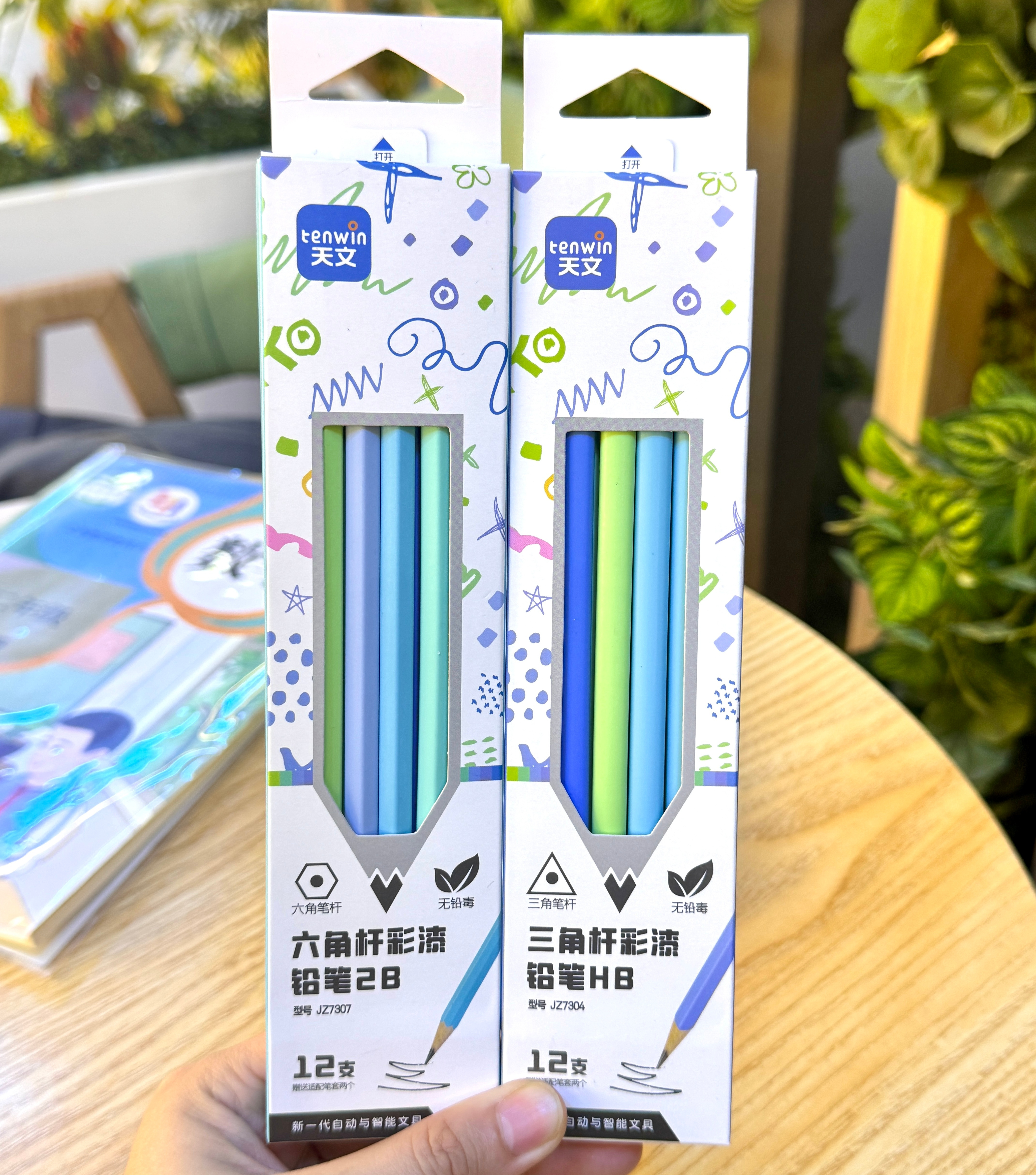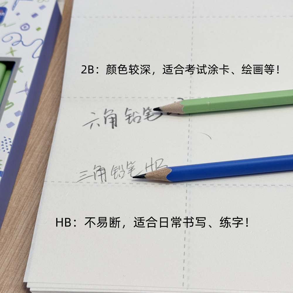 两款可选 🟦三角杆-HB(矫正握姿,适合初学者、幼儿园) 🟨六角杆-2B(握感舒适,适合有书写基础孩子) 外表做彩漆!颜值超高!是让孩子们一眼就爱上的童话色!笔杆色彩明亮柔和,放在笔袋里一眼就能找到!