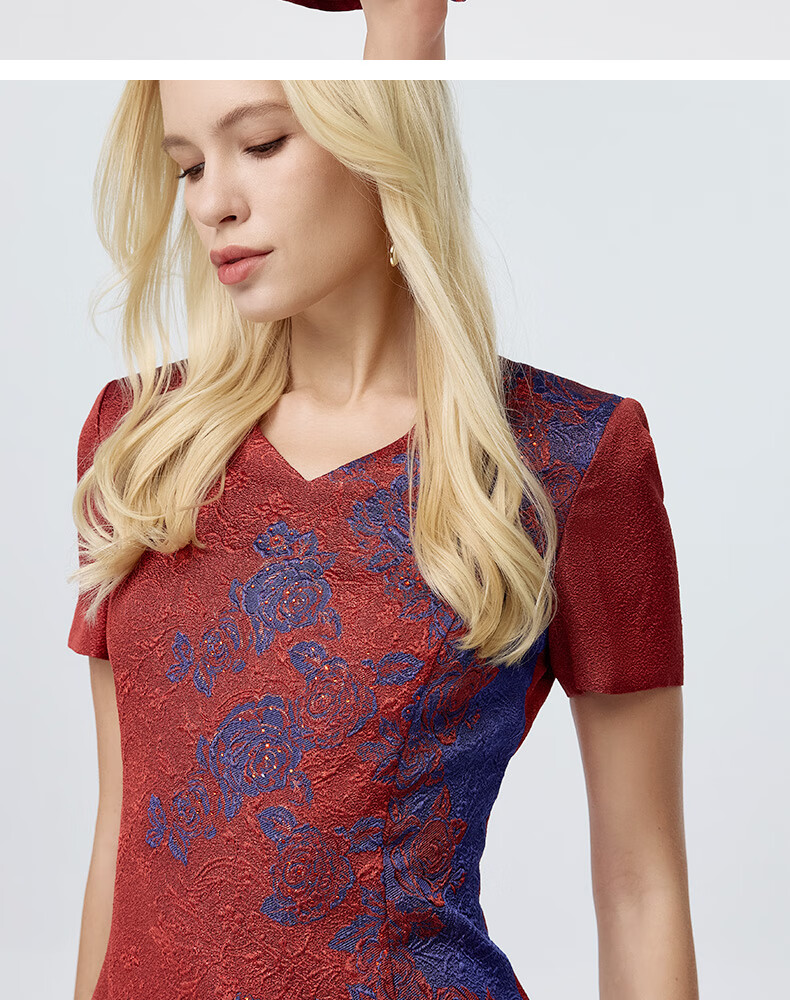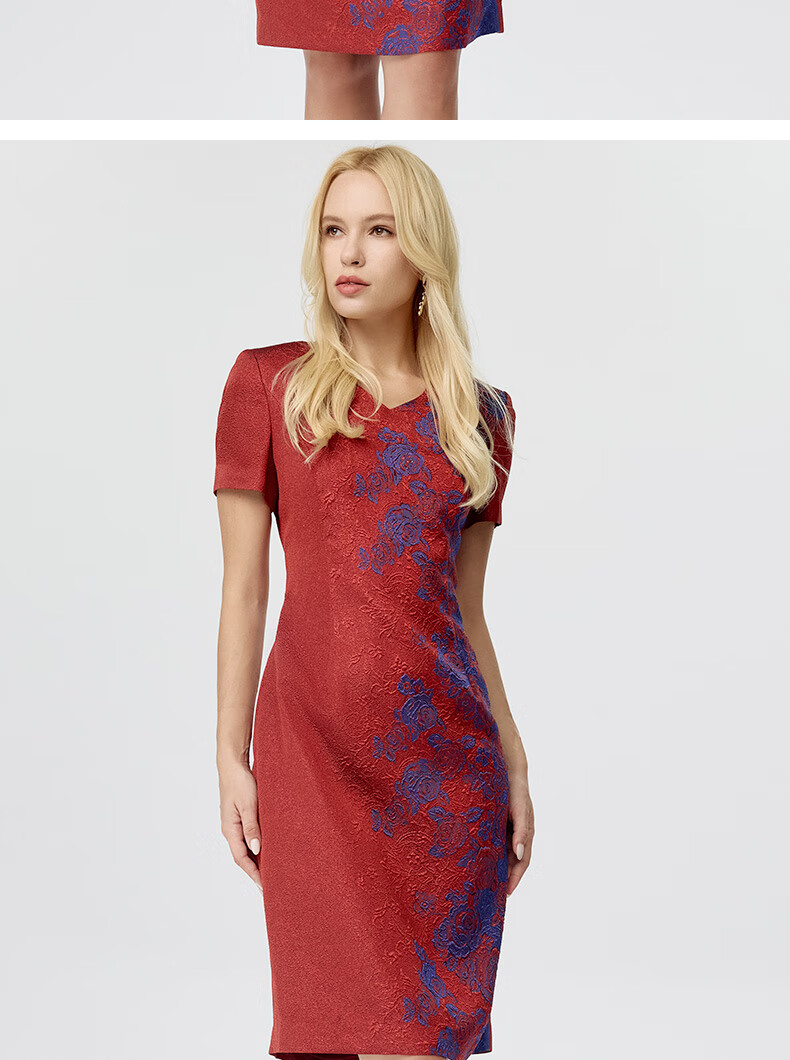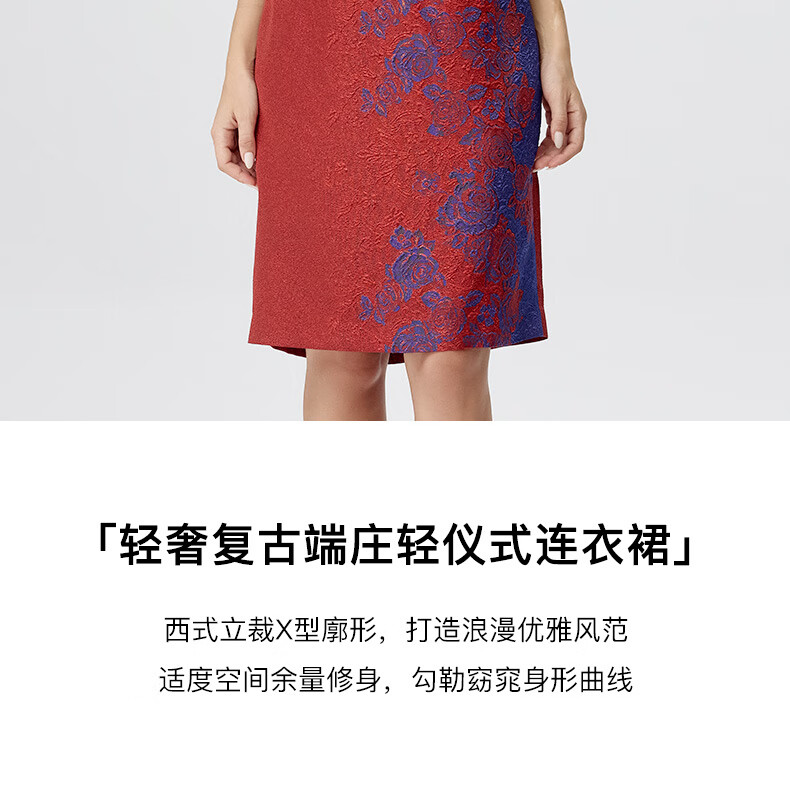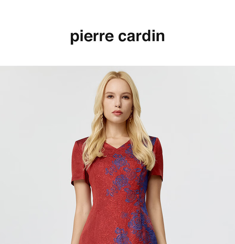 皮尔卡丹女装连衣裙夏季红色短袖蓝色印花法式复古裙P3218D3126X0
