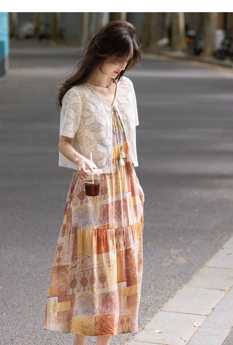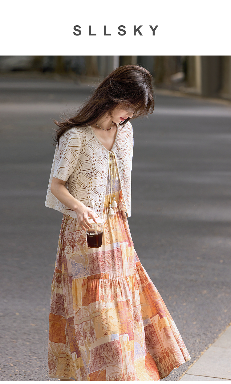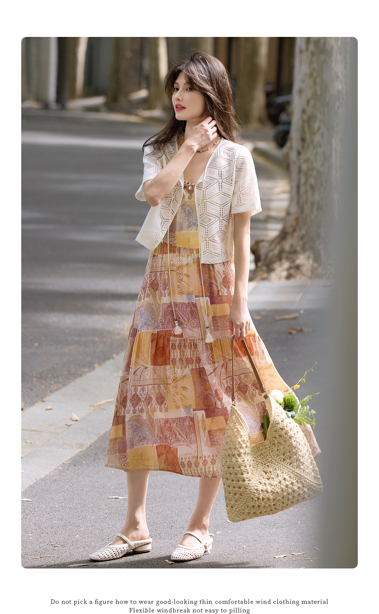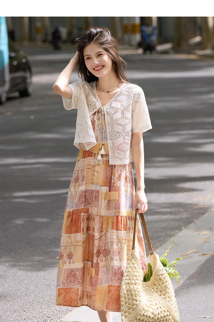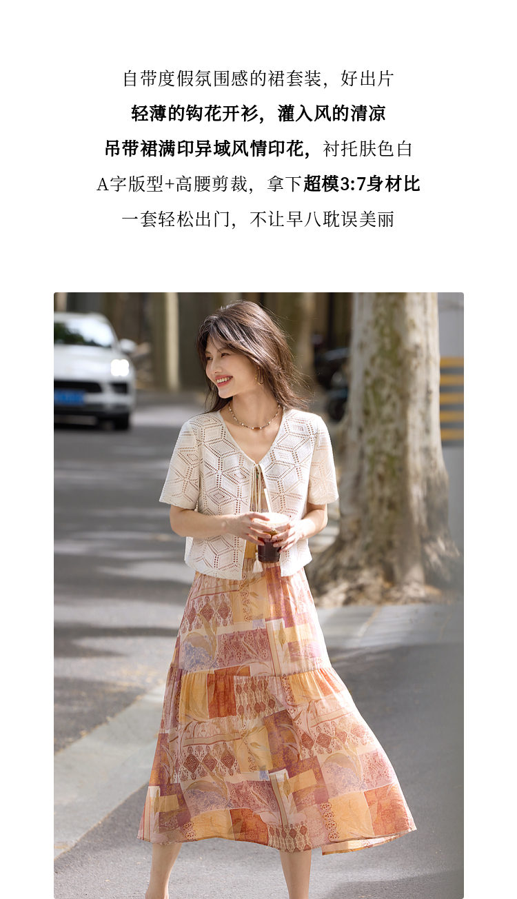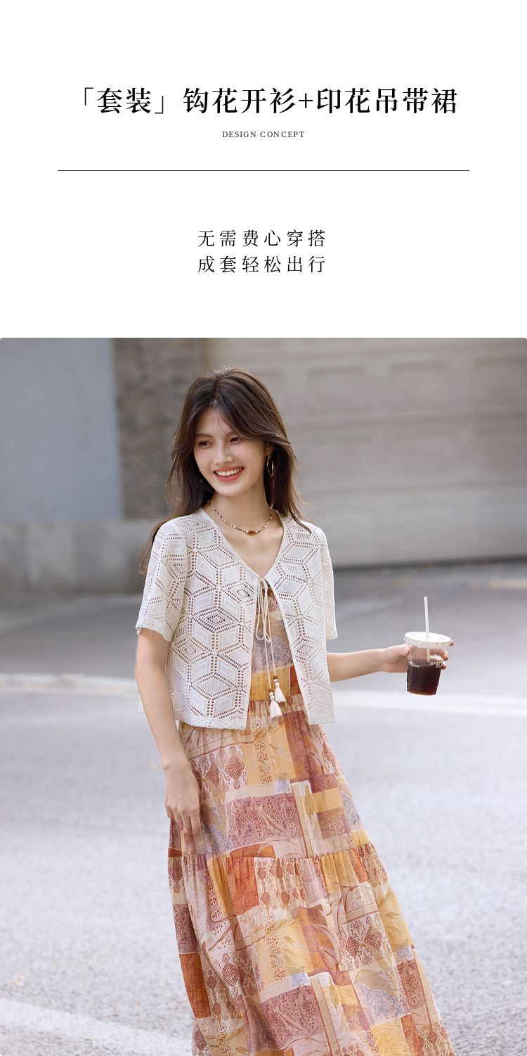 【08/06新品】熙世界波西米亚风套装裙女夏季镂空钩花开衫印花吊带连衣裙两件套