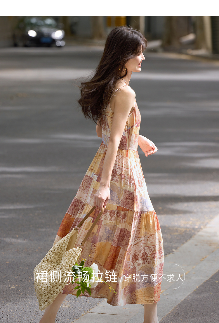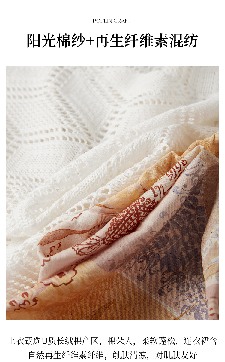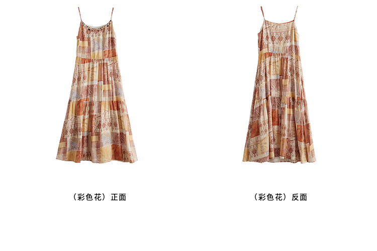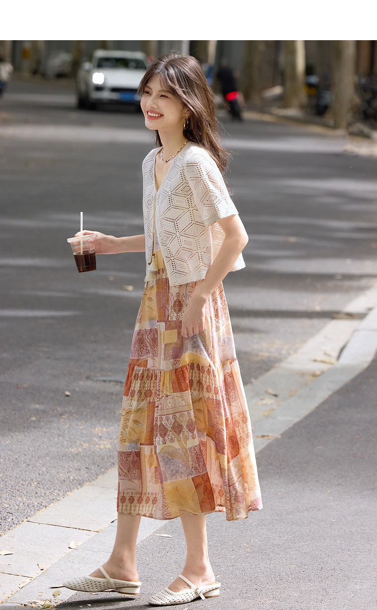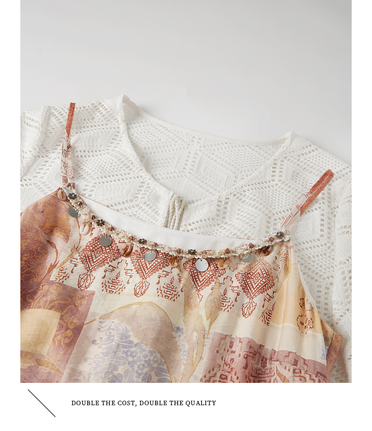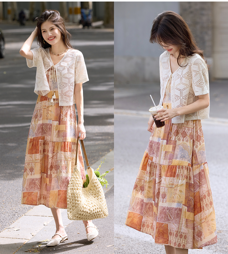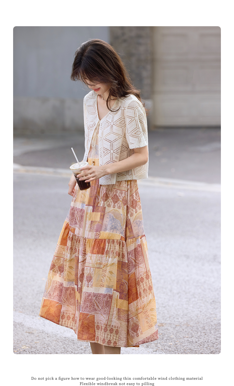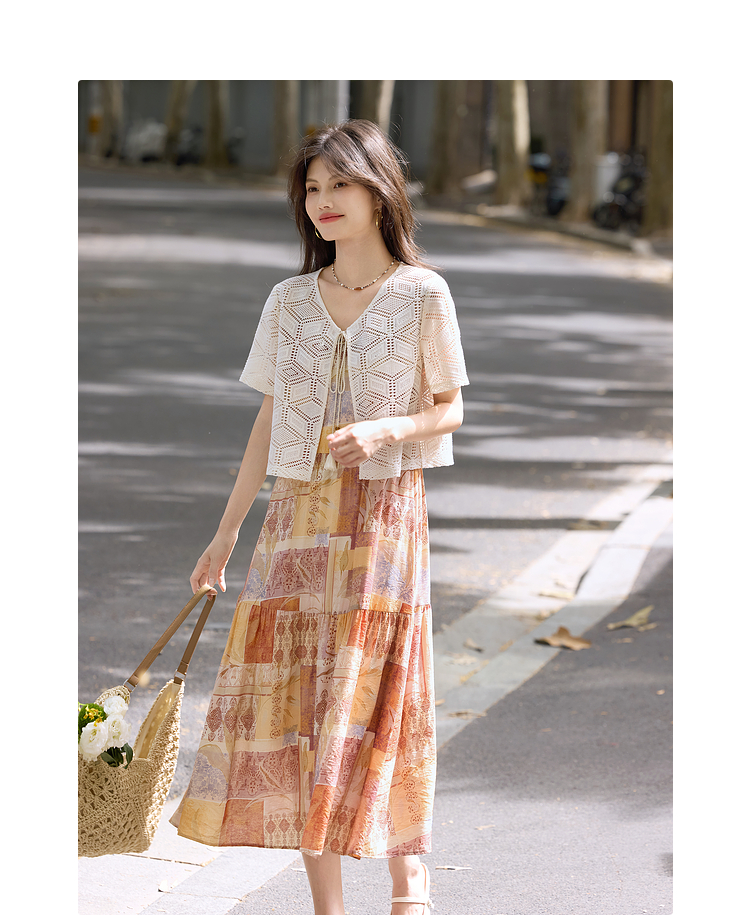 【08/06新品】熙世界波西米亚风套装裙女夏季镂空钩花开衫印花吊带连衣裙两件套