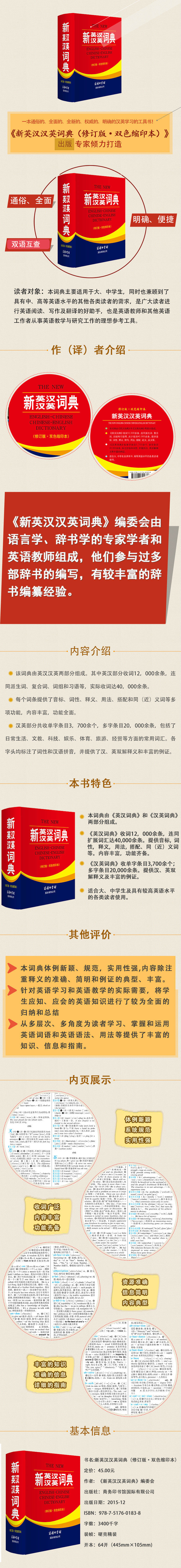 《新英汉汉英词典(修订版·双色缩印本)》由《英汉词典》和《汉英词典》两部分组成。