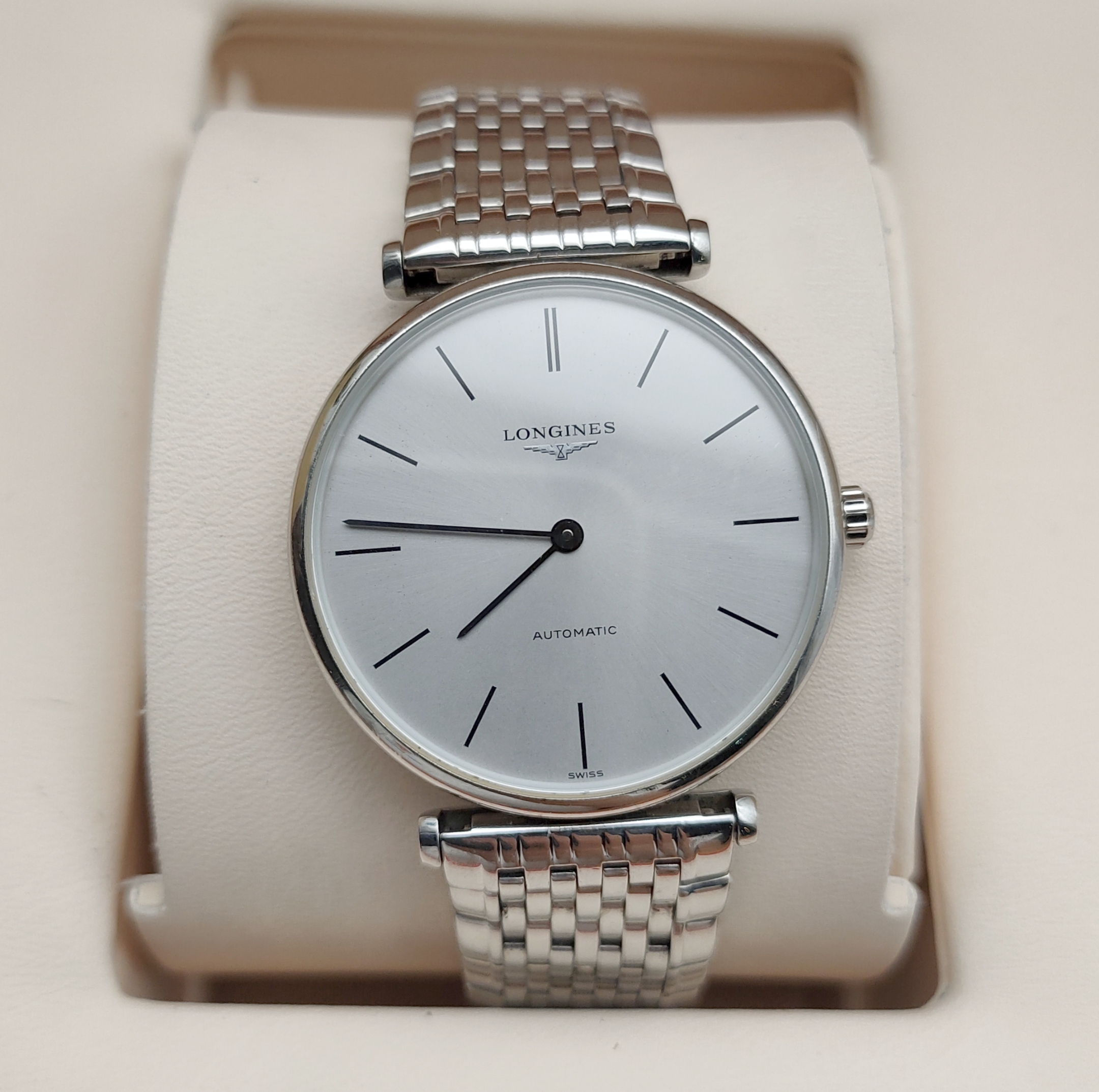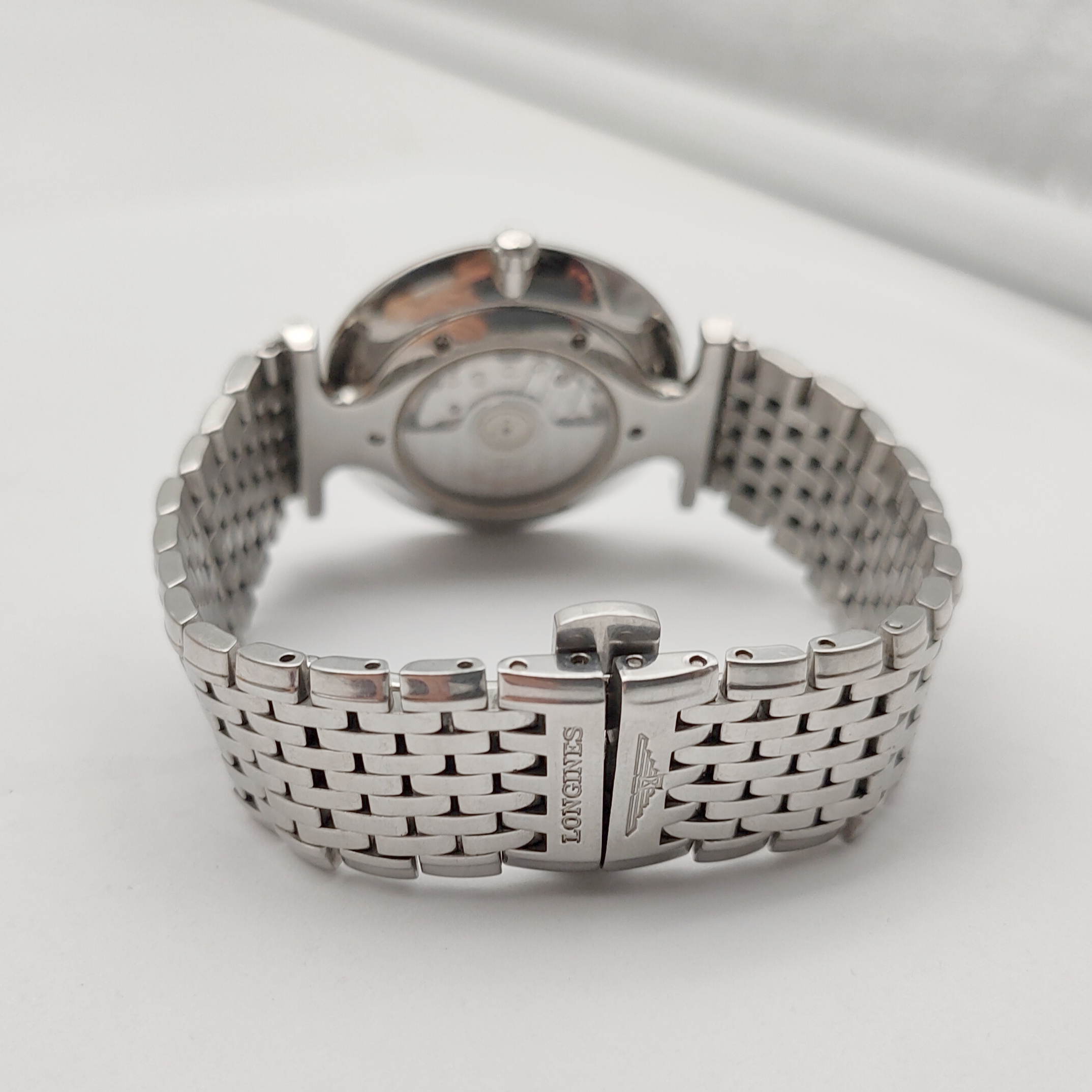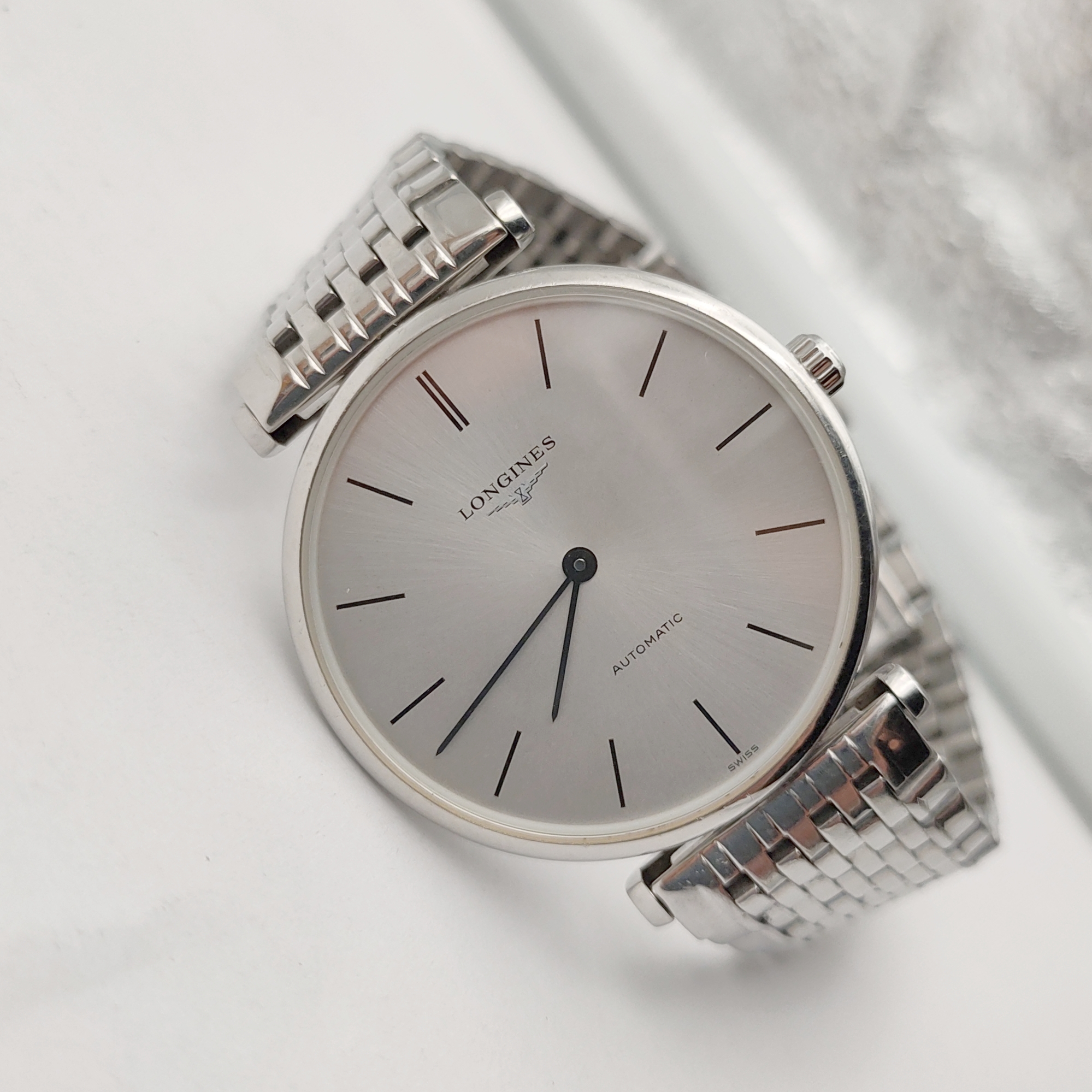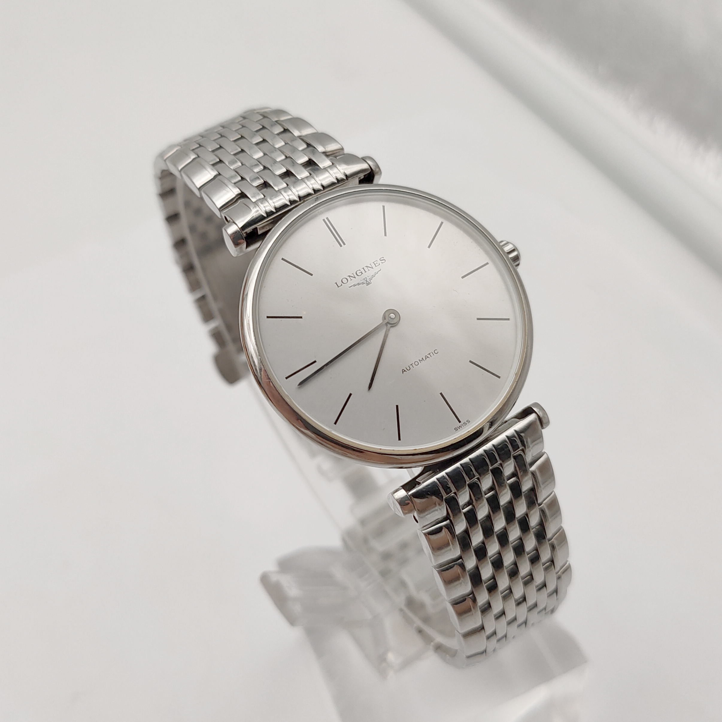 浪琴优雅系列L4.708.4.72.6中性机械表,34mm表径,银白色表盘,条形刻度,黑色指针,精钢表壳表链,9成新,附件保卡购物票,2012年购买,专柜价11700,现好价