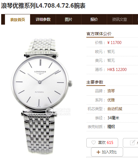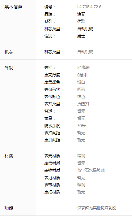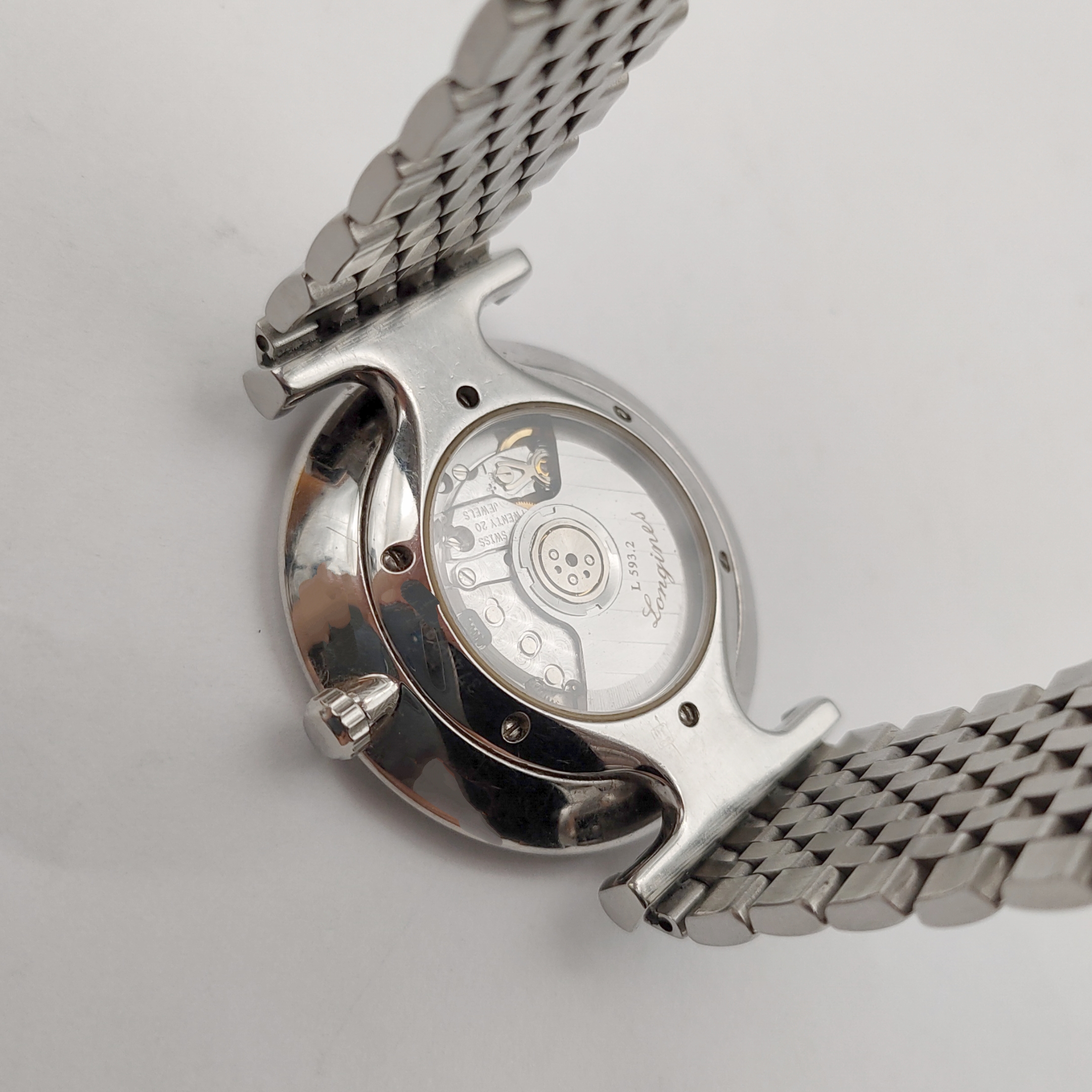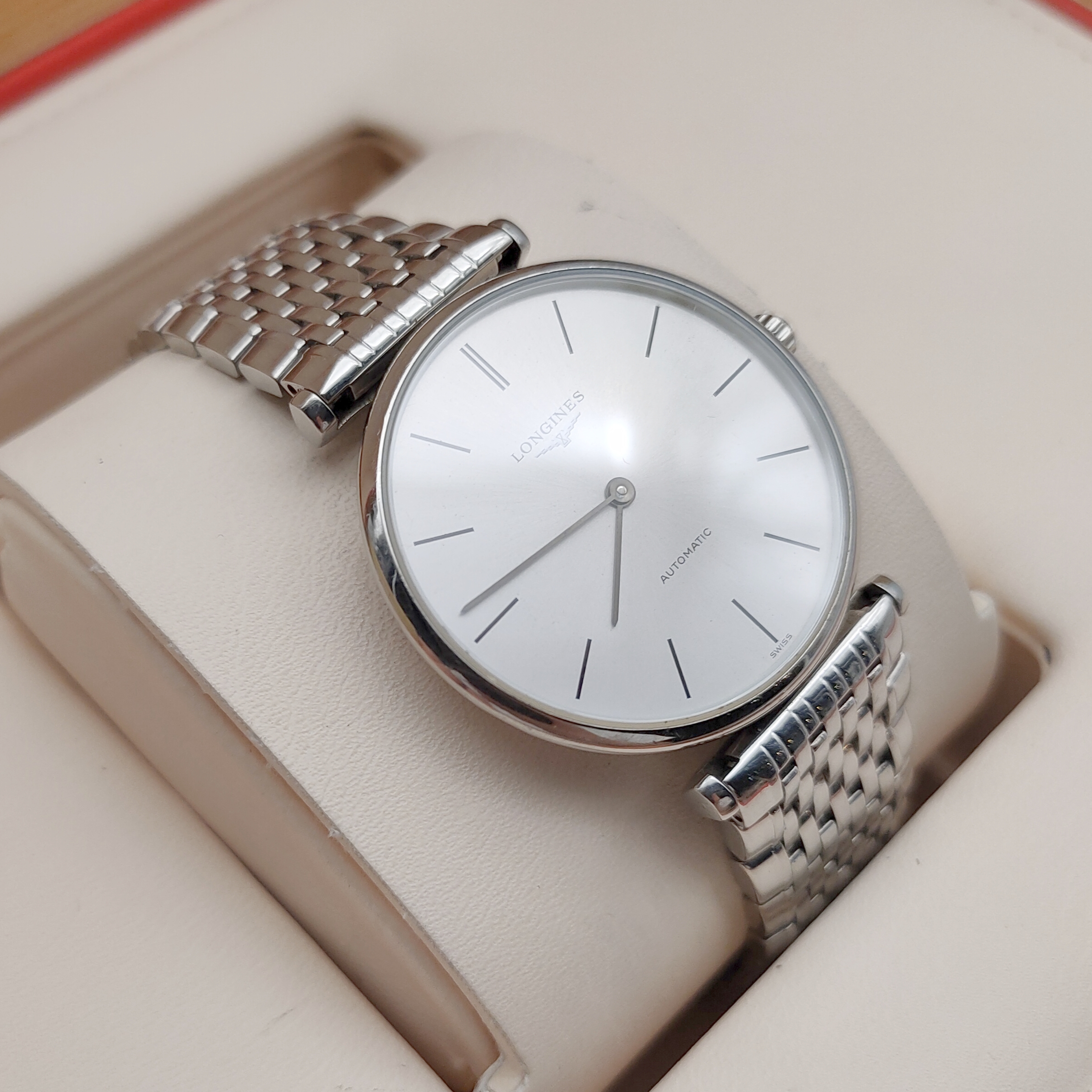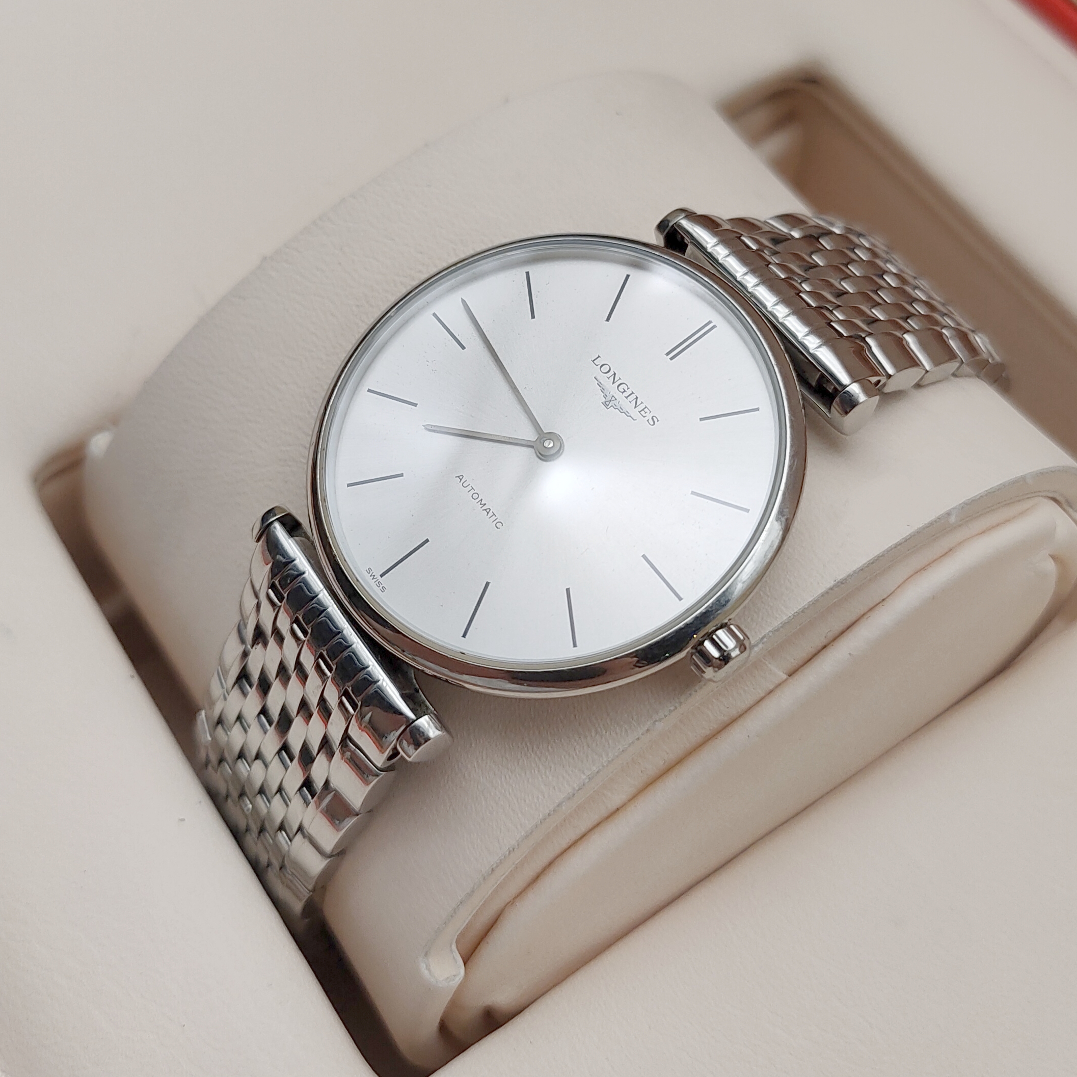 浪琴优雅系列L4.708.4.72.6中性机械表,34mm表径,银白色表盘,条形刻度,黑色指针,精钢表壳表链,9成新,附件保卡购物票,2012年购买,专柜价11700,现好价