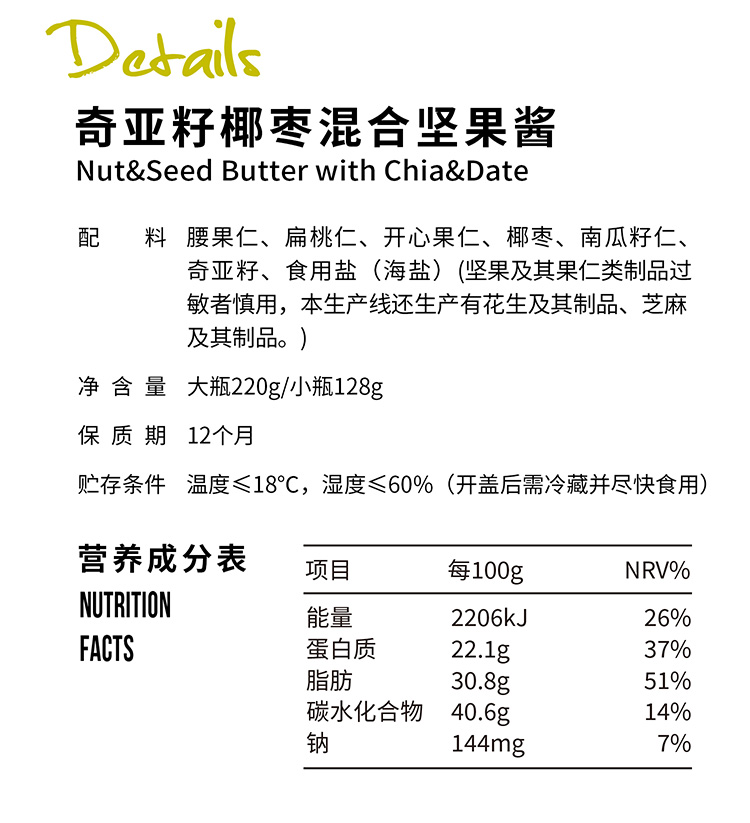 RICH&LIGHT 奇亚籽椰枣混合坚果酱 128g