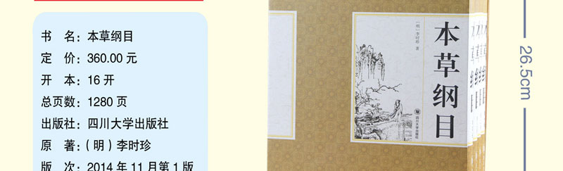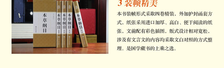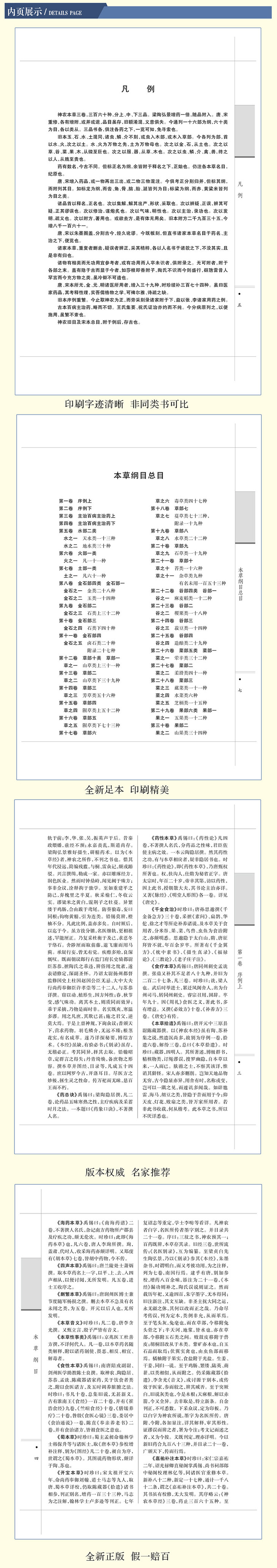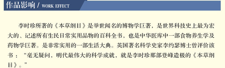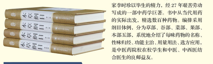 《本草纲目》是我国明代杰出的医药学家李时珍以毕生的精力,经27年艰苦劳动写成的一部中药学巨著。书中从当代用药的实际出发,精选数百种药物。编排采用纲目体例,分为草部、谷部、菜部、果部、本部五部,系统地介绍了每味药物的名称、性味归经、功能主治、用量用法、选方应用,是中医药院校在校学生和中医、中西医结合医生的良师益友。