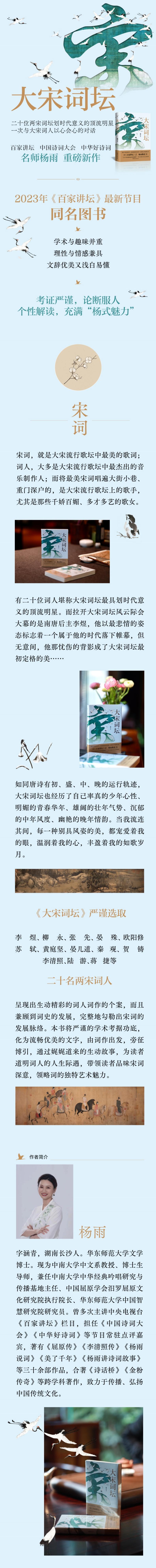 《大宋词坛》为杨雨2023年近期新百家讲坛节目同名图书,选取了贺铸、晏几道、秦观、黄庭坚、苏轼、欧阳修、张先、晏殊、李煜、柳永等二十名宋代著名词人,不仅呈现出生动精彩的词人词作的个案,而且兼顾到词史的发展,完整地勾勒出宋词的发展脉络。本书将严谨的学术考据功底,化为流畅优美的文字,由词作出发,旁征博引,通过娓娓道来的生动故事,为读者道明词人的人生际遇,带领读者品味宋词深意,领略词的独特艺术魅力。