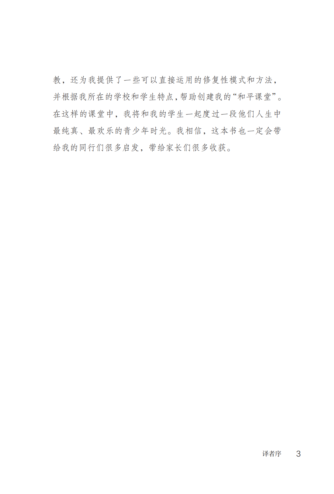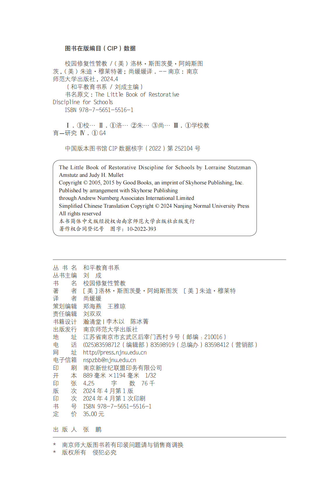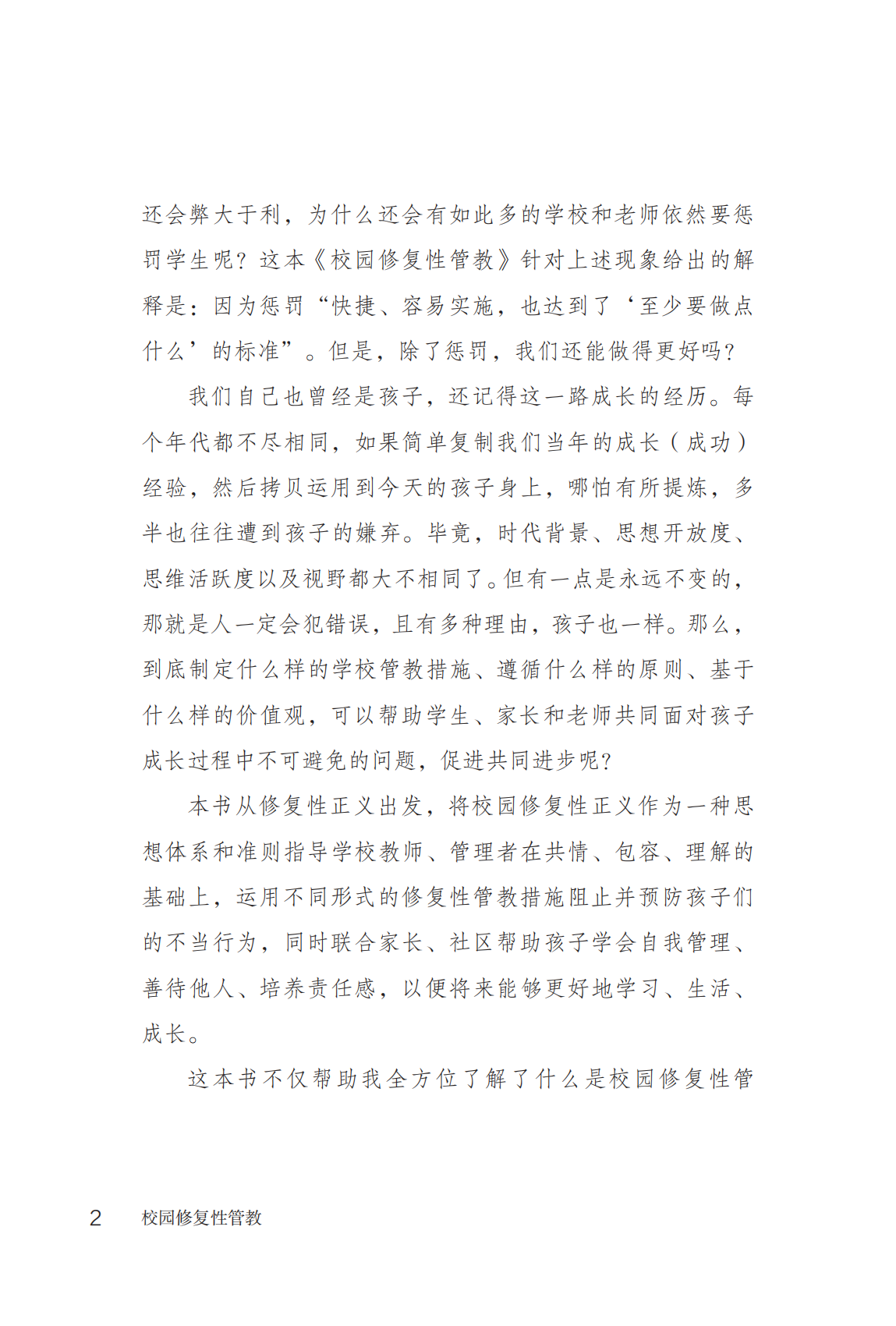 制定什么样的学校管教措施、遵循什么样的原则、基于什么样的价值观,可以帮助学生、家长和老师共同面对孩子成长过程中不可避免的问题,促进共同进步呢?本书从将校园修复性正义作为一种思想体系和准则,指导学校教师和管理者在共情、包容、理解的基础上,运用不同形式的修复性管教措施,阻止并预防孩子们的不当行为,同时联合家长、社区帮助孩子学会自我管理、善待他人、培养责任感,以便其将来能更好地学习、生活和成长。本书不仅全面介绍了什么是校园修复性管教,还提供了一些可以直接运用的修复性模式和方法,有利于教育工作者根据学校和学生的特点创建“和平课堂”。本书适合教育工作者、家长和学生共同阅读,携手共建和平校园。