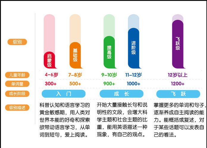 参考美国测评体系,根据中国孩子的英语水平和认知能力,结合读物内容难度,分为五大级别,满足3-16岁孩子不同年龄段阅读成长需求。