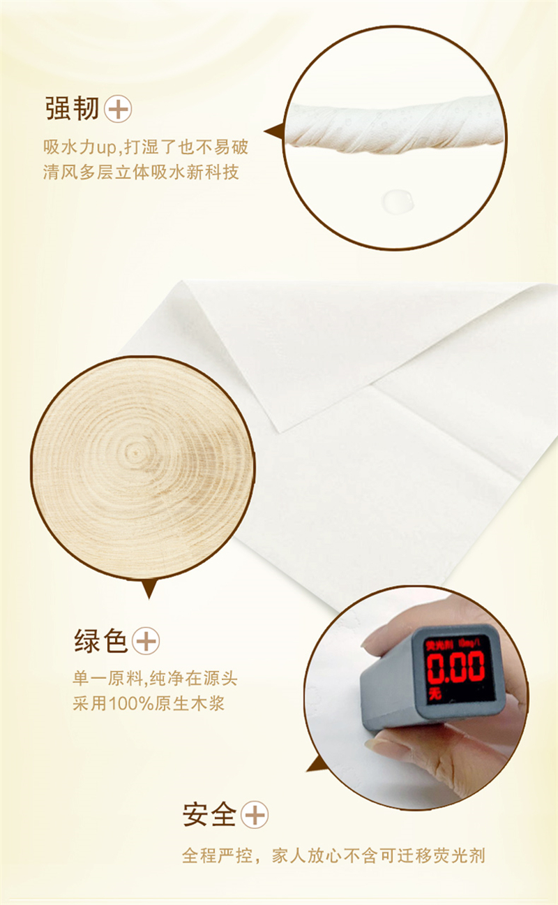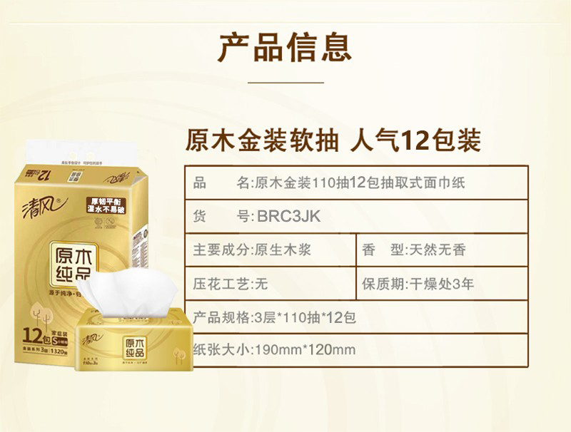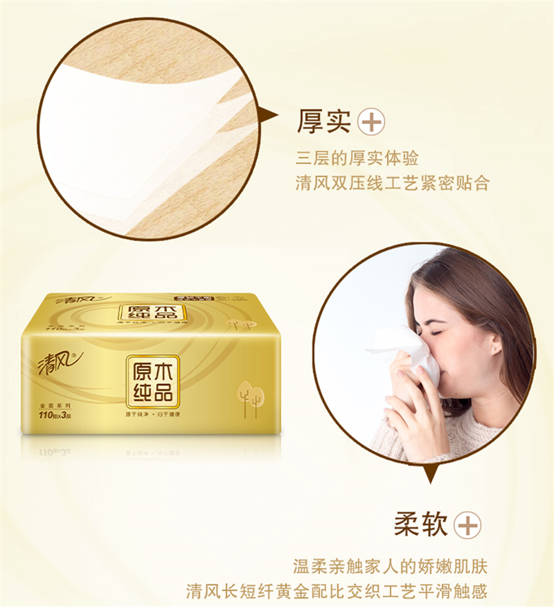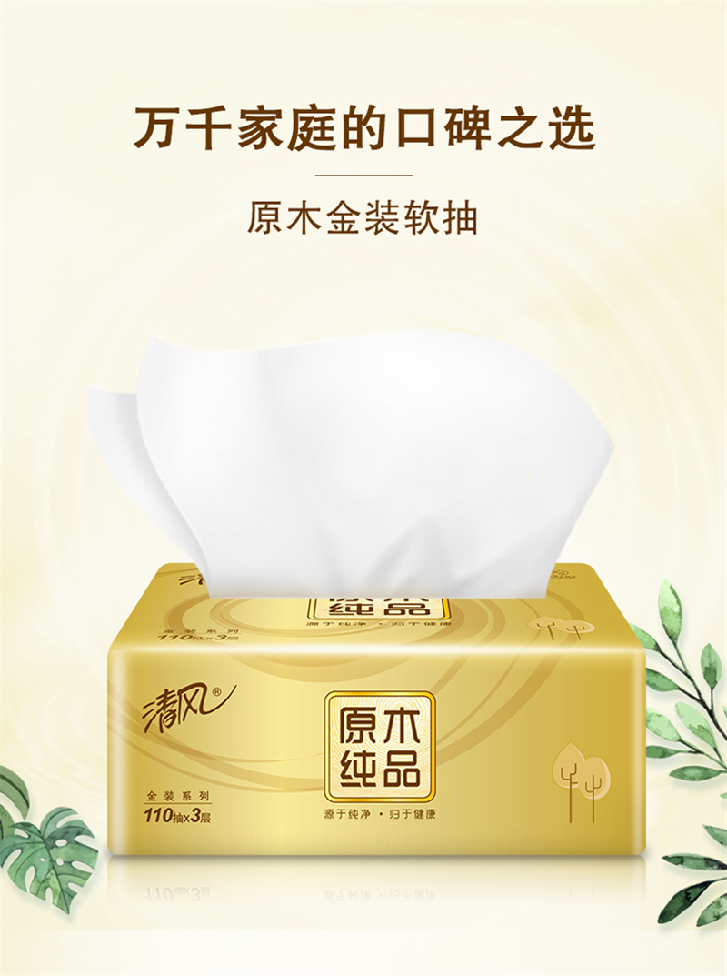 清风原木纯品金装系列 清风3层110抽24包(2提)(母婴可用)(新老包装交替发货)