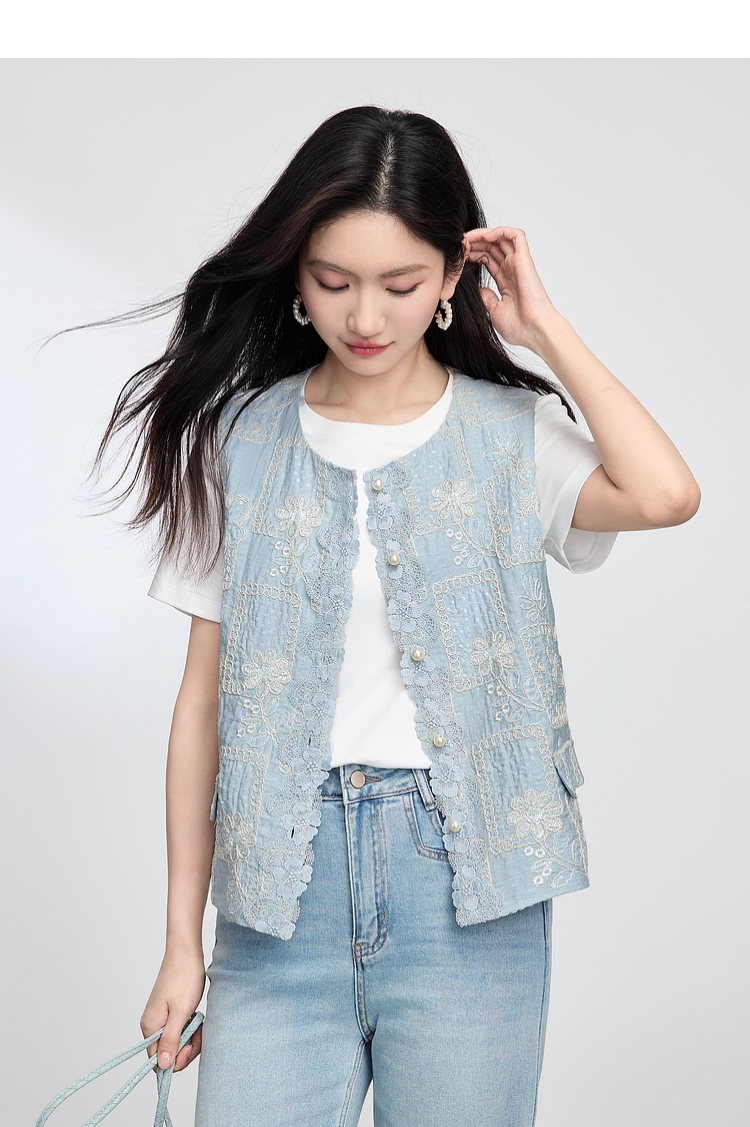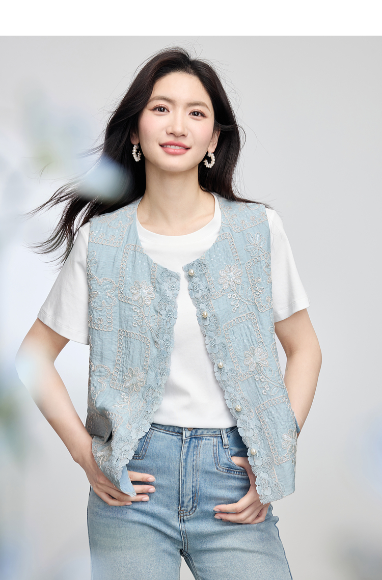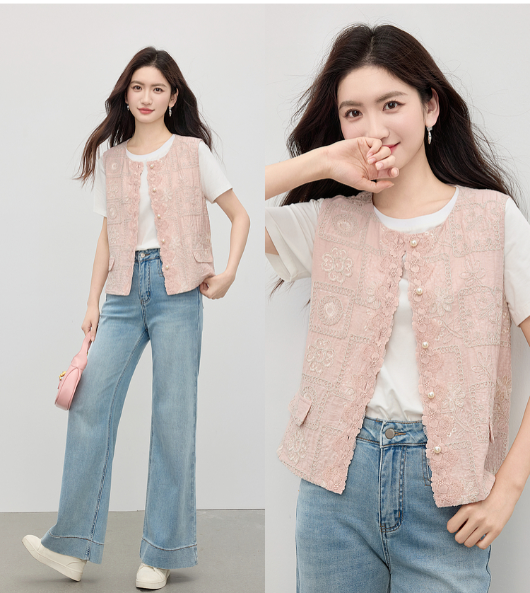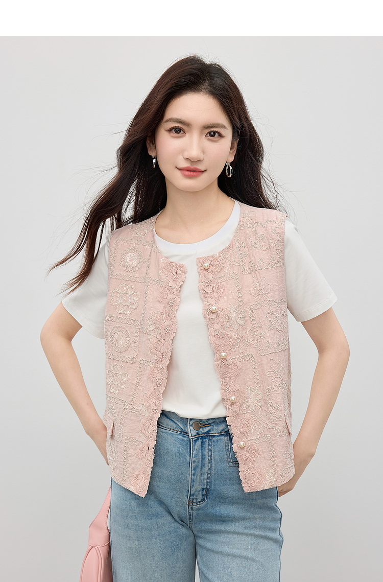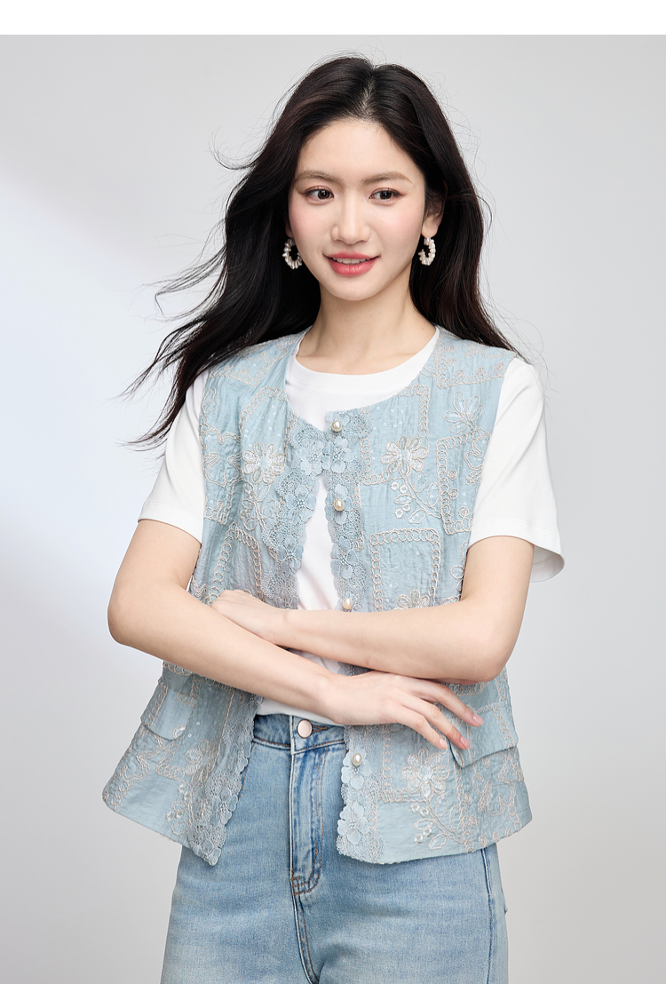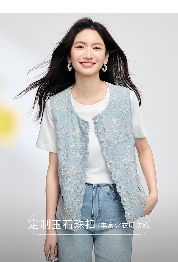 【年货节】熙世界国风蕾丝绣花马甲背心女夏薄款2025新中式圆领无袖坎肩上衣