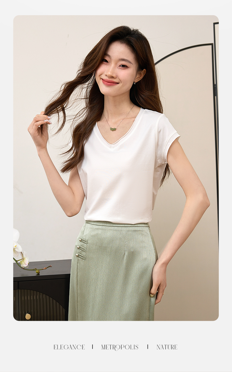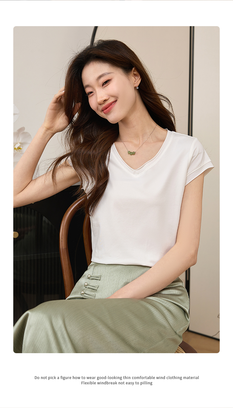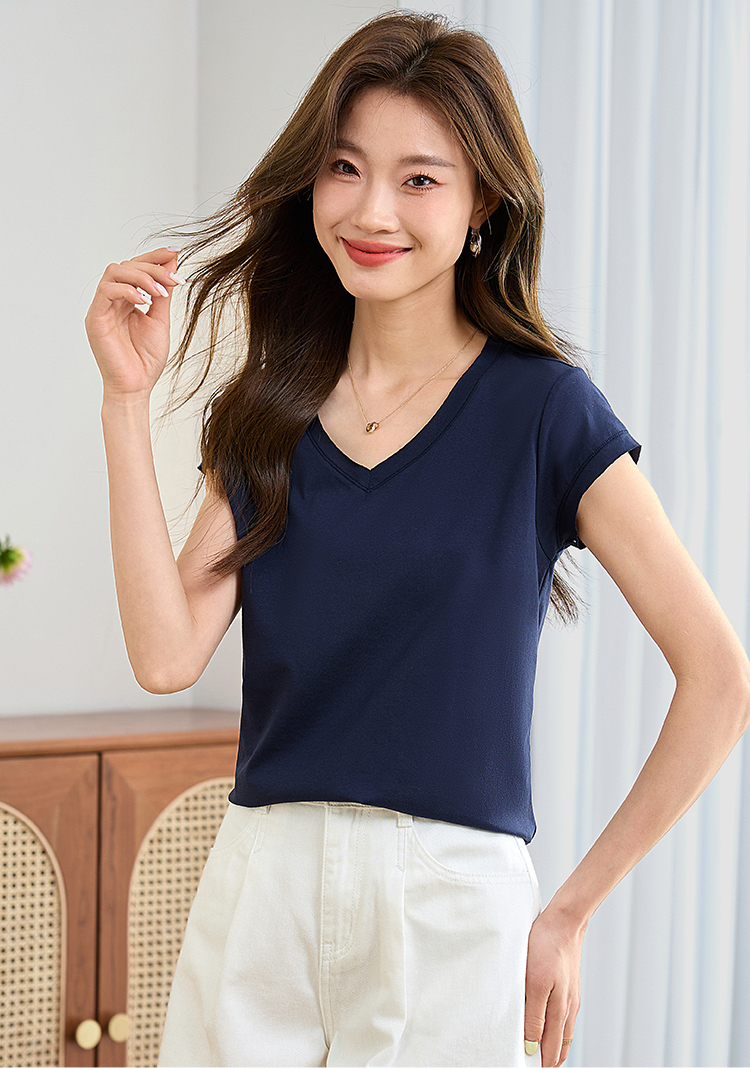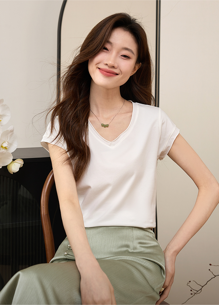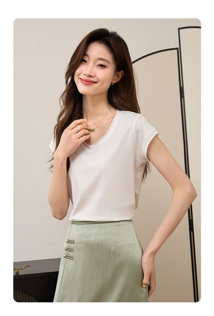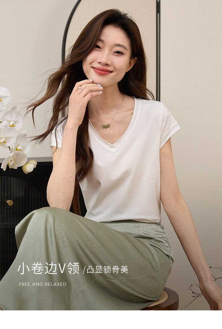 【专属特价】熙世界多色短袖基础款卷边纯色体恤打底外穿V领百搭T恤上衣166ST253