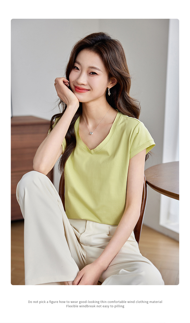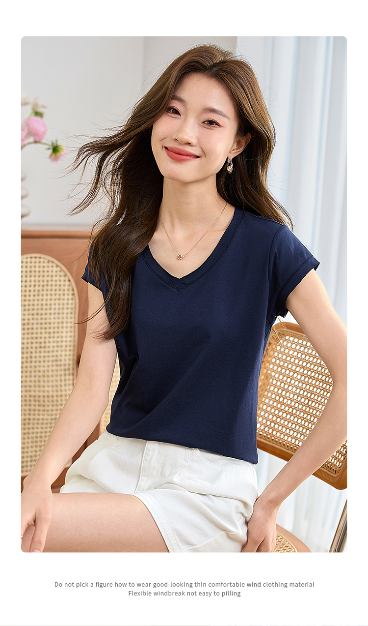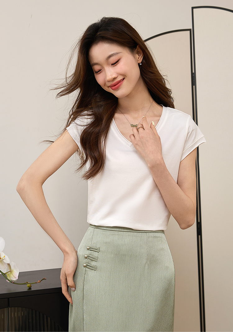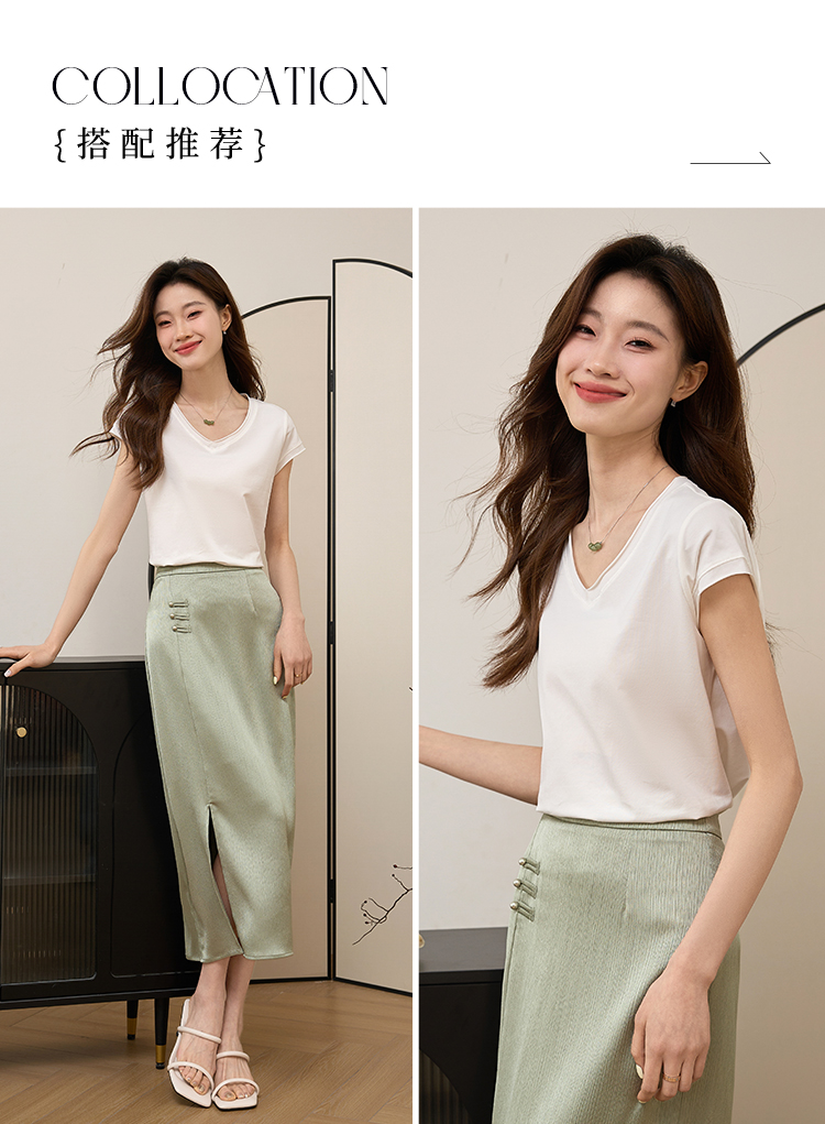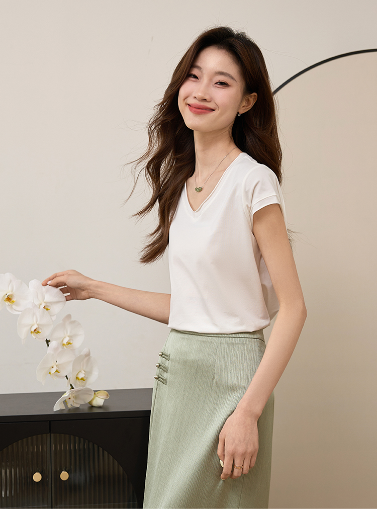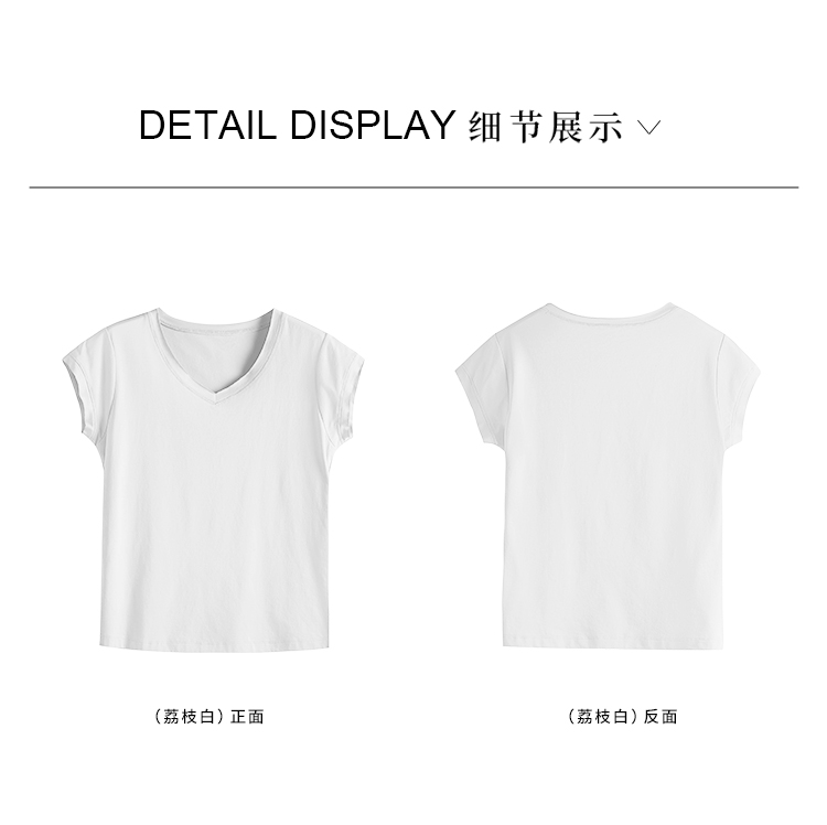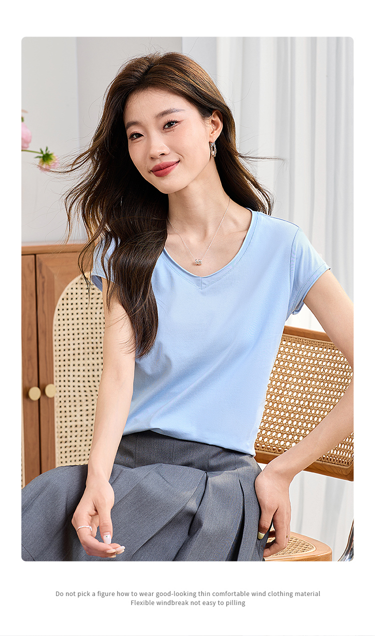 【专属特价】熙世界多色短袖基础款卷边纯色体恤打底外穿V领百搭T恤上衣166ST253