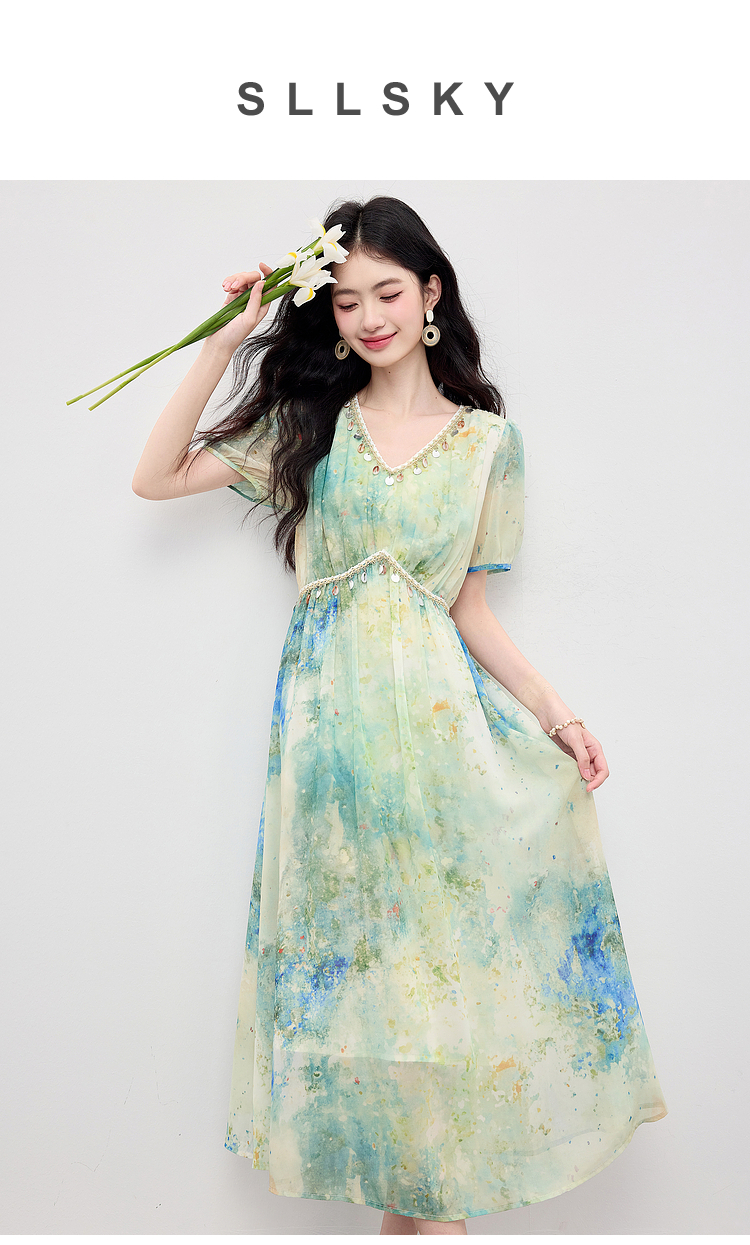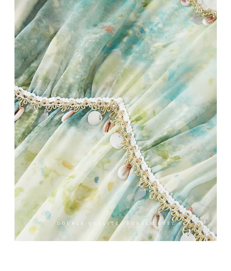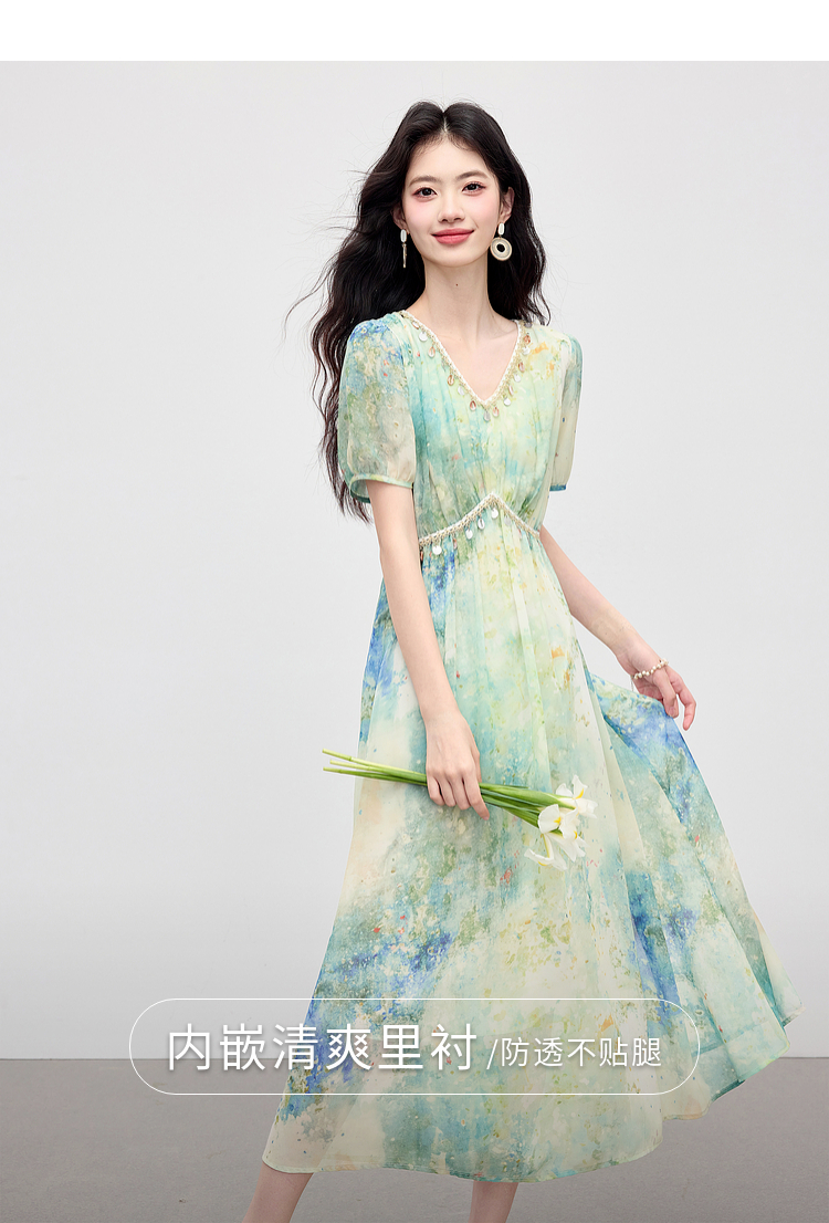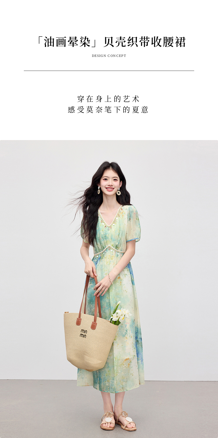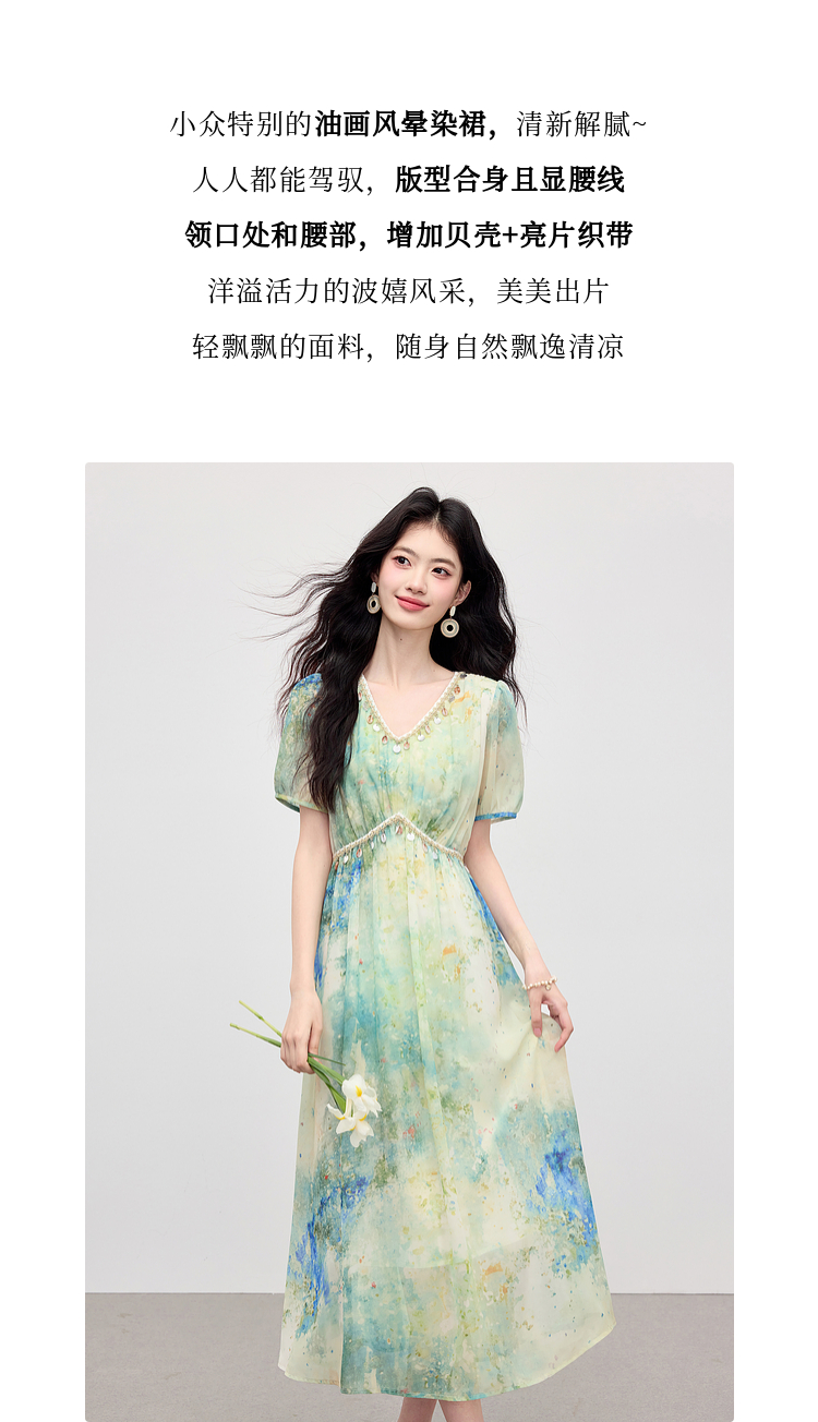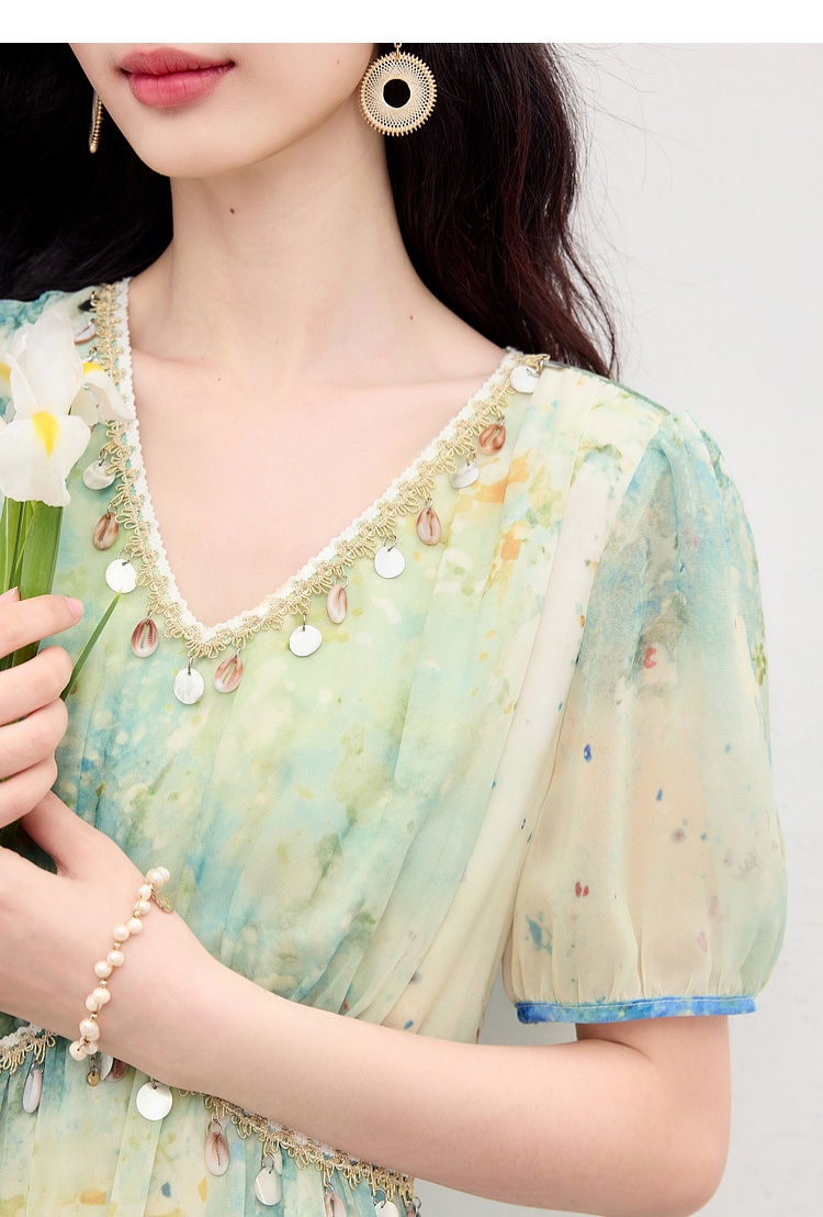 【07/23新品】熙世界艺术油画晕染连衣裙女夏季设计感贝壳V领海边度假印花裙子