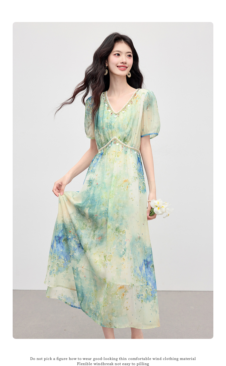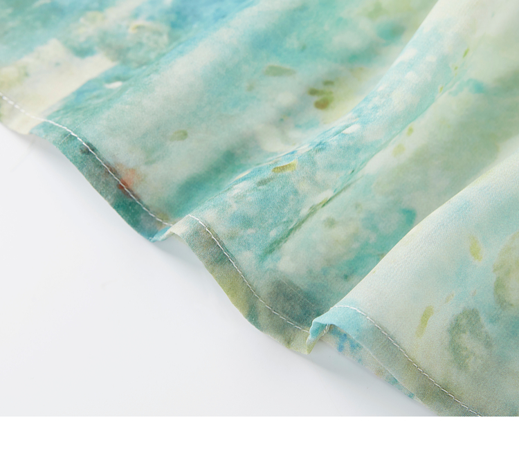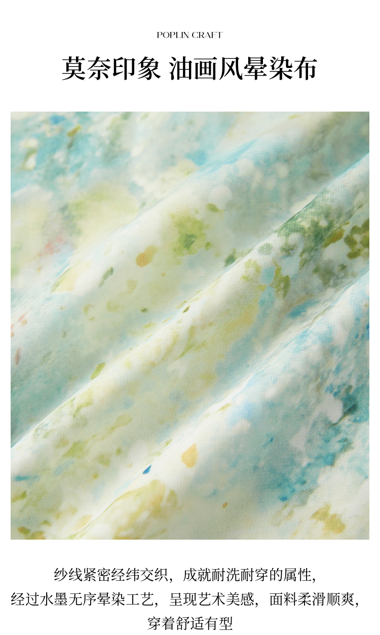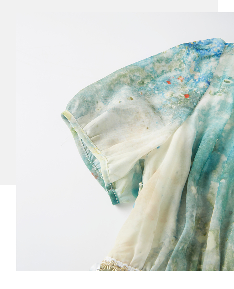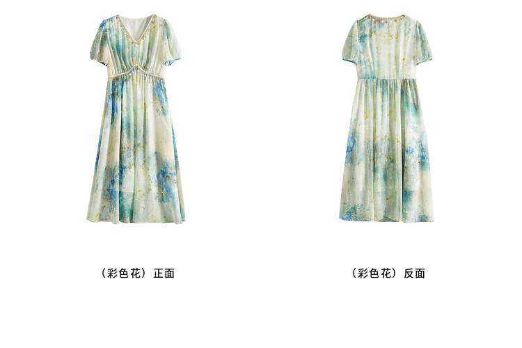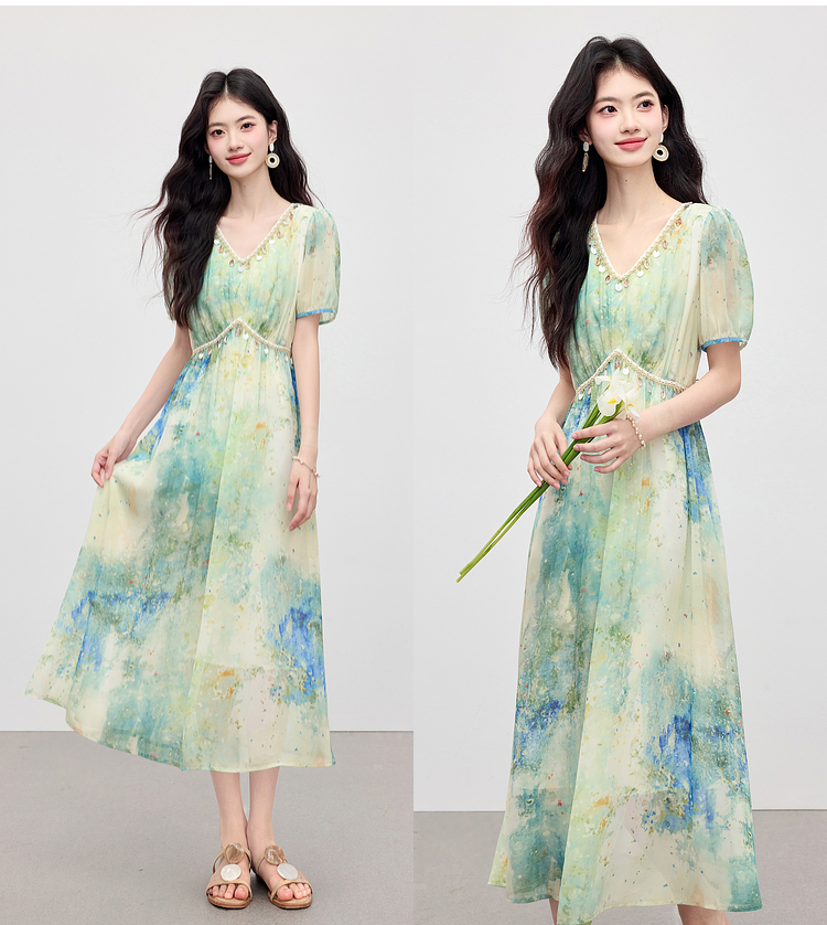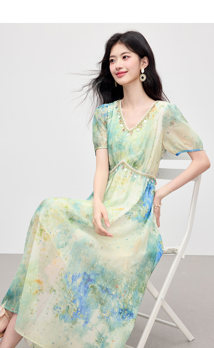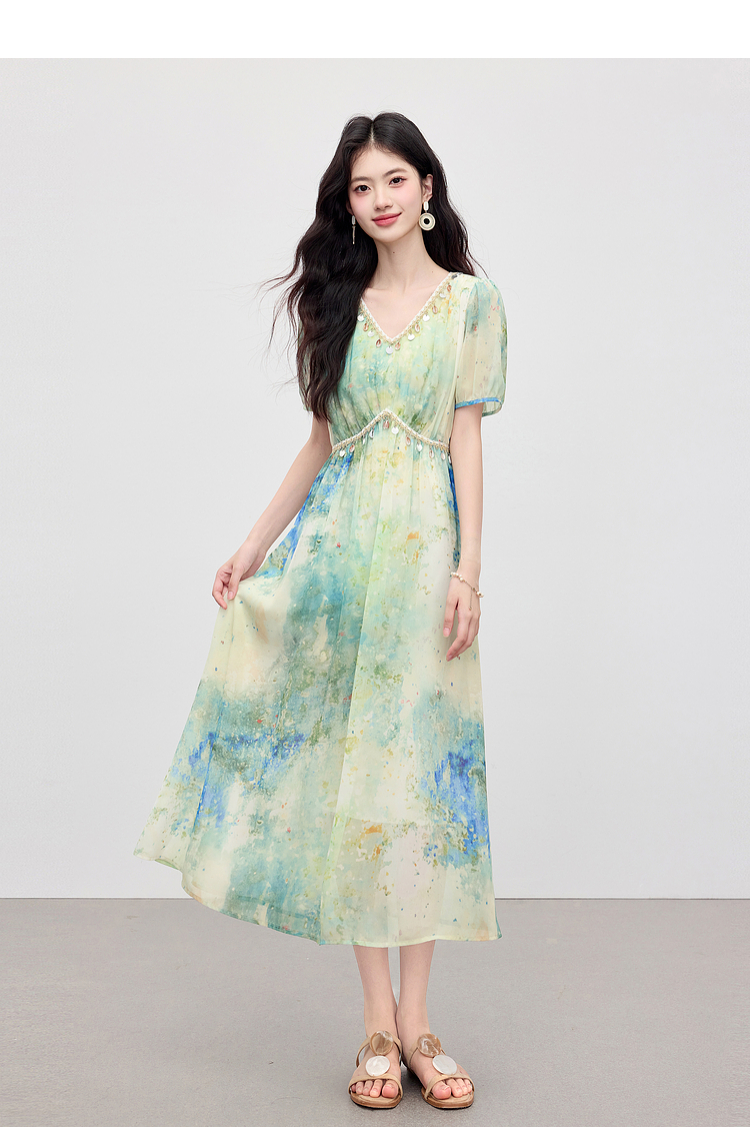 【07/23新品】熙世界艺术油画晕染连衣裙女夏季设计感贝壳V领海边度假印花裙子