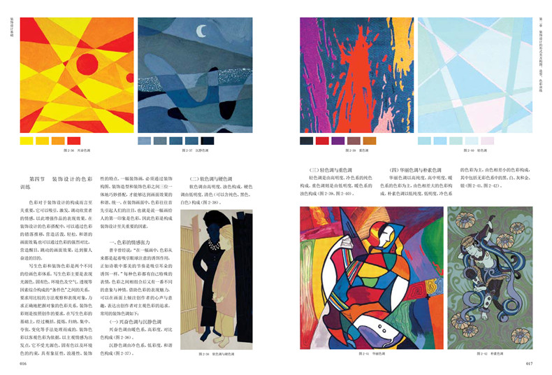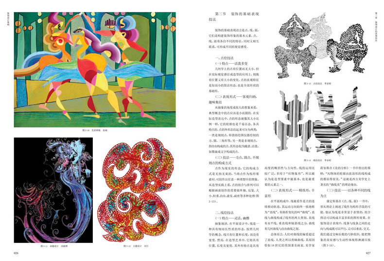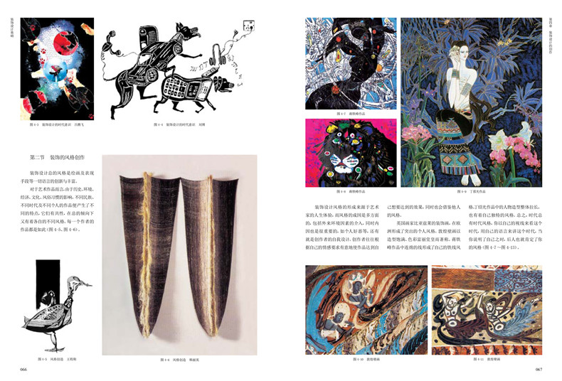《装饰设计基础》一书中的图例大都是在传统教学方式的基础上,根据装饰的要求,对黑白构图、色彩配置,特别是由自然型转换成装饰型的训练过程中,一丝不苟、反复推敲、认真实践的产物。不少作品几易画稿,细细读来,妙趣横生。其变形之大胆,夸张之适度,特别是对自然物象精、气、神的准确把握,令人叫绝;色彩之丰富、艳丽,色调之明快、协调,更让人喜爱。这既是一本课堂习作与创作完美结合的好书、又是一本以手工绘制为主的作品集锦。书中所提及的装饰艺术教学方法是当前艺术院校所应遵循的教学之路。