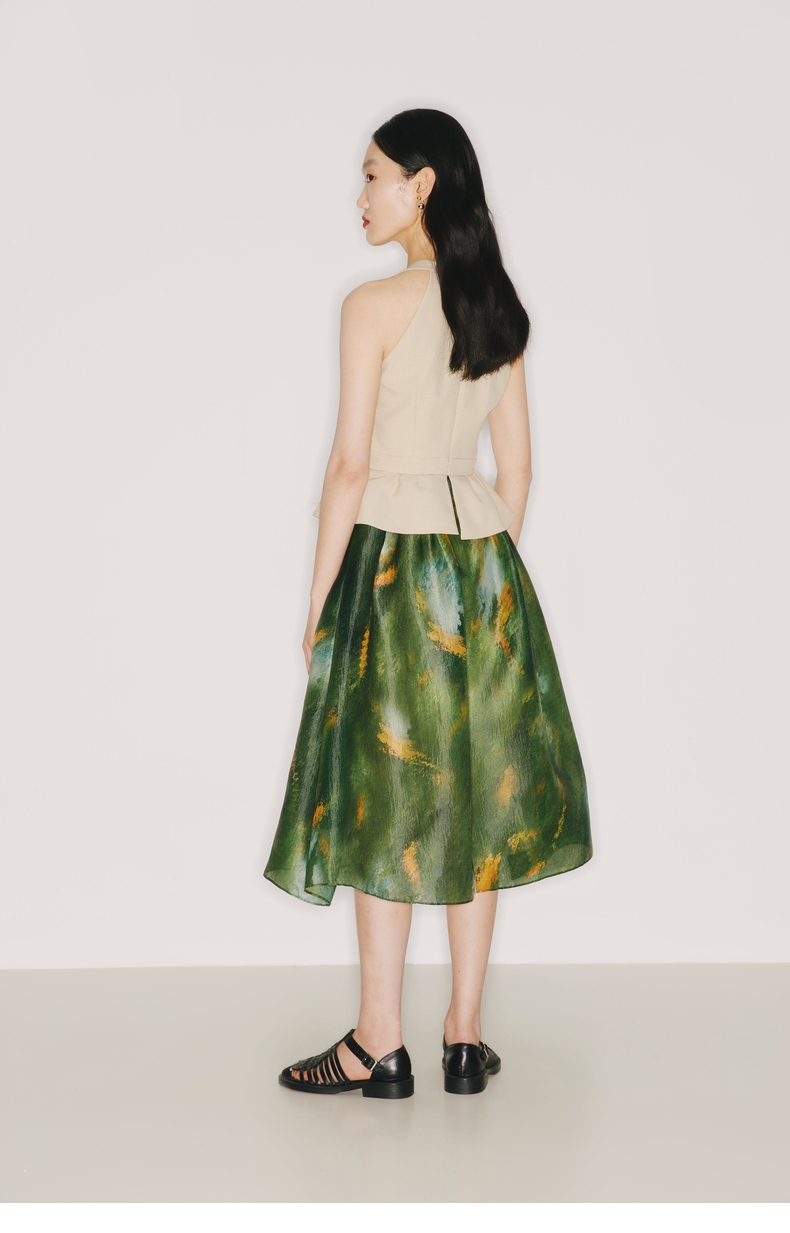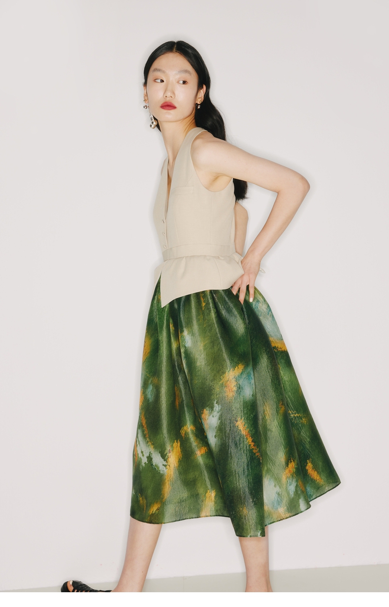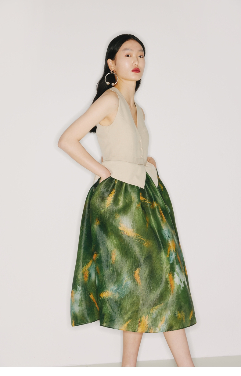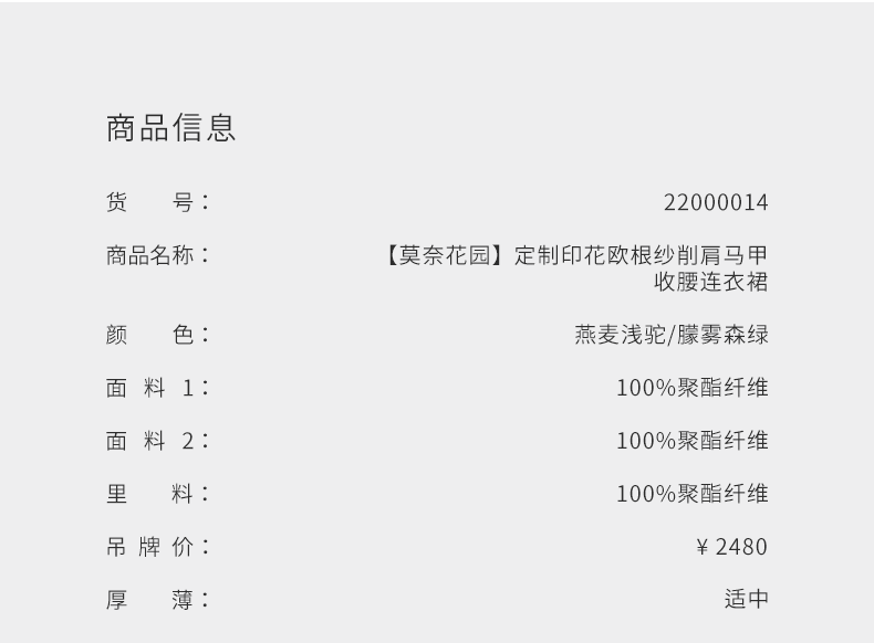 【莫奈花园】品牌定制印花欧根纱削肩马甲收腰连衣裙/22000014
